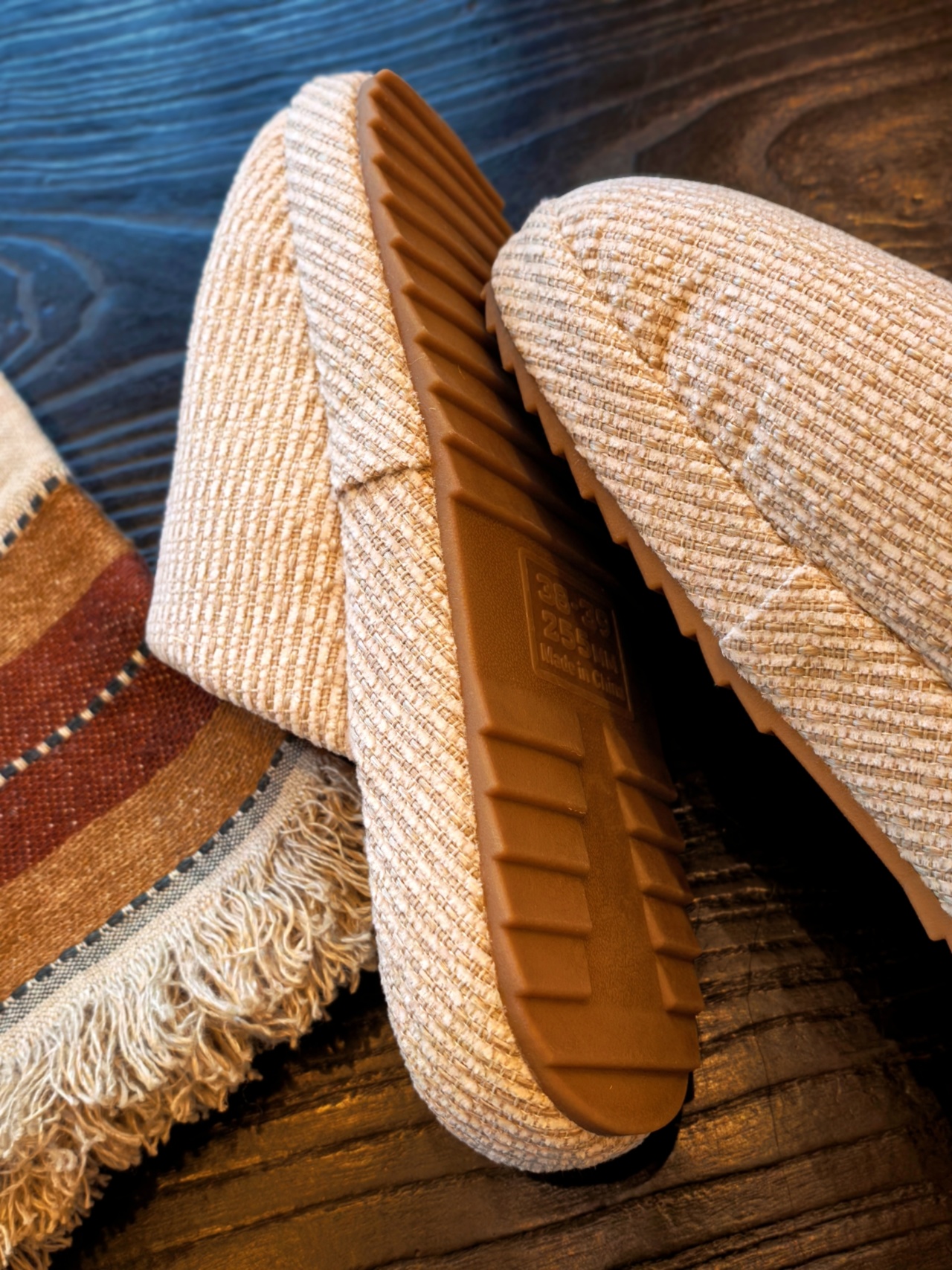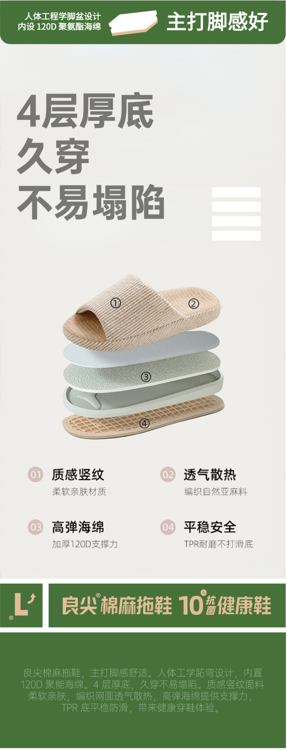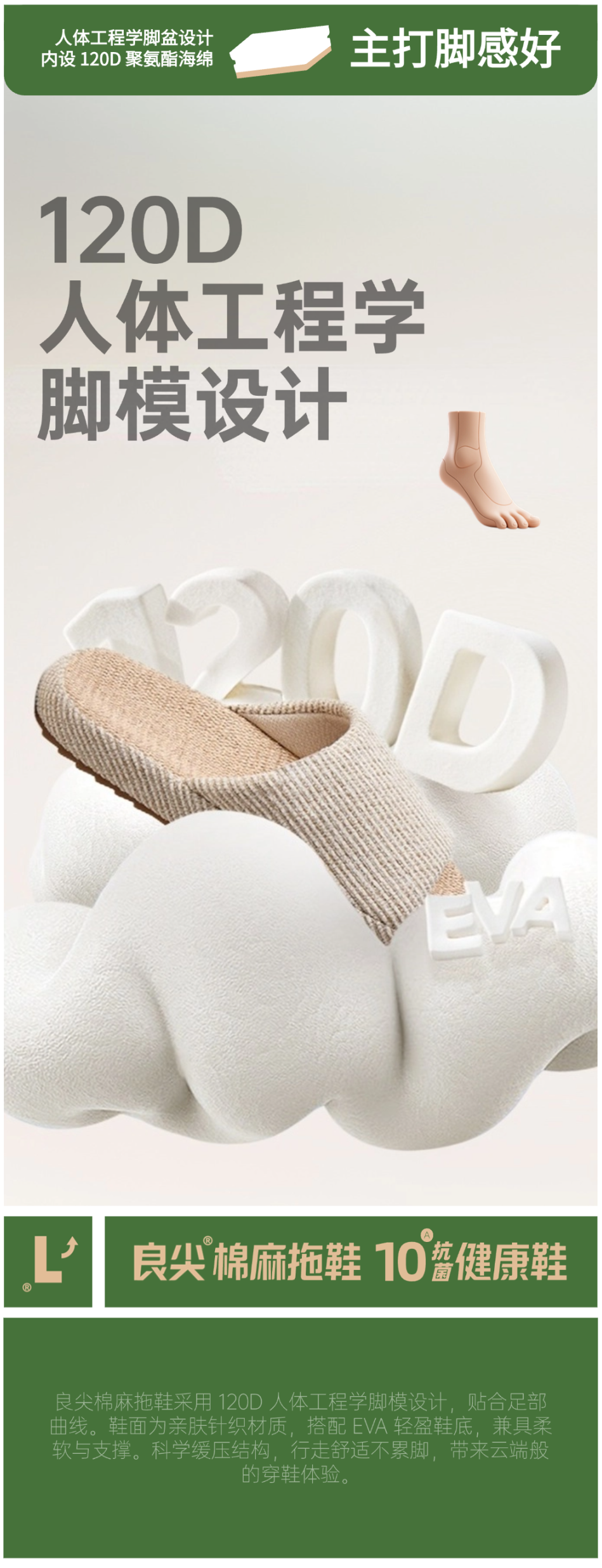 良尖棉麻拖鞋,脚踏面是亚麻混纺材质,摸着手感就很细腻,光脚踩更像是贴了层透气云朵,而且还做了混纺精编工艺,中和了纯亚麻的粗糙,只有轻柔的按摩感。关键是透气吸湿性很强,搭配米通金丝布内里,上万个小孔能排走脚面的热气和汗气——夏天不闷、冬天不臭、回南天不黏脚,一年穿到底,省心又省钱!
