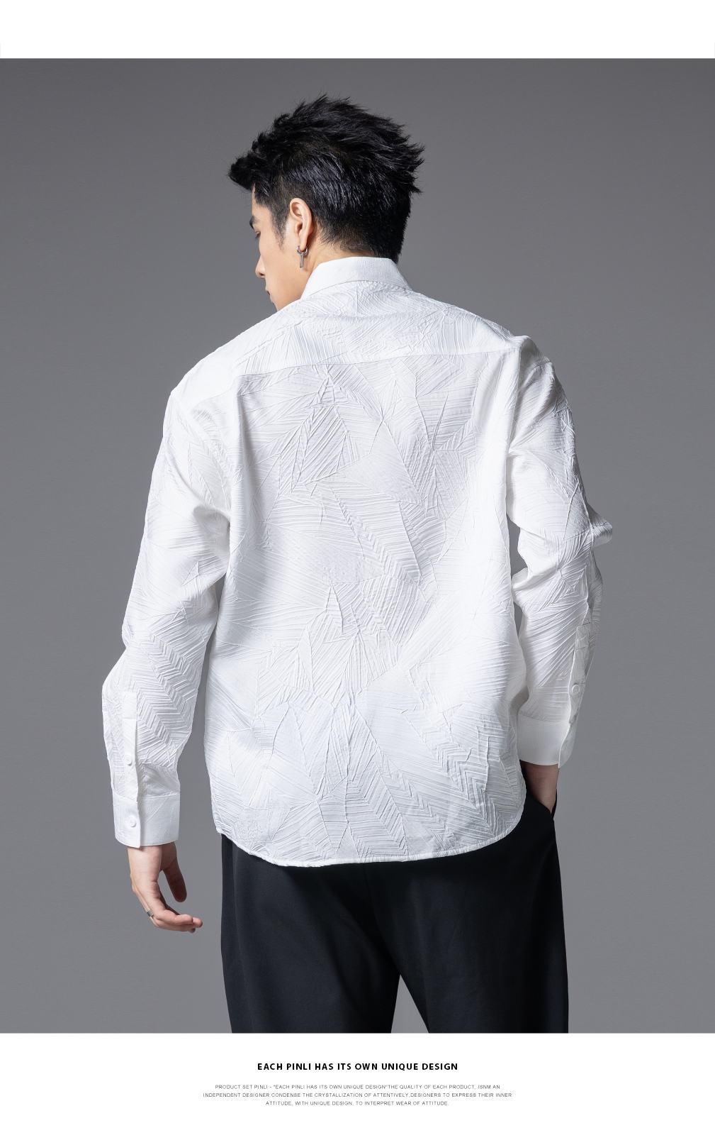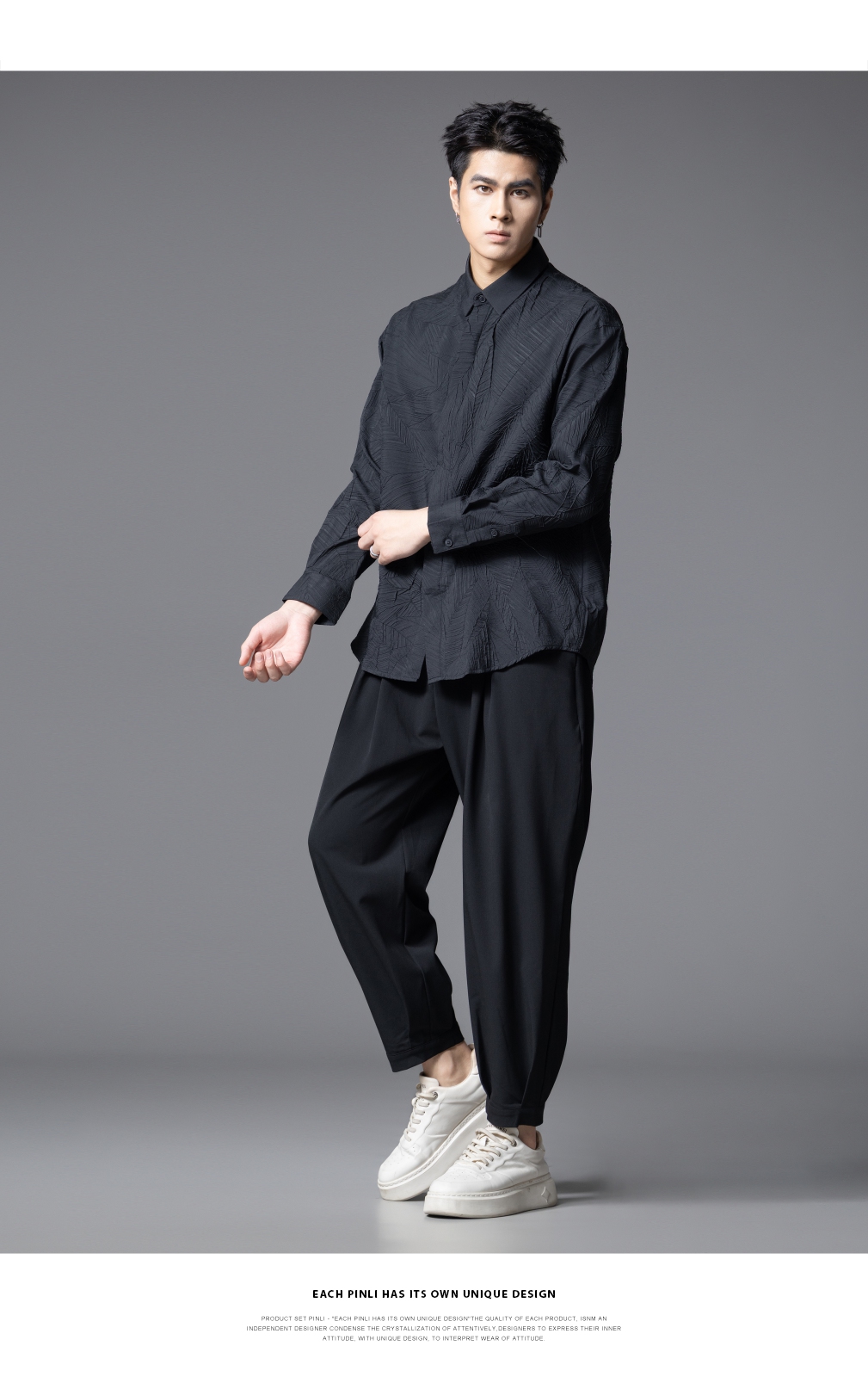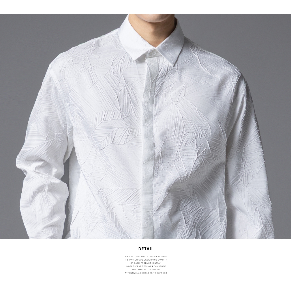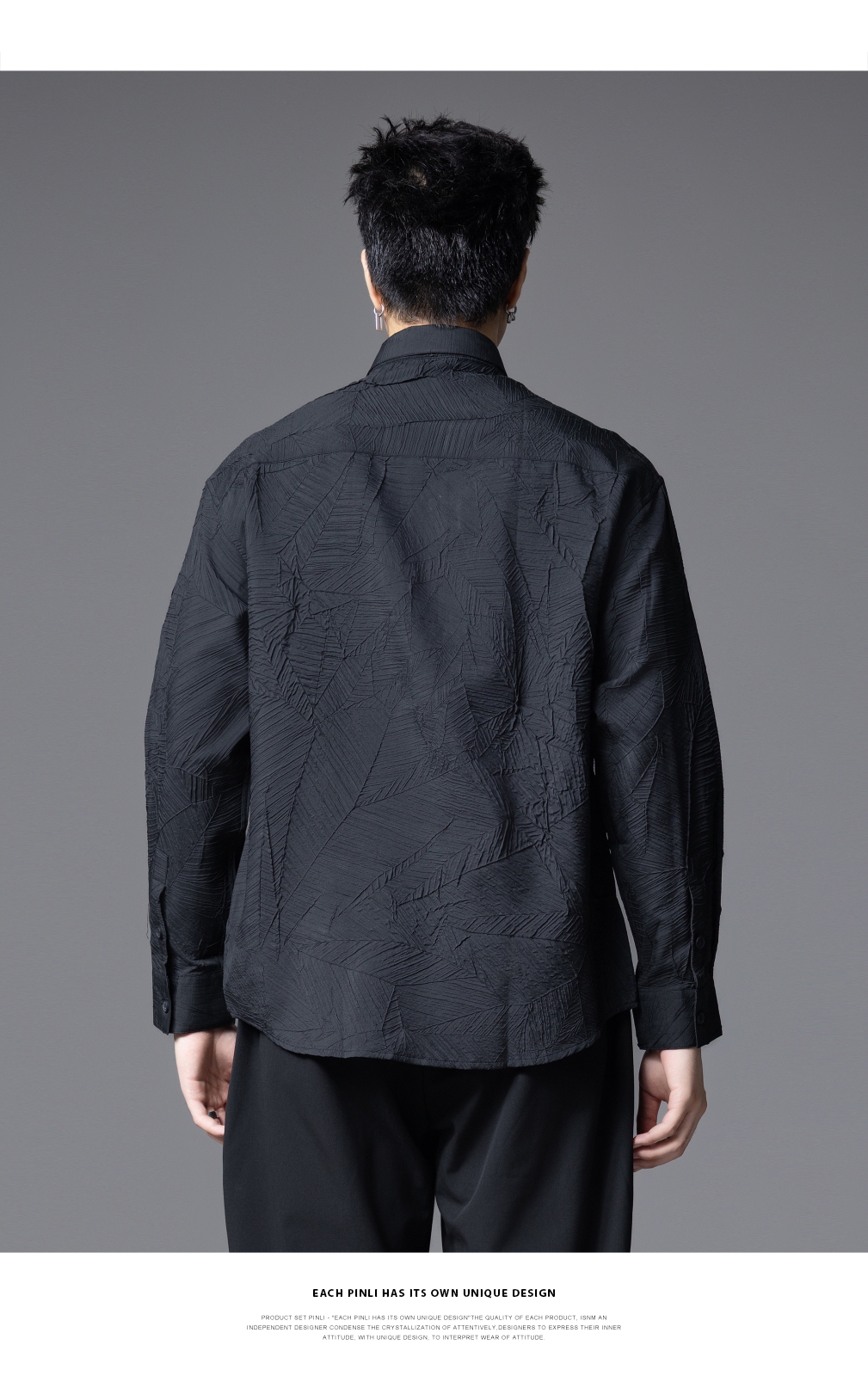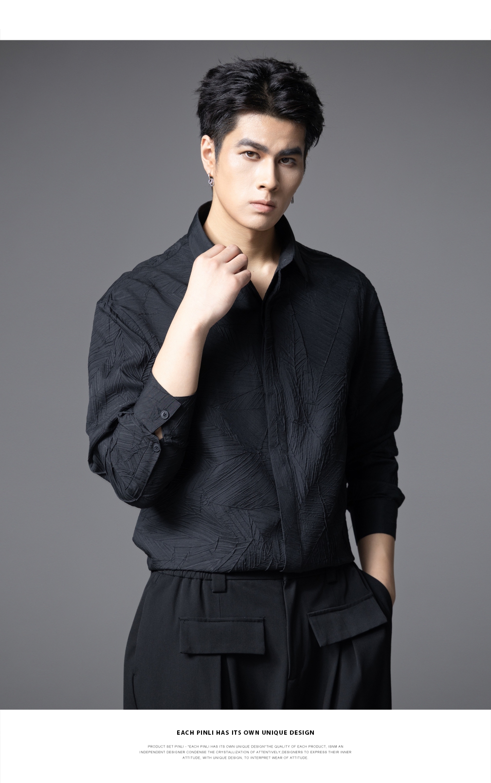 PINLI品立春季新品褶皱长袖衬衫男士纯色肌理感潮牌休闲衬衣GD253113037