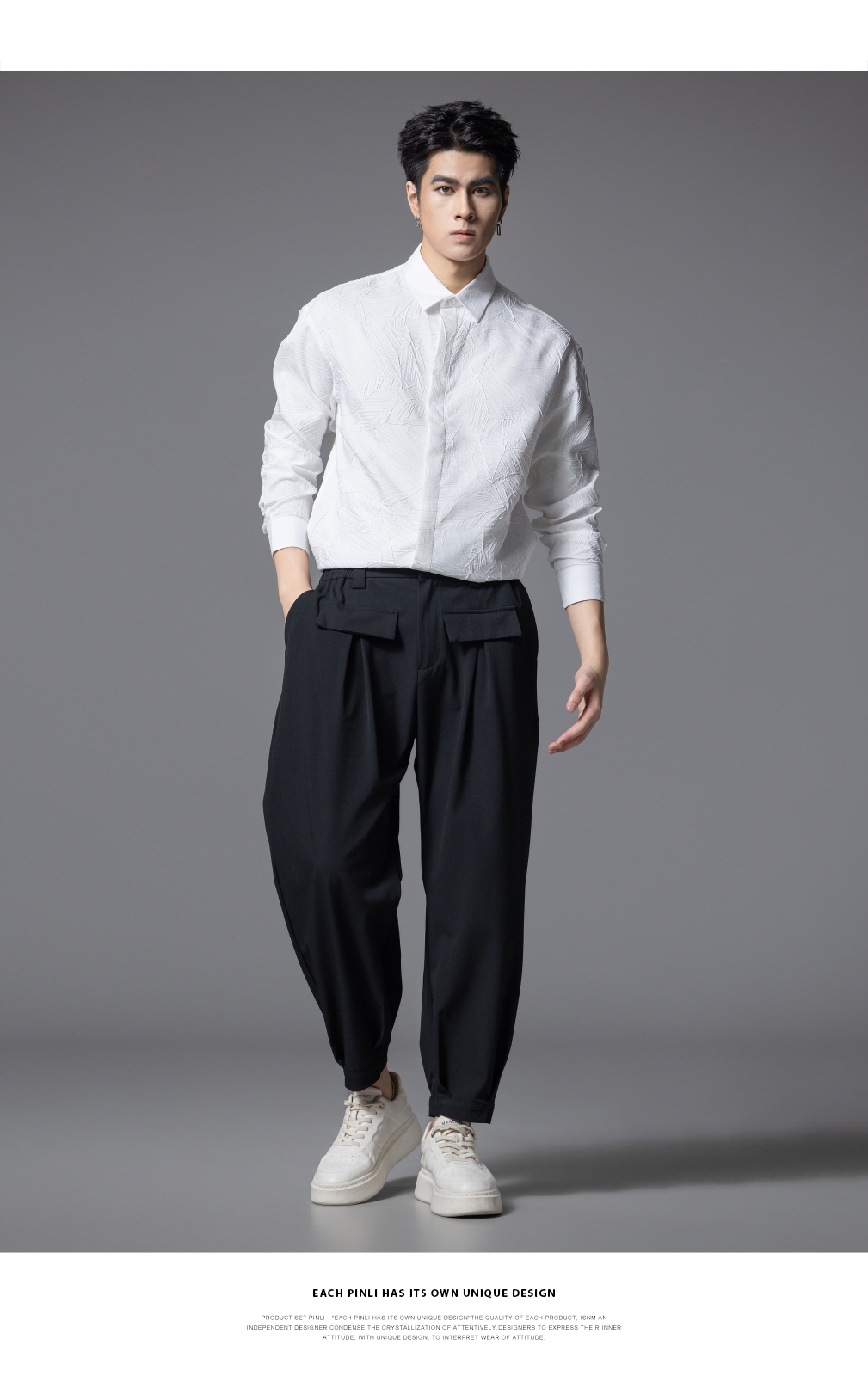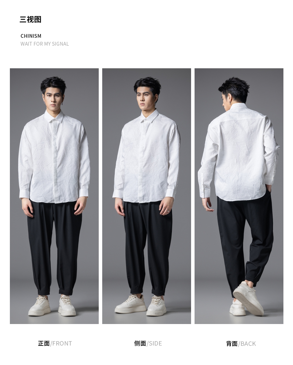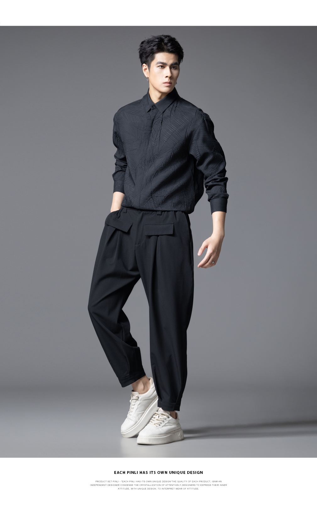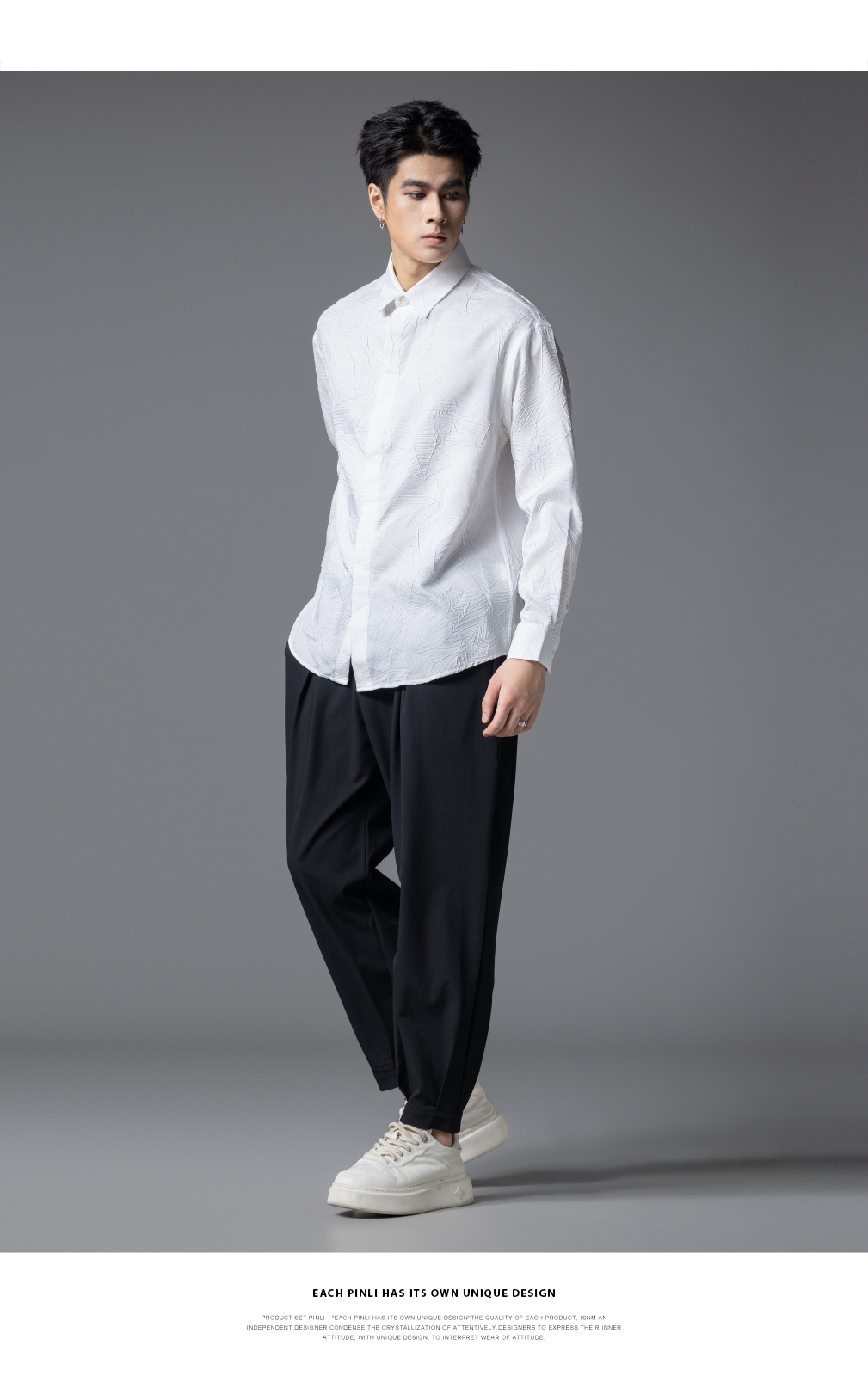 PINLI品立春季新品褶皱长袖衬衫男士纯色肌理感潮牌休闲衬衣GD253113037