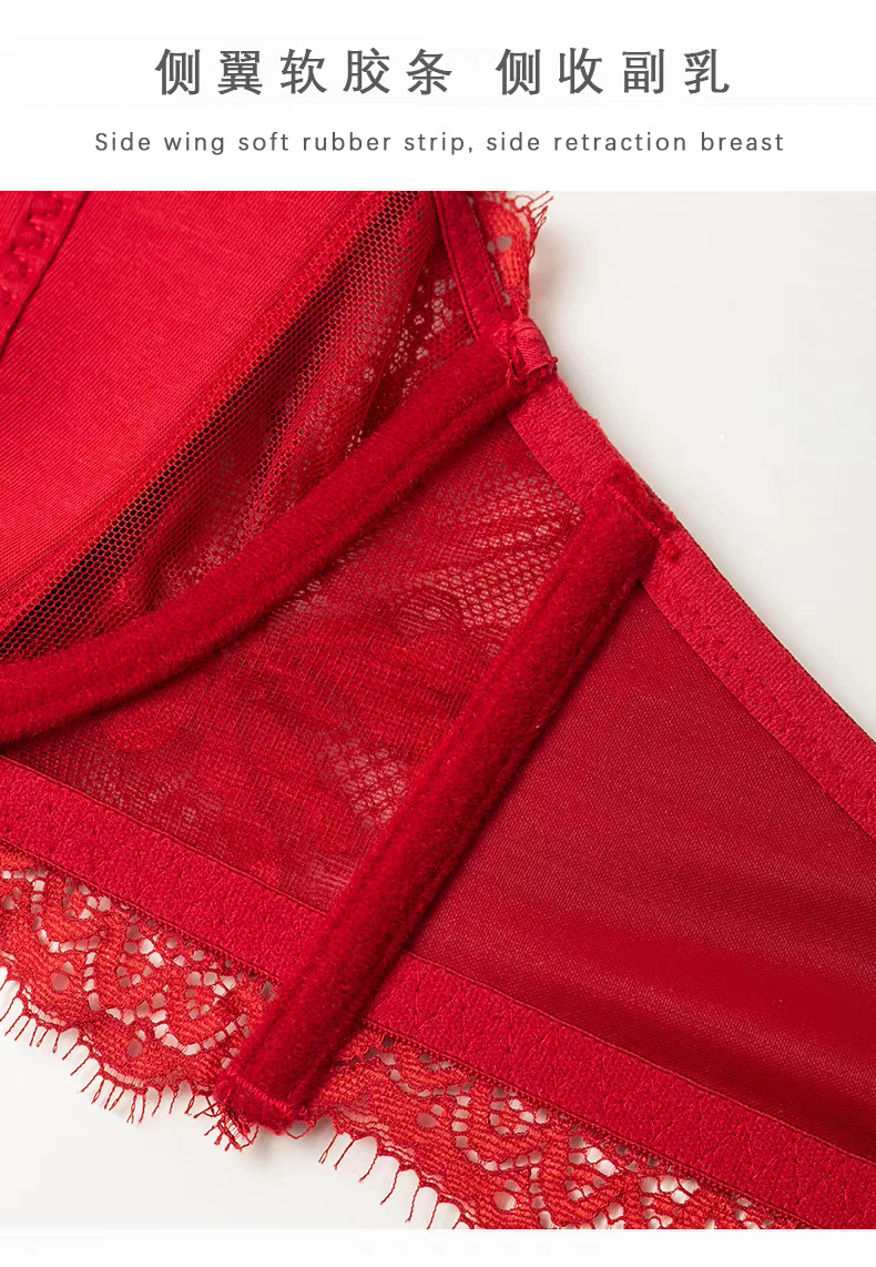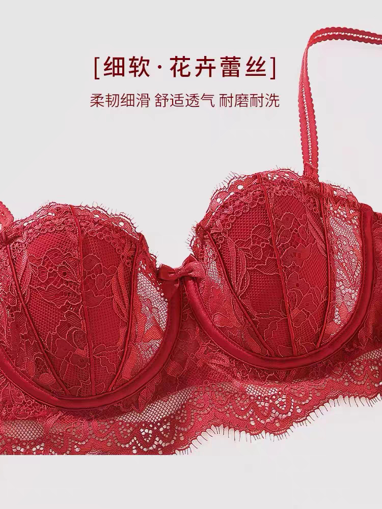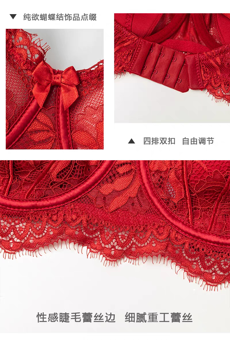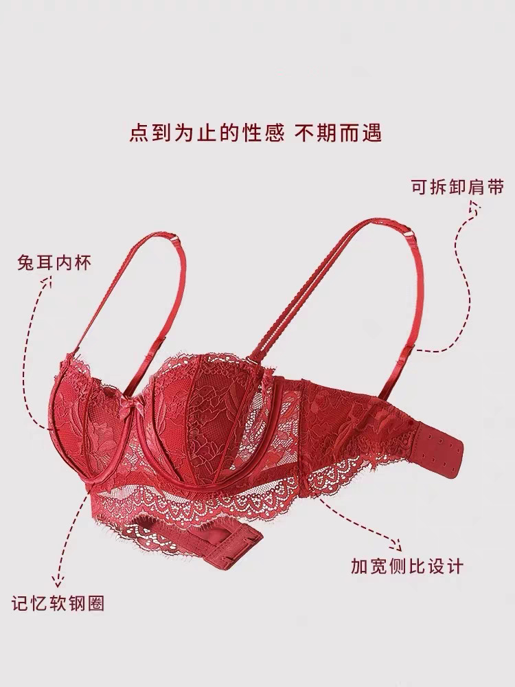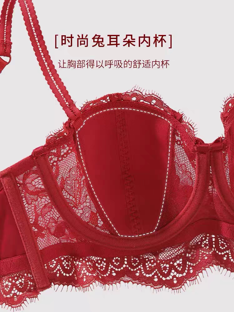 【本命年❗️蕾丝红色内衣套装】细软花卉蕾丝,时尚兔耳朵内杯,软钢圈底围有力承托,大胸显小侧翼软胶,收副乳结婚新娘红色蕾丝文胸秋冬季QQ