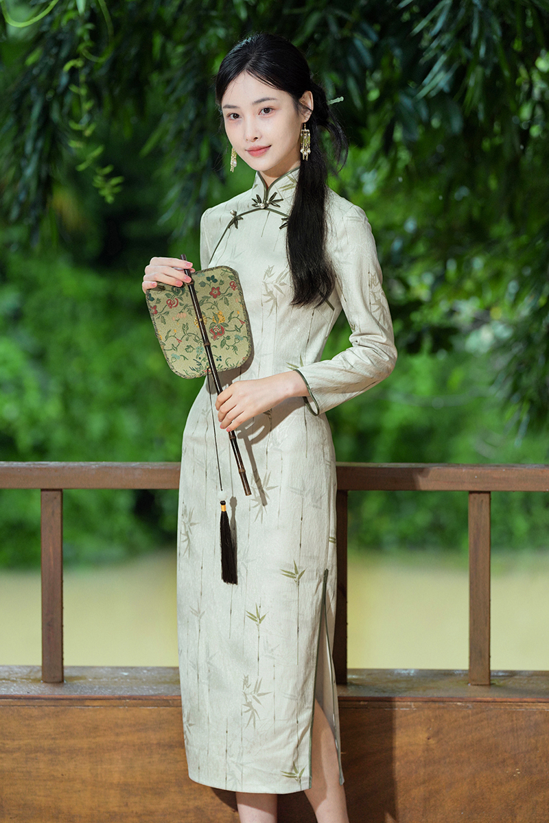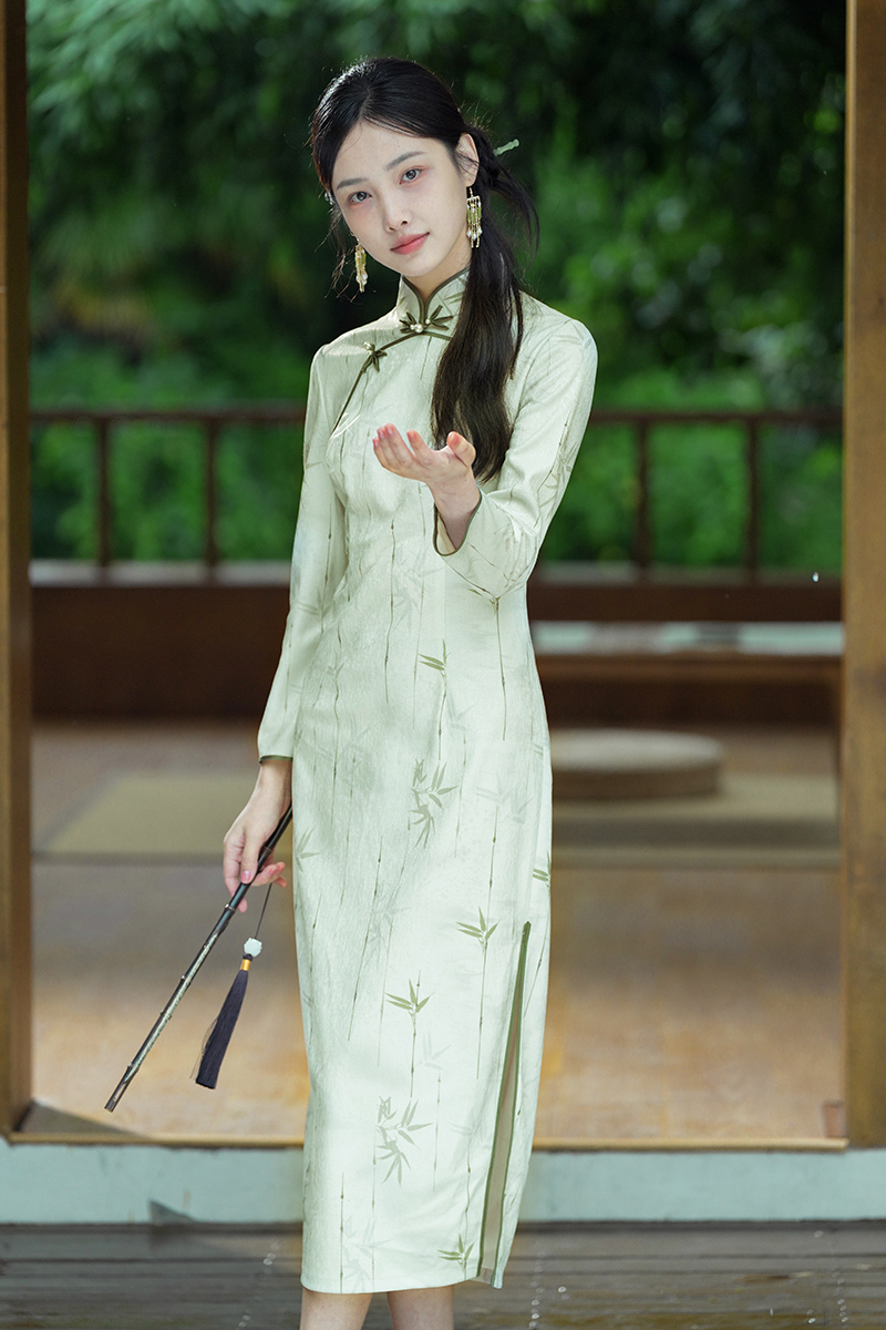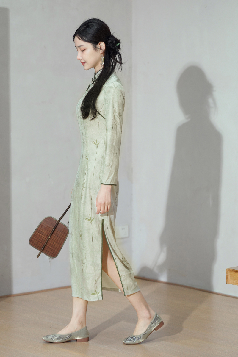 青竹旗袍宛如一幅灵动的画卷,将东方之美诠释得淋漓尽致。每一步的走动,都像是竹子在微风中轻轻摇曳,优雅而自然。