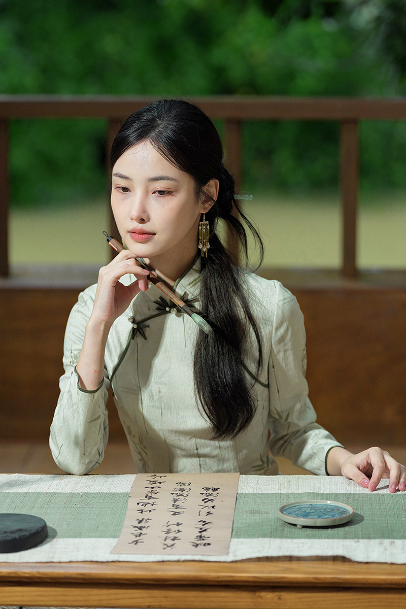 日暮西沉,清风徐来,溪水潺潺,竹影摇曳,旗袍美人于园中亭下的石凳歇息,品茗听风,或拾花观雨,哪里还有比这更清雅的滋味呢?
