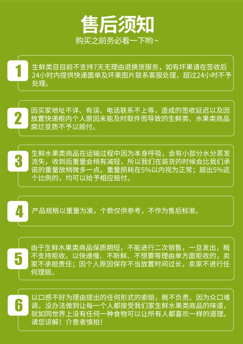 1.坏果10颗以内不售后,坏果超10颗每一颗赔偿0.3元