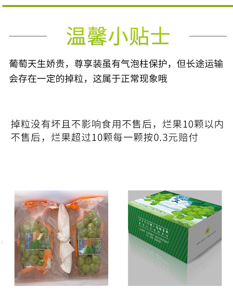 2.串装葡萄掉粒为正常现象,掉粒里没有坏果、不影响食用的不售后哦
