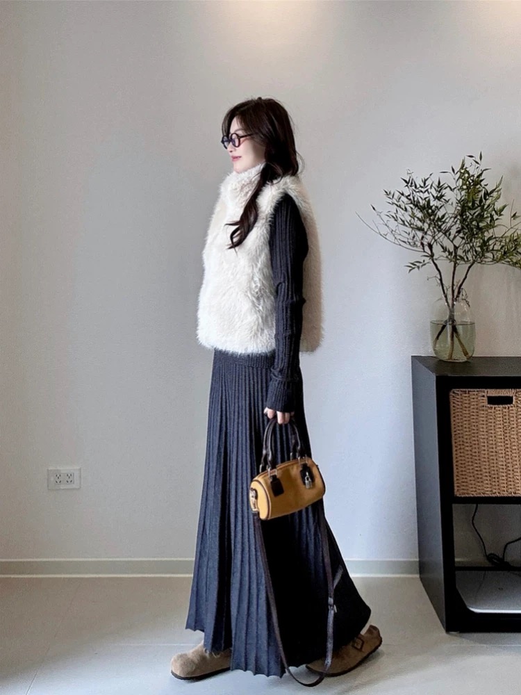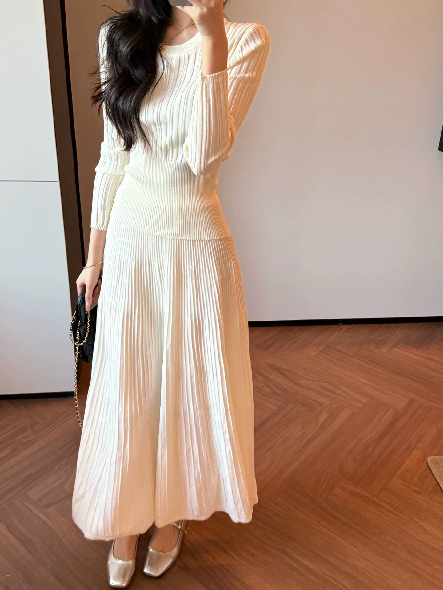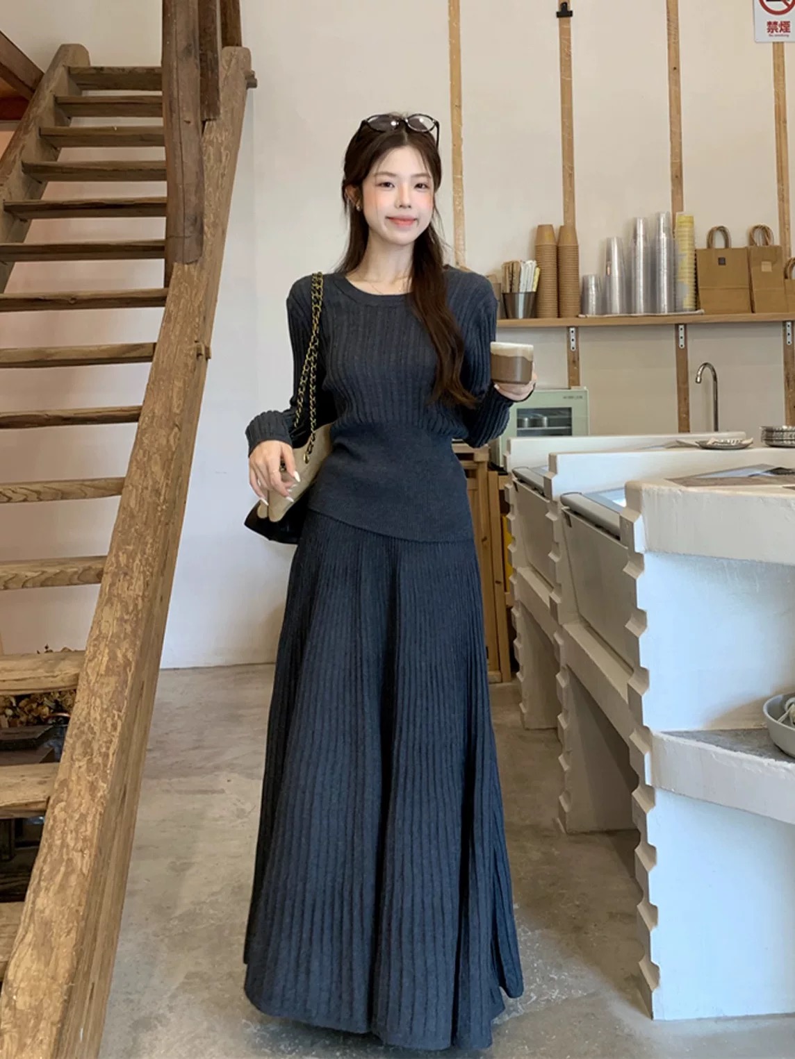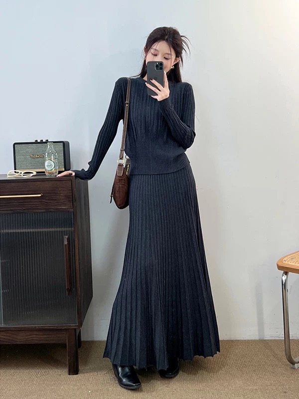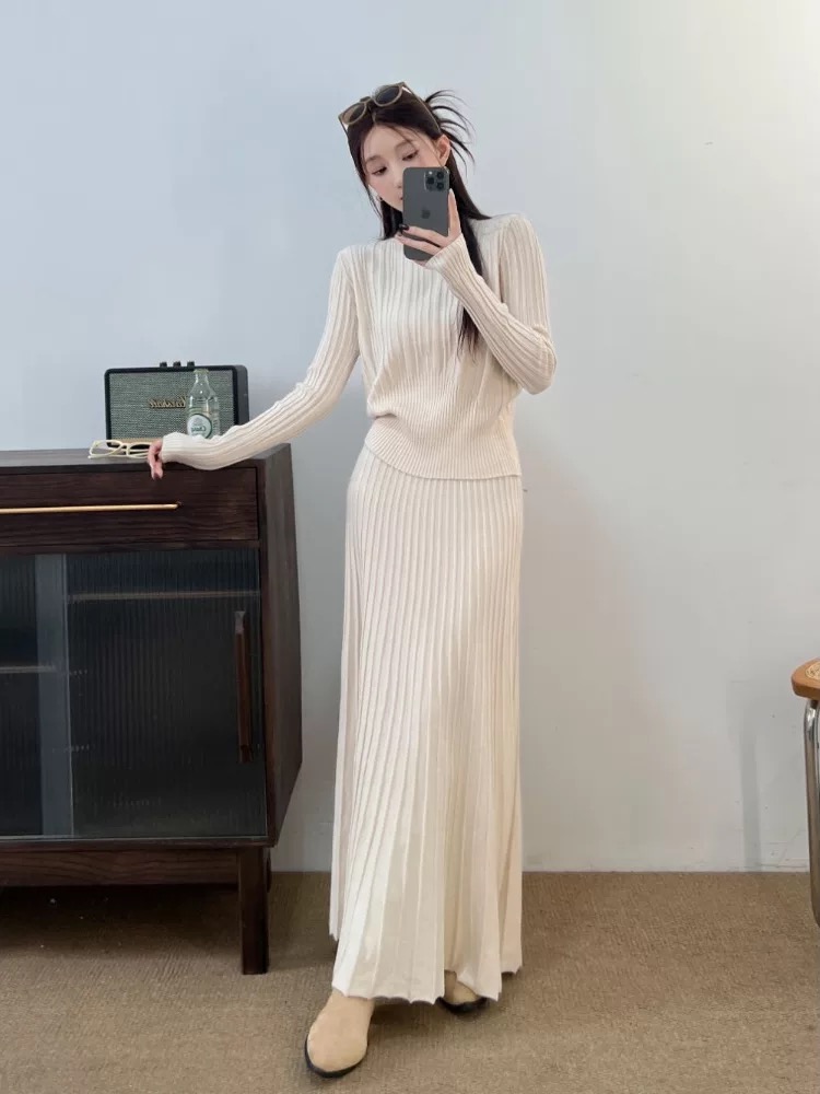 2026新款来袭!! 气质凛冬 一套搞定【梦惠妮 法式针织长裙套装】收腰设计 新颖版型 显瘦百搭 告别穿搭烦恼 百褶长裙 针织衫 时尚套装 显身材#M663