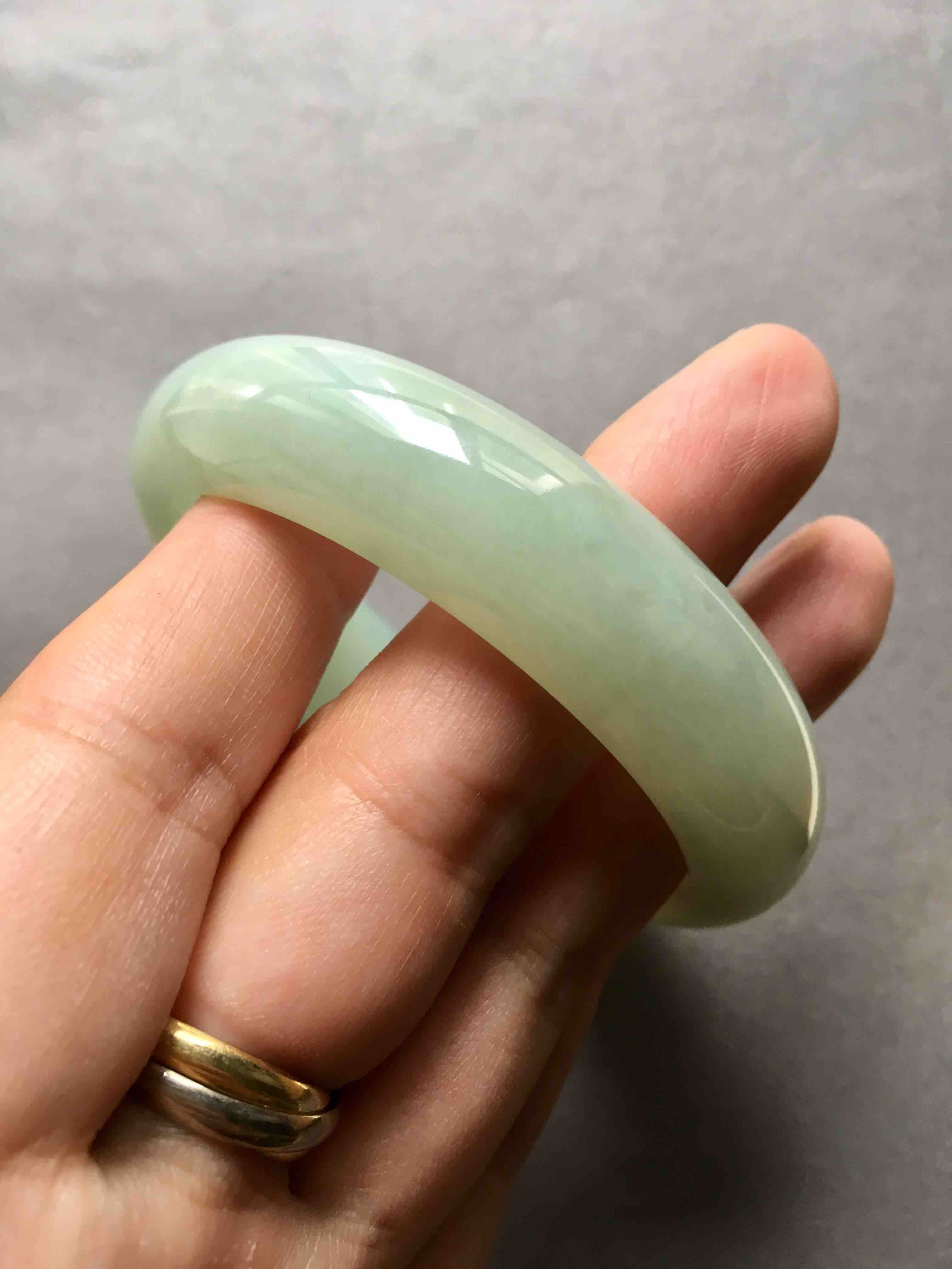 糯种淡晴水翡翠手镯5,种水细腻莹润,几乎感觉不到纤维感, 特别润,淡淡的绿色很优雅,内径56mm,宽15mm,厚7.9mm。尺寸标准的扁镯,上手端庄大方,最传统的手镯的味道,适合55到57手寸的朋友佩戴,高性价比