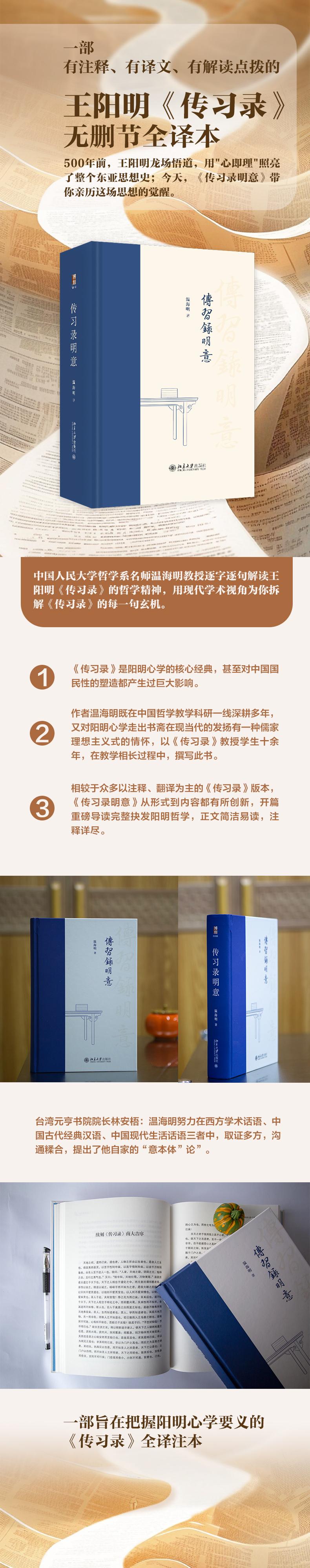《传习录》是一代大儒王阳明最重要、最有影响力的著作,也是阳明哲学思想的精华。《传习录明意》相较于众多以注释、翻译为主的《传习录》版本从形式到内容都有所创新,是一部旨在把握阳明心学要义的《传习录》全译注本。书中对必要的专业术语加以注释,以脚注方式介绍人名、引文和哲学术语的由来,必要的考证和论争说明,则引用相关原典及学术性著作,书末附有比较详尽的参考文献。导论部分介绍阳明哲学,详述王阳明以易为本、当下朗现遍在的心学思想(意哲学)。正文部分对王阳明《传习录》各卷进行全文逐字逐句的释读,并且随文夹以笺注,点出阳明心学哲理,认为心学本于易学,心学就是易意学。作者提出,王阳明以“心天之意”(心天之易)即心与天相感通之意贯通心天二者,据此可以推进心天之意的哲学建构,实现从心本体过渡到意本体的哲学范式转变,进而完成意本论哲学的体系性建构。