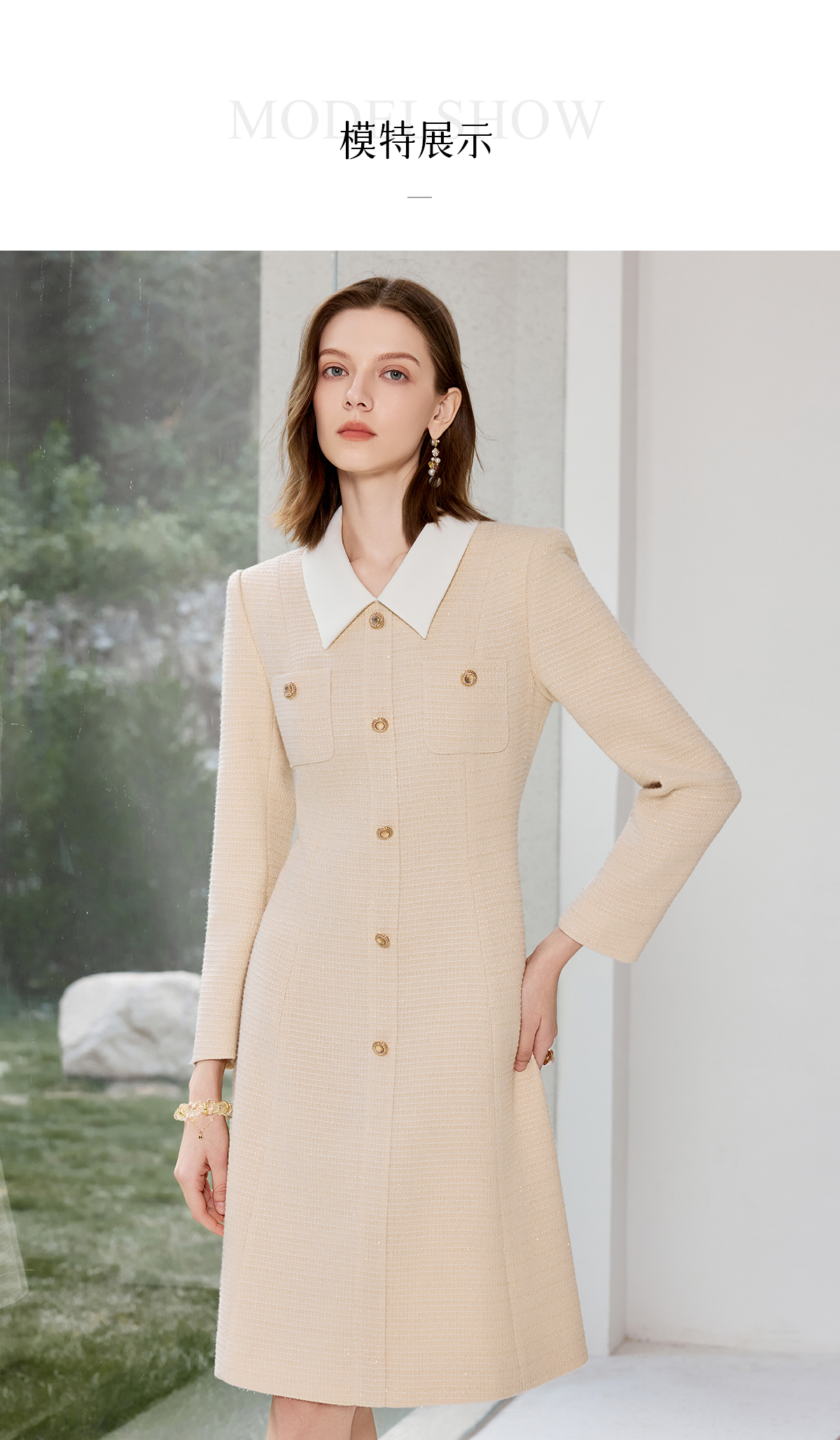 AD气质翻领粗花呢连衣裙女2025秋冬新款老钱风拼接长袖小香A字裙