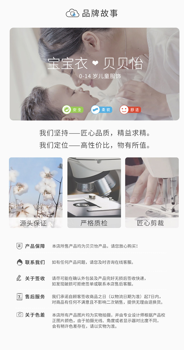 - 贝贝怡专注0-6岁婴幼儿服饰,坚持安全、柔软、舒适的产品理念,为千万中国家庭提供超高品质、安全可靠的婴幼儿服饰产品,妈妈放心,宝宝开心!