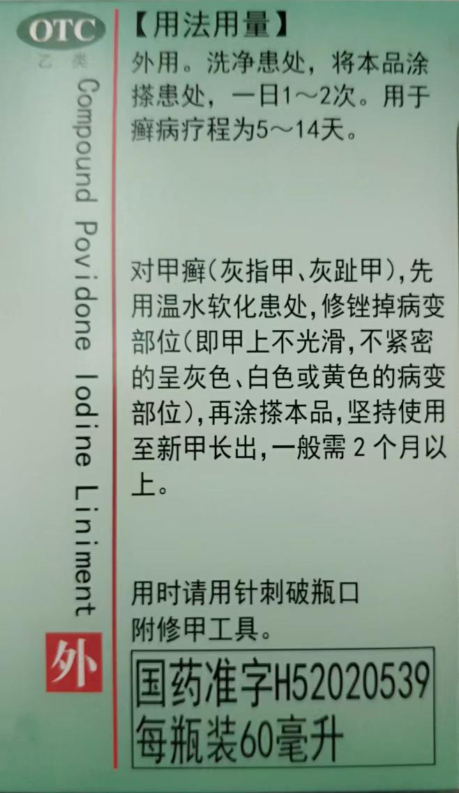 【用法用量】外用。对甲癣,先用温水软化患处,修锉掉病变部位,再涂搽复方聚维酮碘搽剂,一日2次,其他外用,洗净患处,将本品涂搽患处,一日一次。