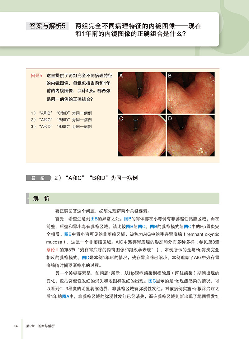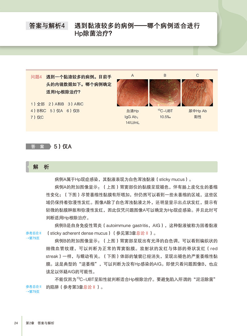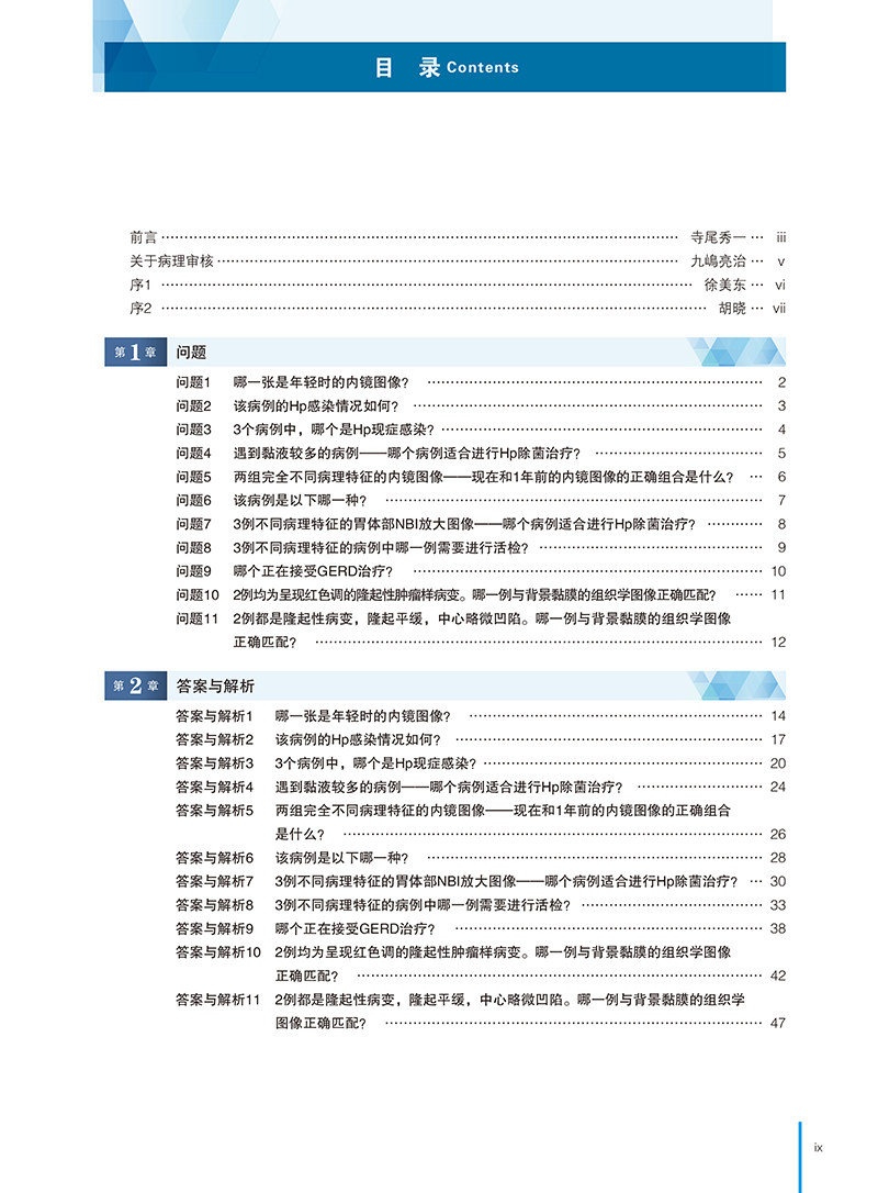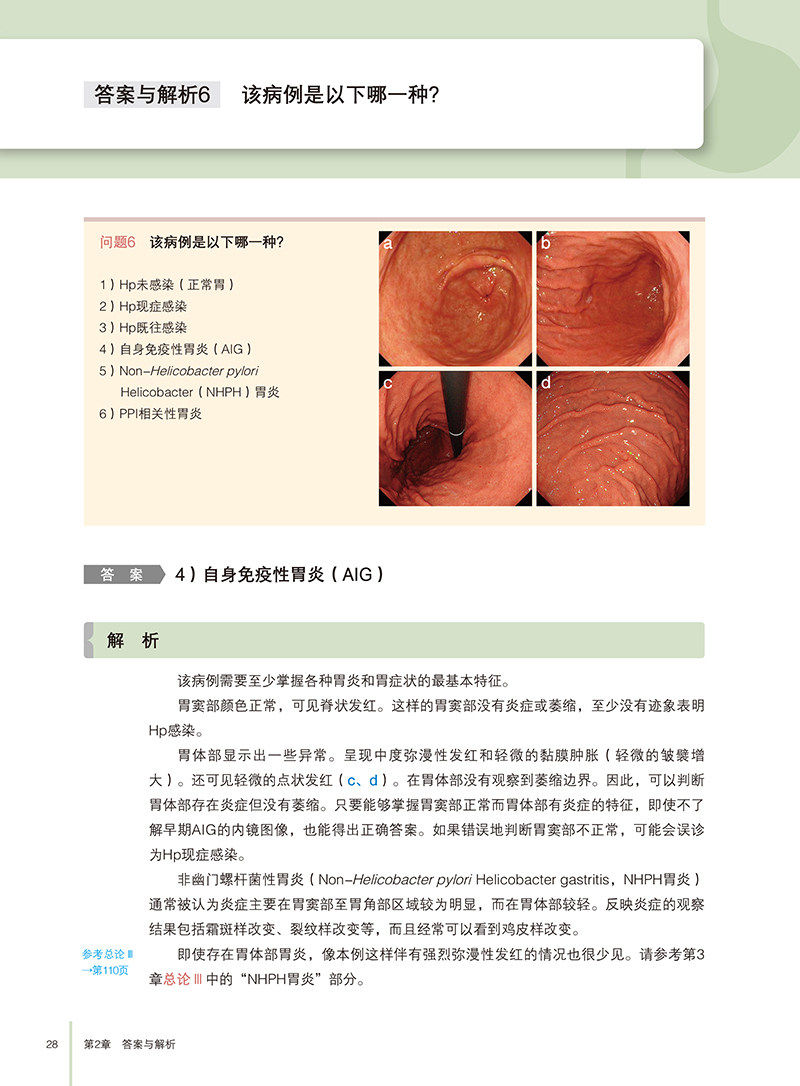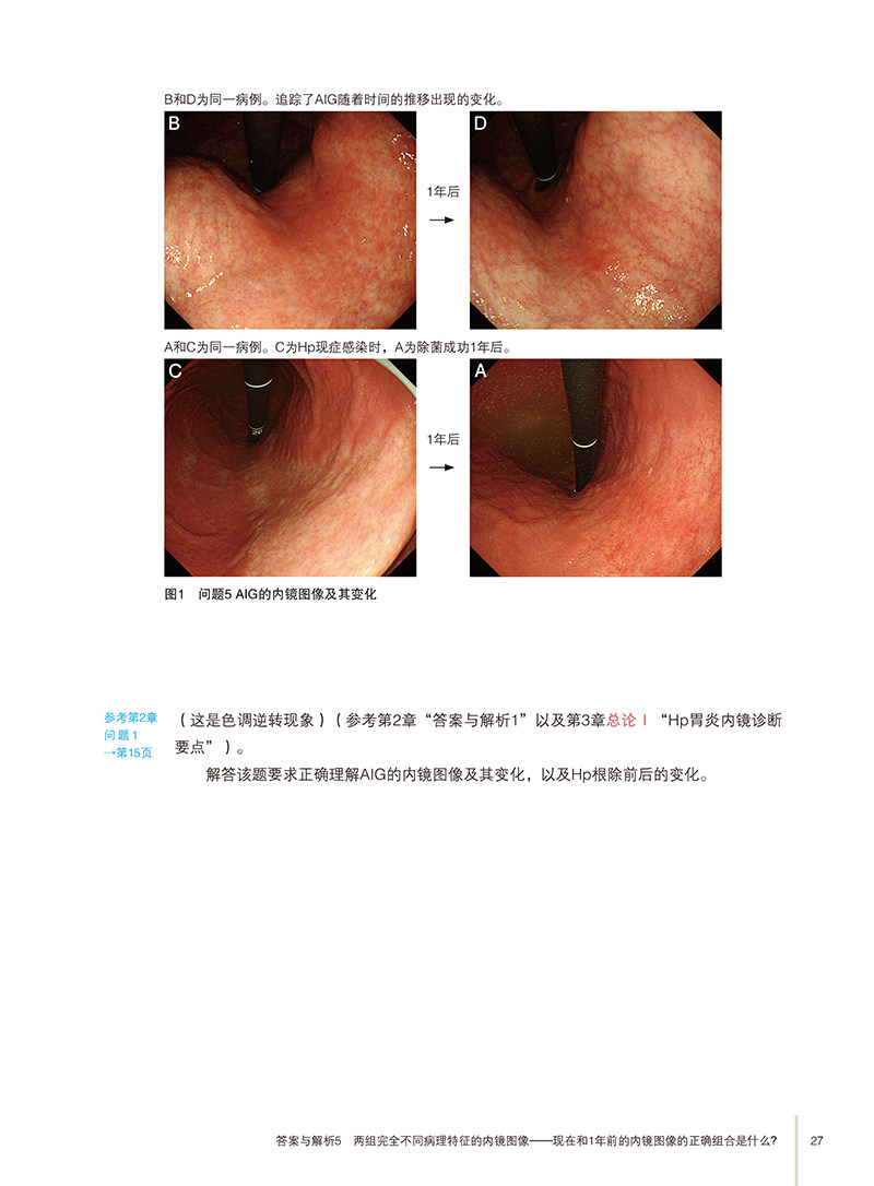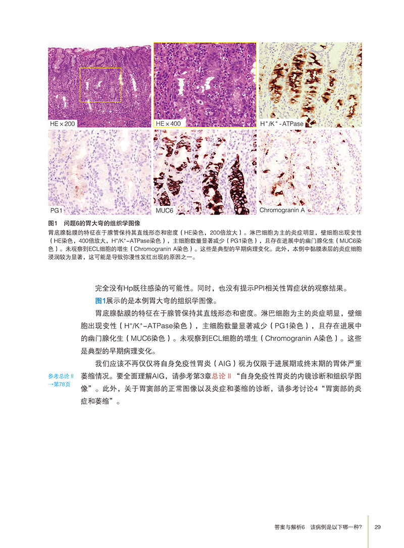 全书分为三个主要部分:问题、答案与解析、总论。问题部分通过11个实际病例,引导读者思考胃炎诊断的关键点;答案与解析部分则逐一解答问题,深入分析病例特征及诊断依据;总论部分则从Hp胃炎的内镜诊断要点、AIG的组织学特征、NHPH的鉴别诊断,以及PPI相关性胃病等方面展开详细论述,结合病理学观察,探讨了胃炎的多维度表现及其成因。