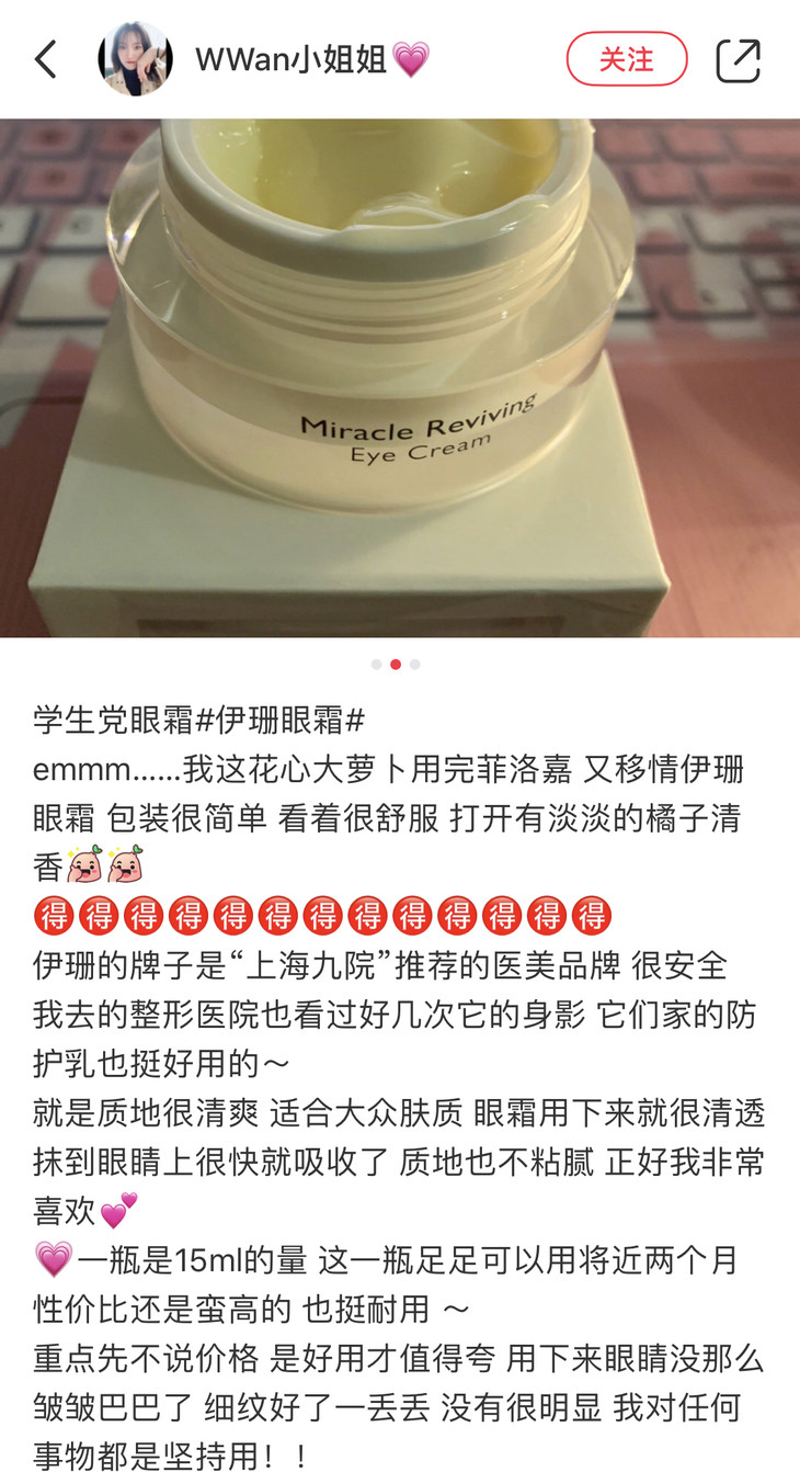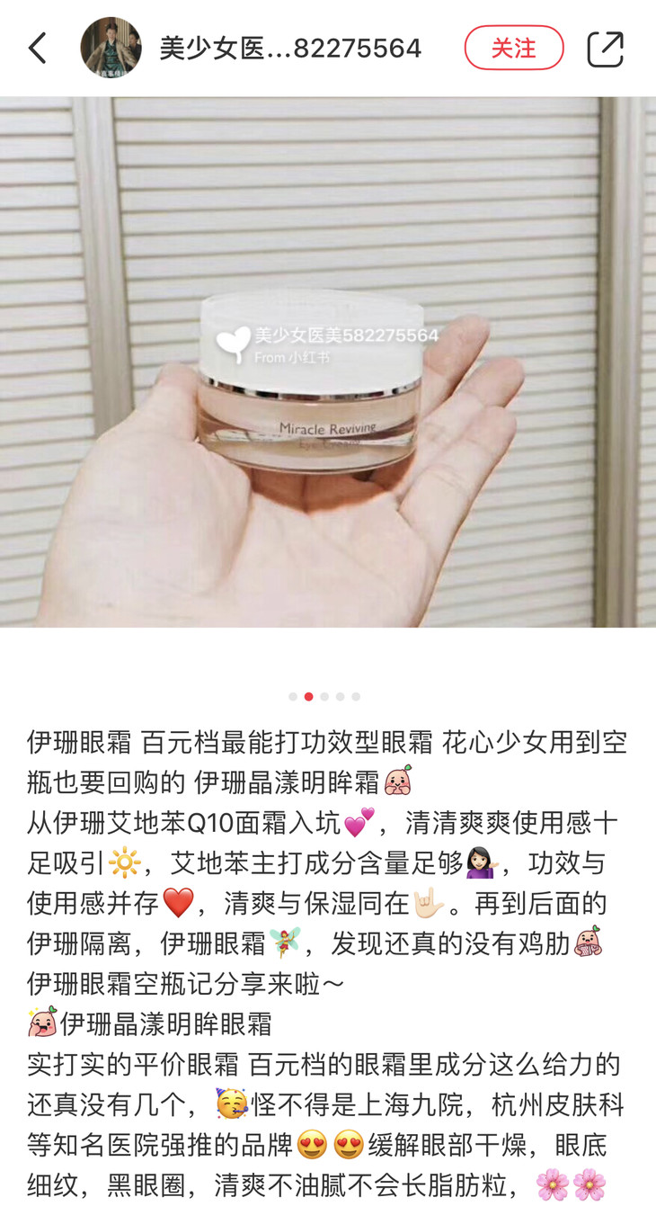 我发现医美产品会基本集中在面膜、洁面、水、精华和面霜上,真的蛮少有单独出眼霜的,但实际上皮肤出问题时眼睛部位反而是影响很大的,非常需要了哦!