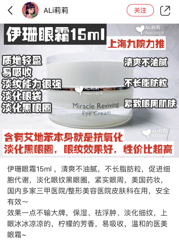 伊珊这款眼霜中也添加了Q10面霜里的核心成分,有着抗yang化功能的艾地苯,能结合细胞凝水因子,让眼周肌肤水润有弹性。而这款眼霜中另一个成分——低分子粘多糖肝脂有着强大的cu进钿胞更新的功效,能够dan化黑眼圈,减退浮仲。