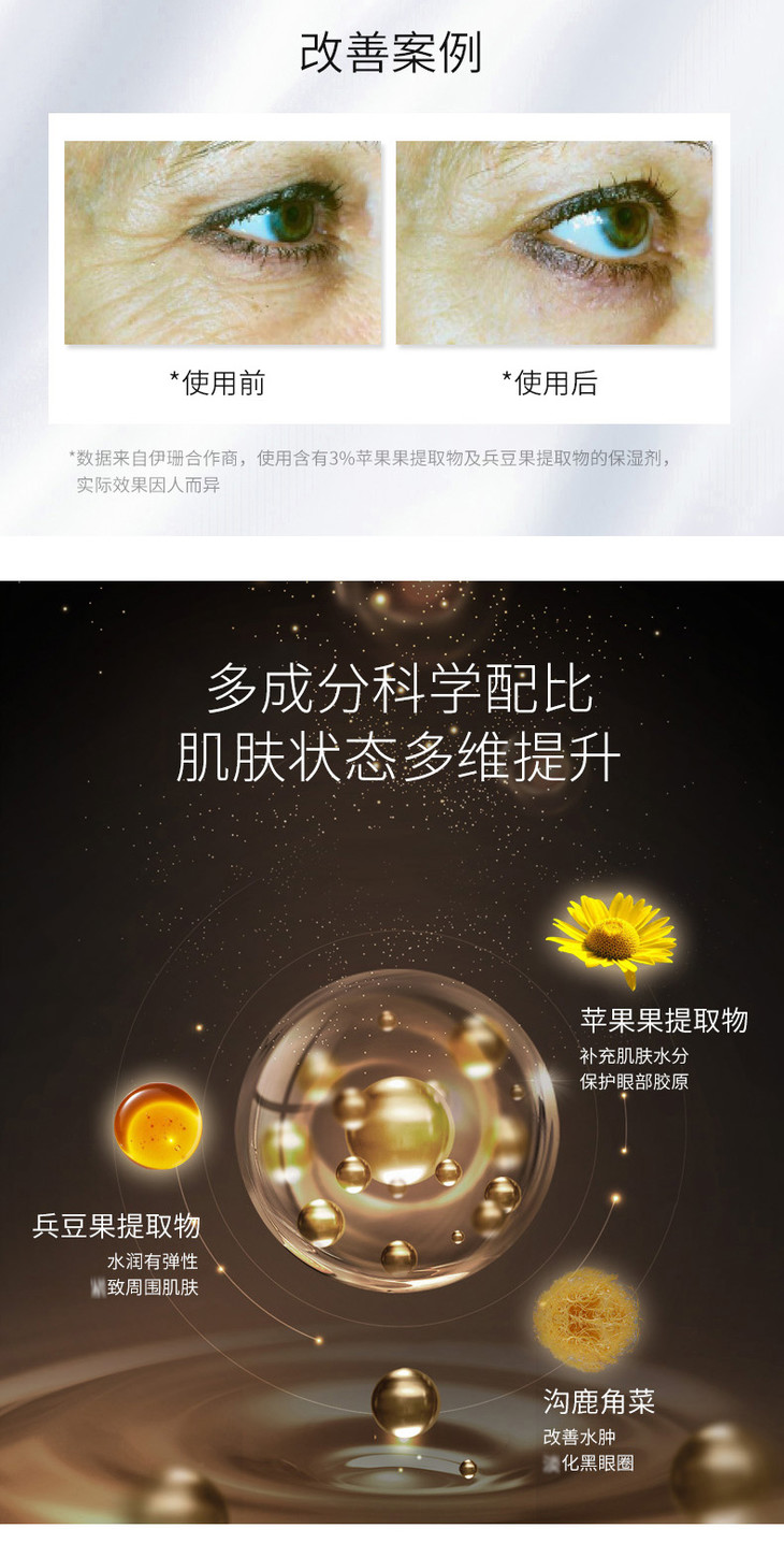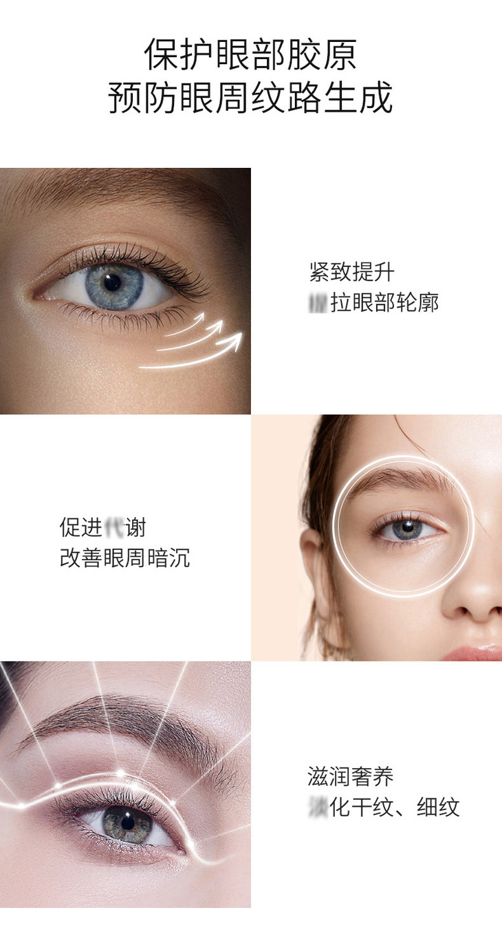产品功效:dan化眼周细wen,滋润并紧实眼周肌肤,dan化黑眼圈,消仲减退,提拉紧致,改善眼周肌肤松弛