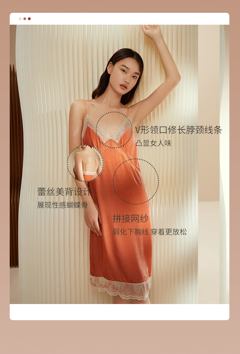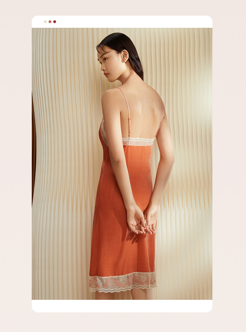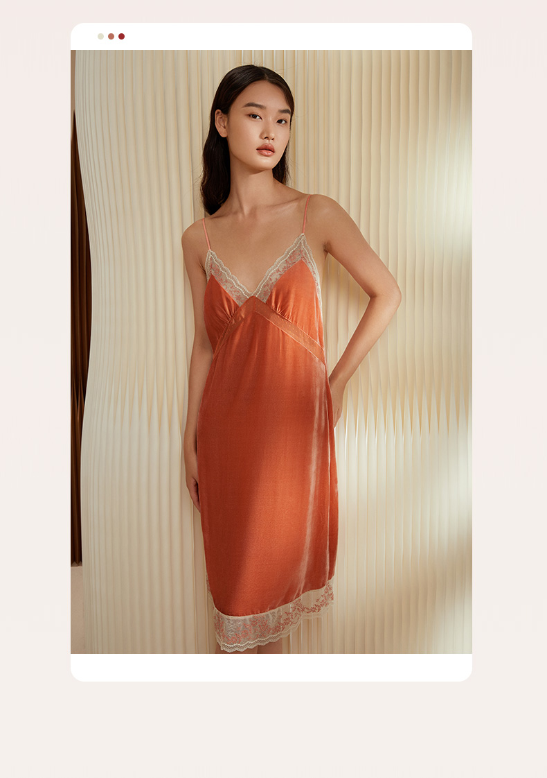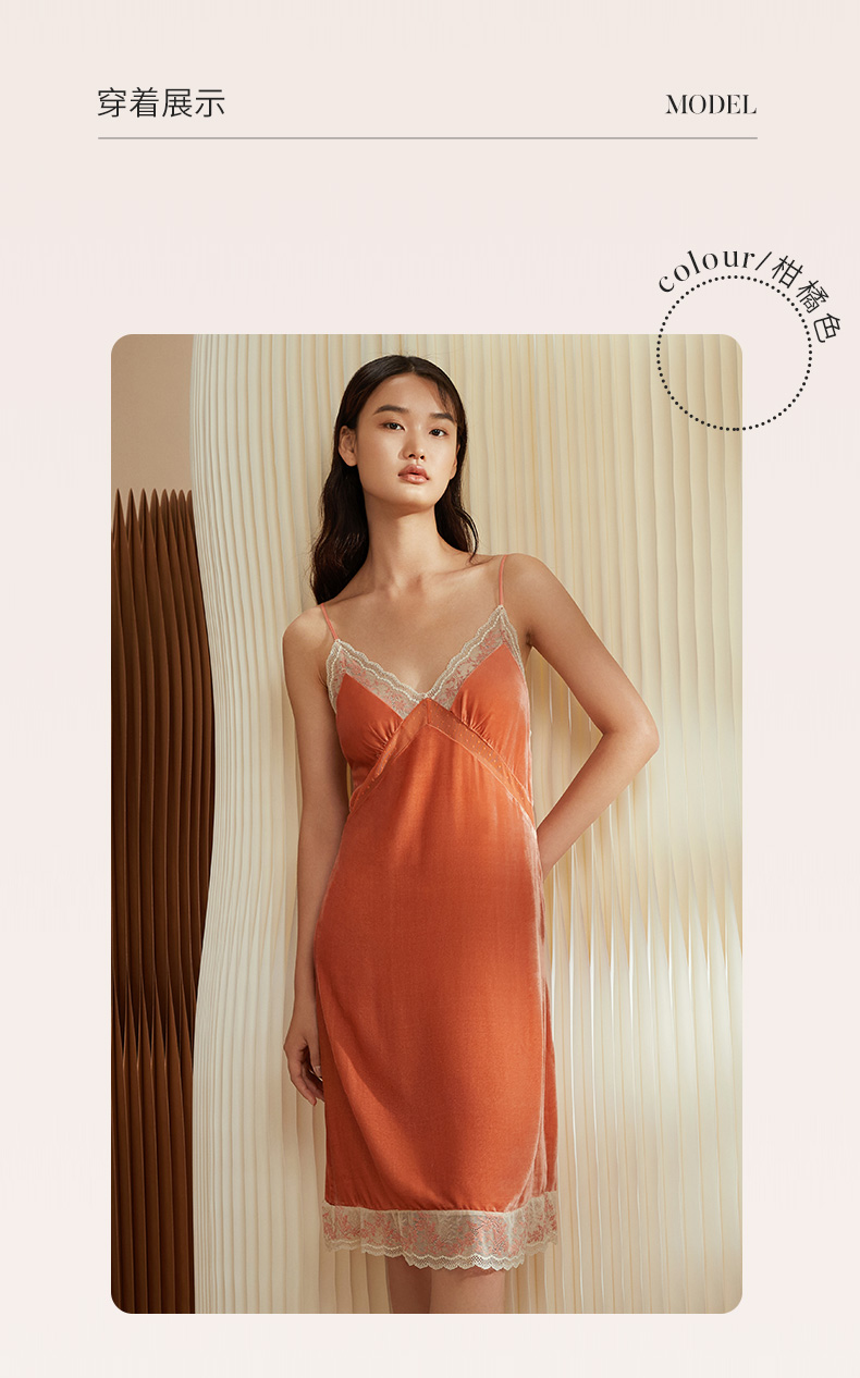 金三塔蚕丝绒温润珍珠光泽气质优雅纯色拼蕾丝女士丝绒吊带裙家居服新品 YSFCC305