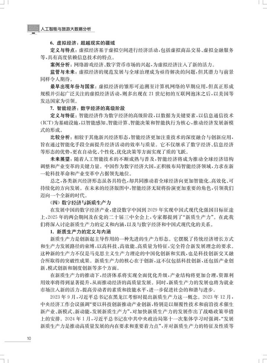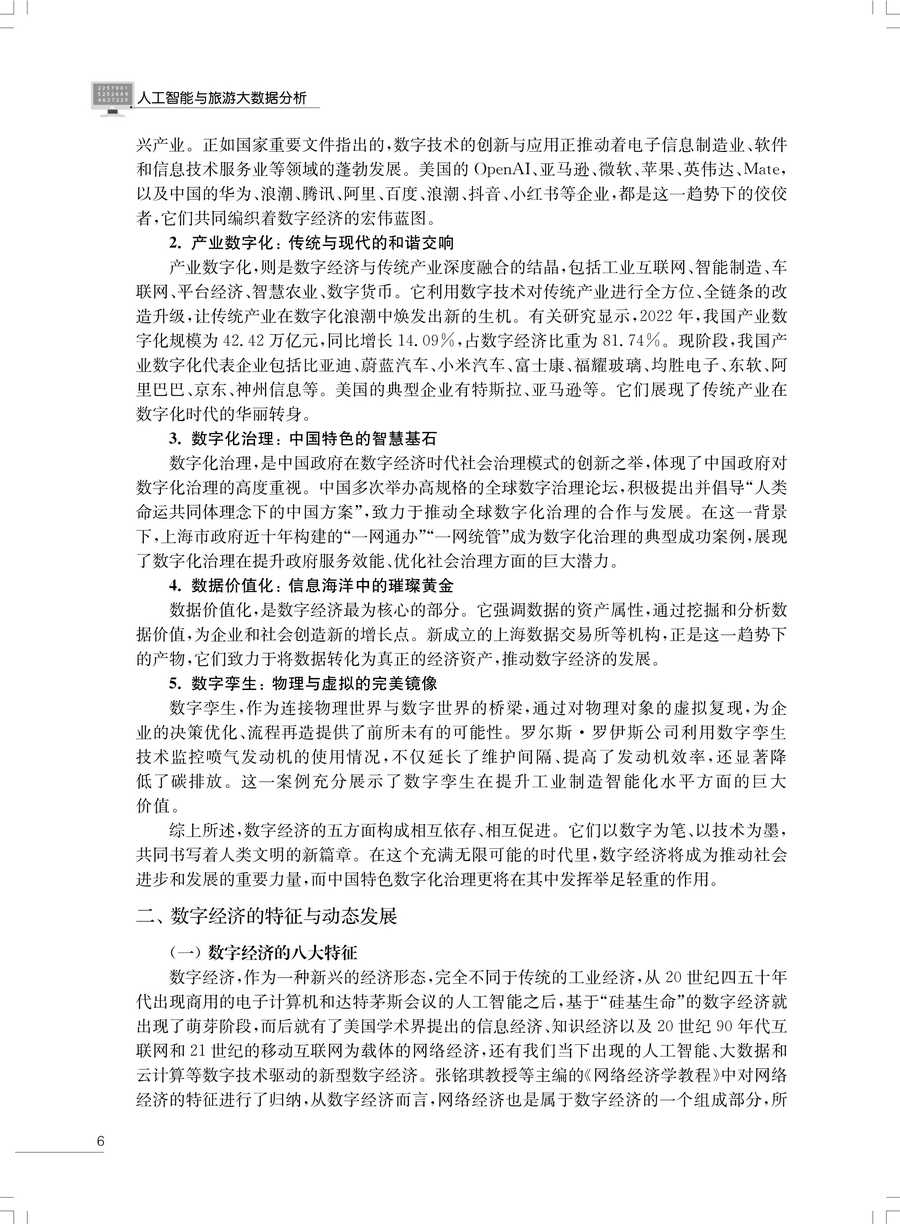 本书以大卫克里斯蒂安的大历史观为框架,全面而系统地梳理人类文明中数字经济与人工智能的进化历程,旨在为学生提供一套兼具理论深度与实践启发的创新性教材。全书通过定义核心概念、提炼历史脉络、剖析前沿理论、设计实践场景,并结合形象的比喻与跨学科视角,构建了理解数字时代的新思维框架。书中不仅提出了一系列原创性思想与模型(如DIKIW模型等),还聚焦文旅产业升级与体验经济转型,为数字经济与人工智能的学术研究与产业实践提供了全新视角。作为;文化为魂、旅游为本、数字赋能的数字文旅产教融合示范教材,本书紧密契合国际化、复合型、应用型人才的培养目标,以;高阶性、创新性、挑战度为教学要求,致力于提升学生的商务逻辑思维、数据实战能力与科技强国责任感。与编者以往编著的《旅游大数据分析》教材相比,本书继续探索创新开拓的宗旨,但在多个方面首创新概念、新思路和新框架。1.进一步重新定义了旅游大数据的概念,更新升级了2015年最早提出的内容。明确了旅游大数据(big data)与旅游数据的本质区别,基于数字化(人工智能技术、大数据技术和云技术)的旅游大数据分析与旅游数据统计、旅游人次测算等的技术层面区别。2.对当下热门的生成式人工智能,提出了一个值得深入研究的课题,就是生成式人工智能的基础理论是计算主义和规模法则。3.在完善数字经济的定义中,尤其是对数字经济的构成从四个组成部分拓展到五个方面,增加了;数字孪生空间,这为数字文旅进入元宇宙实现体验经济提供了新空间。4.在对数据资源和数据要素的讨论中,提出了这些数据资源和数据要素必须符合大数据5V特征。5.对三十多年前美国组织行为学家艾科夫提出的DIKW模型进行了一次升级改造,引进了智能层级,从而让数据分析更加符合规律,构建了DIKIW模型。6.在对数字文旅的内在逻辑探讨中,创造性地提出产业升级和业态转型是内在逻辑。即数字文旅产业是传统文旅产业的升级,旅游经济从服务经济转型到体验经济,这就是内在逻辑。7.进一步完善了旅游大数据分析师的职业技能等级标准和职业岗位能力标准。教材定位与核心目标知识目标:通过线上线下混合式教学,使学生掌握数字经济五大构成(数字产业化、产业数字化、数字化治理、数据价值化、数字孪生)、大数据;5V特征以及规模法则等前沿理论,理解生成式AI的;涌现现象与万亿级Token的底层逻辑。能力目标:依托产教融合实验平台与动态行业数据,培养学生人工智能与大数据的实战能力,覆盖数据采集、挖掘、可视化全流程,并适配;1十X旅游大数据分析师(中级)职业技能标准。素质目标:融入;数字中国思政教育,强化学生科技报国使命感、数字伦理意识与跨领域协作素养。教学改革与创新突破针对传统课程理论与产业实践脱节、数据工具滞后等问题,本书以;两性一度(高阶性、创新性、挑战度)为改革核心。高阶性:首创;1十6十N十X教学框架1个理论课堂(理论体系篇,解析文旅大数据分析基础与旅游人工智能场景应用)、6大产教融合课堂(产业场景篇,文化产业/景区/酒店/旅行社/航空/会展)、N组文旅场景项目任务(实验实践篇,以5组项目任务为基础,线上线下混合式教学,二维码配套N组个性化项目任务)、1项X证书(对应附件标准,以考促学,衔接职业认证)。创新性:校企深度协同,引入文旅行业真实旅游数据与文旅产业导师,结合;教学型产业数字化实验室(EID Lab),打造沉浸式体验场景,并应用AIGC等多元化数字工具。挑战度:以项目制驱动学习,通过数据可视化成果考核与岗位评分表,强化解决实际问题的能力。教材特色与核心优势课证融通:国内首创;1十X旅游大数据分析师证书与课程内容无缝衔接,实现;学考用闭环。深化产教融合:联合腾讯文旅、上海金棕榈数据科技有限公司等头部文旅数字化与大数据企业开发课程,推动双向人才输送与教材更新。数据赋能:依托上海市发展和改革委员会认证的产教融合型企业资源,集成景区客流量、消费行为等实时数据,支撑案例教学与行业洞察。平台支撑:通过;数智DMP平台掌握舆情分析、数据挖掘等高阶技能,提升就业竞争力。本书不仅是理论探索的结晶,更是产教协同的实践指南。通过重构DIKW模型为DIKIW(数据信息知识智能智慧)、定义数字文旅;产业升级与体验经济转型内在逻辑、提出;数据要素须符合5V特征等创新观点,我们期待为读者打开一扇通向数字文明未来的大门。本教材特别感谢上海外国语大学贤达经济人文学院教材建设专项经费资助,感谢数字文旅学院2020级学生邓志凤,2021级学生金一吉、陆笑阳,2022级孙喆的支持工作;特别感谢澳娱综合度假股份有限公司、上海崇明生态旅游集团对本教材相关项目的实践指导,提供案例素材并参与案例的实训协助。潘皓波