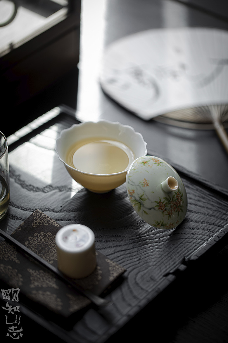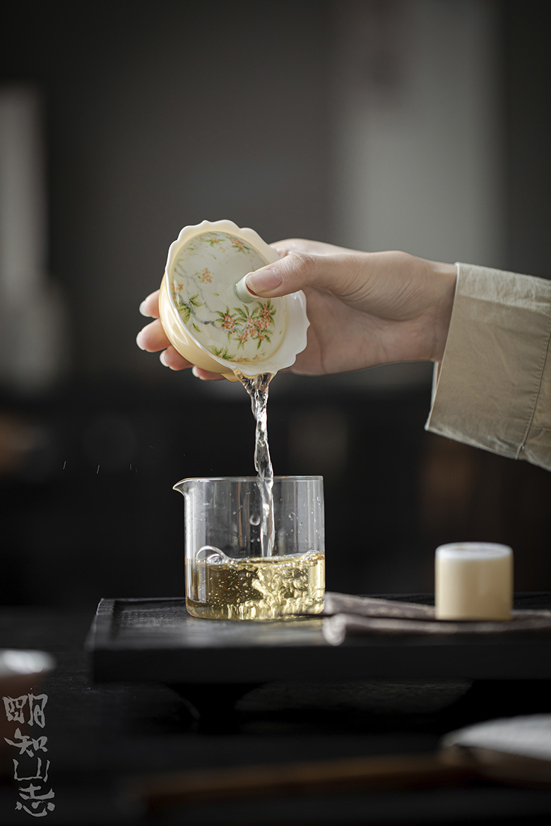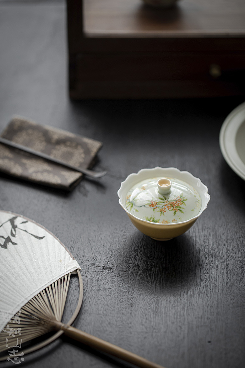 永利汇釉下彩手绘杏黄桂花盖碗莲花瓣泡茶碗家用茶人泡茶品茶碗