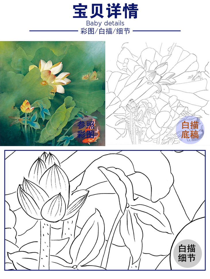 工笔花鸟白描底稿-荷花-斗方小品册页-A378