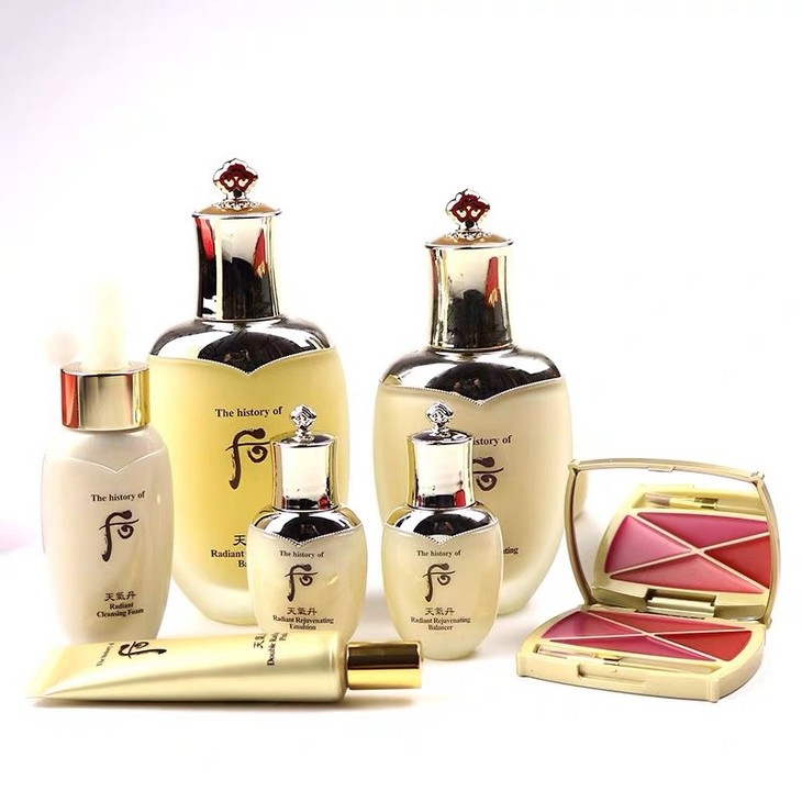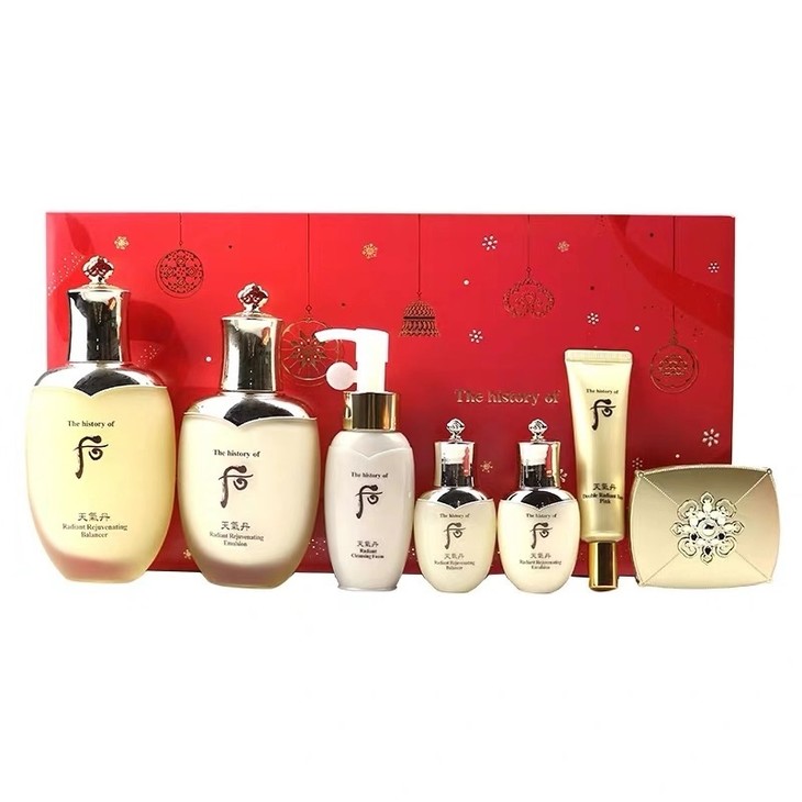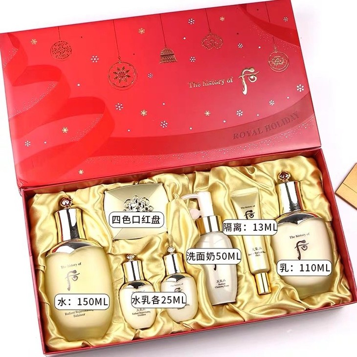 WHOO天气丹6件套#圣诞版👍这个系列是whoo的明星产品啦🌟!换季肌肤敏感出现大红脸🍂,局部皮肤刺痛😭?那华泫简直就是福音了!最大的特点是提高皮肤的免疫力⬆,高效修复,补水保湿💦,还抗皱哦~👉能从根本上解决肌肤水油平衡〽,上脸很容易吸收,不会感觉油腻🍃,有血丝皮肤敏感的宝宝也适用哦。套装包括:水150ml➕乳110ml➕水乳各25ml➕四色口红盘➕洗面奶50ml➕隔离13ml