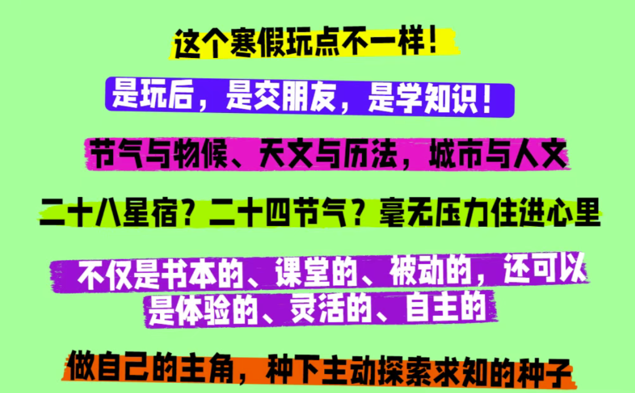 冬至一阳生,冬至大如年。从风向到天象,从音律到物候,带孩子们回到三段历史现场去解析冬至的时空密码。我们将遇见乾隆、诸葛亮、蔡邕,在互动玩耍和现场实验中体悟老祖宗的科学精神和智慧。用历史说话,让文韬武略代言。