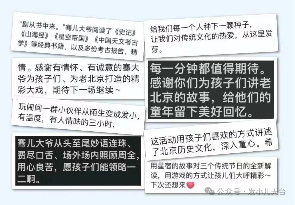 回到四合院,所有人的身份就不再是观众,而是“回家过年的孩子”!入戏,先变身:阳光社牛的小飒,胆小细心的小雅,甜美可爱的小花,爱花懂花的笑笑,热爱运动的小凯、喜欢历史的小文、或是酷酷的大卫、爱发明脑洞大的小林,语速快逻辑强的小欣……总之,孩子们共同的身份,都是——太姥爷家的孩子!