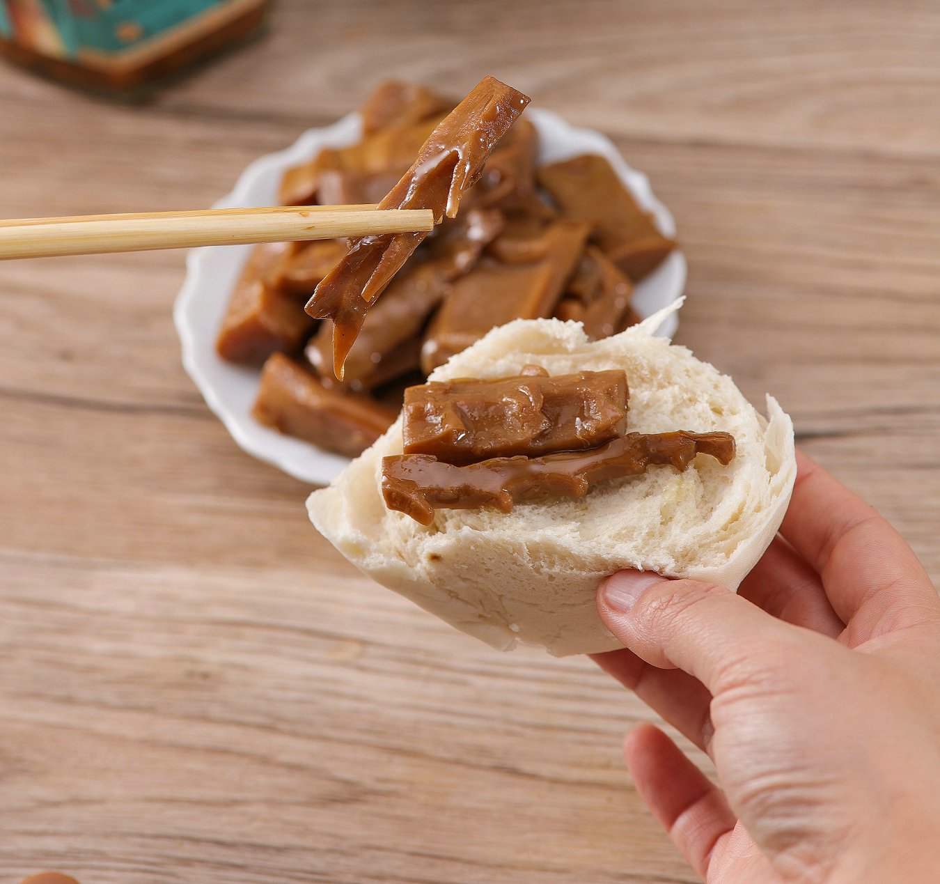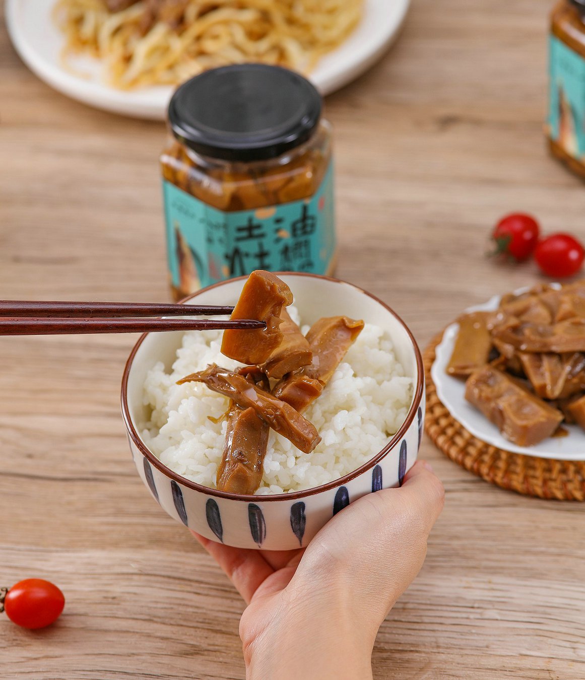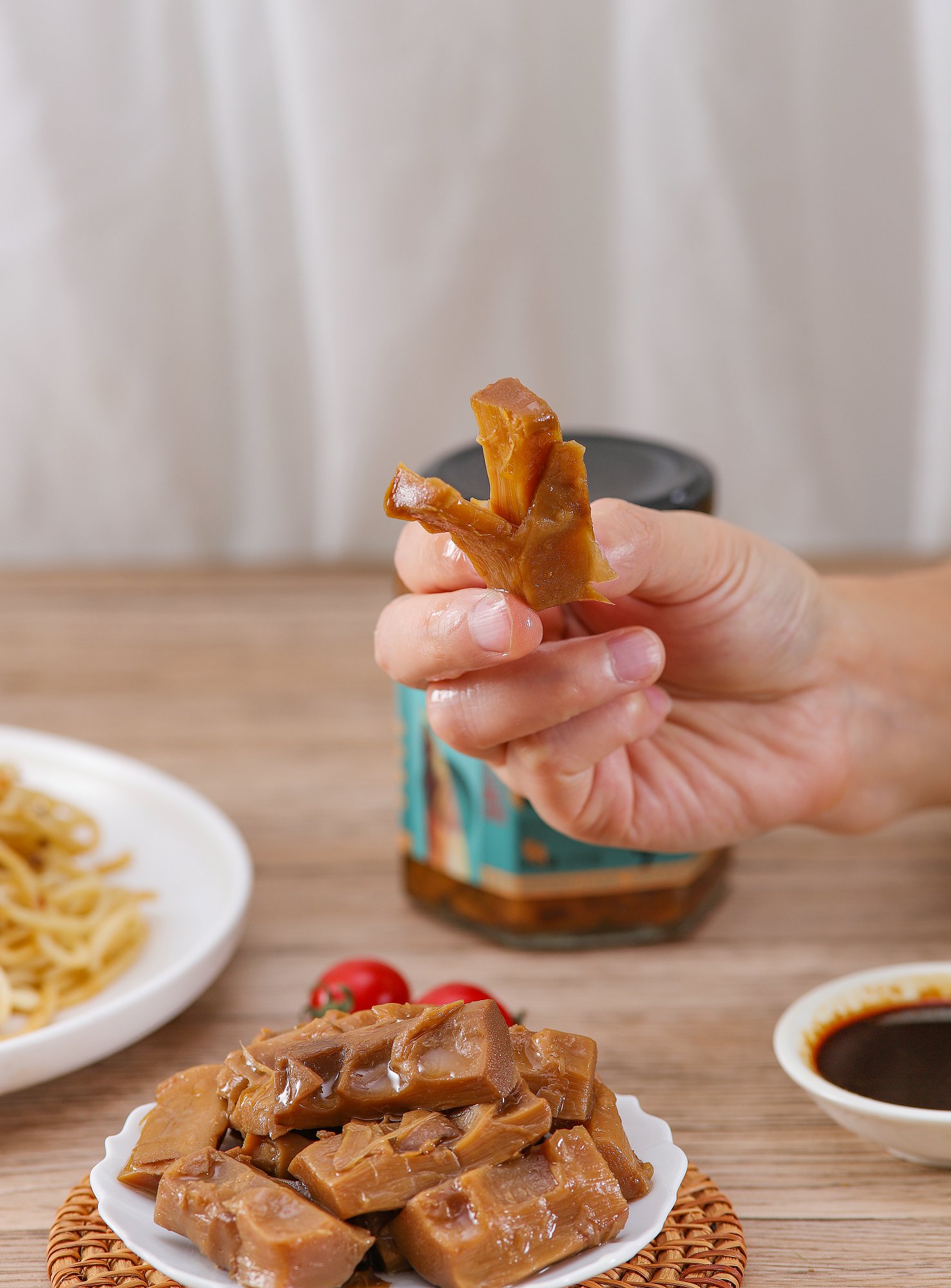 咀嚼,外软内脆,酱汁丝丝渗入,咸香嫩滑,还透着一股笋的原汁鲜香,回味清甜,还没拿来下饭配粥,就一不留神吃掉了大半瓶!嘎嘣嘎嘣脆生生的,吃着超过瘾,难怪好这口的人评价:“到给肉都不换!”。