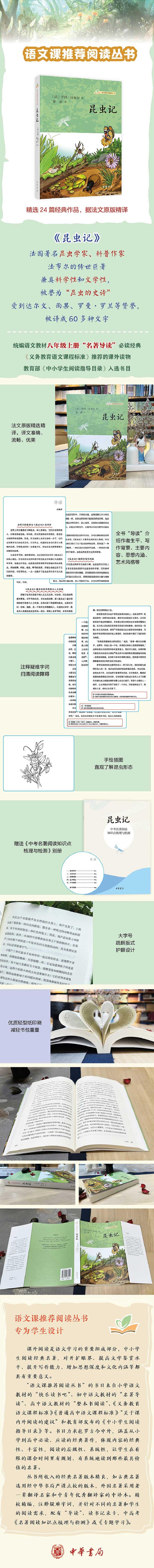从1879起,法布尔在他心爱的“荒石园”里观察昆虫,研究昆虫的特征、习性,他将研究成果著成《昆虫记》。全书共十卷,约二三百万字,描绘了一百多种昆虫的形态、特征、习性等,真实地记录了昆虫的劳动、繁衍、死亡等过程。作者在阐述科学研究成果的同时,表达了对自然、对生命的热爱,对人生、对社会的思考与感悟,在普及科学知识之余,传递给读者美的享受、生活的希望和智慧的启迪。“语文课阅读丛书”的《昆虫记》是根据法文原版精译的精选本,选译了24篇具有代表性的篇章。译文忠于原著,准确、流畅、优美。书前“导读”介绍《昆虫记》的作者生平、写作背景、主要内容、思想内涵、艺术风格等。根据中学生的阅读需求和能力,注释文中的疑难字词,扫清阅读障碍。配有《中考名著阅读知识点梳理与检测》手册,帮助学生备考。