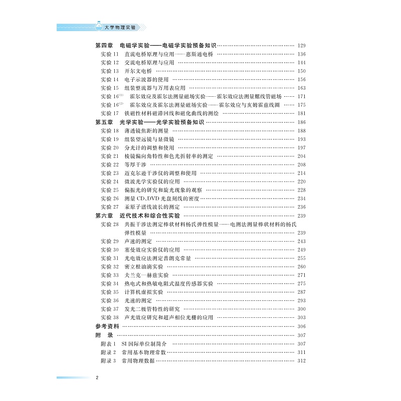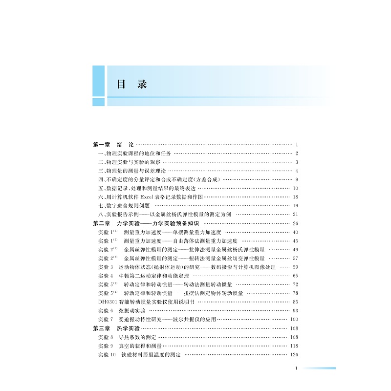本教材分六章:;第一章力学实验,介绍测量重力加速度、金属丝杨氏弹性模量的测定、抛射体运动的研究等七个实验项目;第二章热学实验,介绍导热系数的测定、真空的获得和测量和铁磁材料居里温度的测定三个实验;第三章电磁学实验,介绍惠斯登电桥、交流电桥、开尔文电等七个实验;第四章光学实验,介绍测量透镜焦距测量、组装望远镜与显微镜、分光计的调整和使用、;第五章近代技术和综合性实验,介绍电测法测棒状材料的杨氏模量、声速的测定、塞曼效应、光电效应法测定普朗克常量用等十个实验