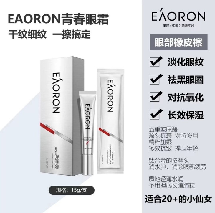 EAORON青春眼霜15g👍张雨绮同款眼部橡皮擦,干纹细纹一擦搞定,年轻人必备,适合20岁+喜欢熬夜的大BB👶!含有五重玻尿酸💦,可以从源头上保湿、抗老、促进血液循环,氨基酸和ALBIZIA精粹搭配可以提亮眼周肌肤。独创钛合金美容按摩头🕶,冷热两按法,有效活血消肿,淡化黑眼圈和眼袋,抚平假性细纹。质地轻薄水润,不用担心长脂肪粒。