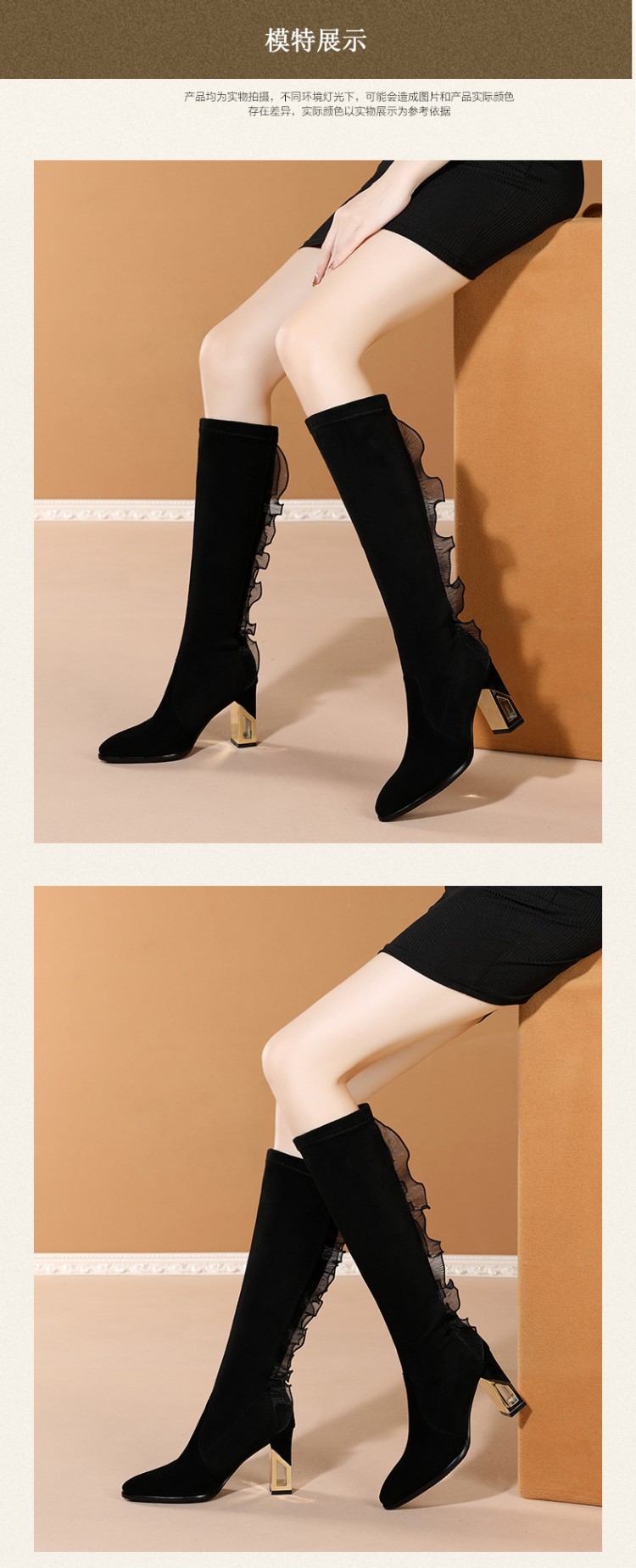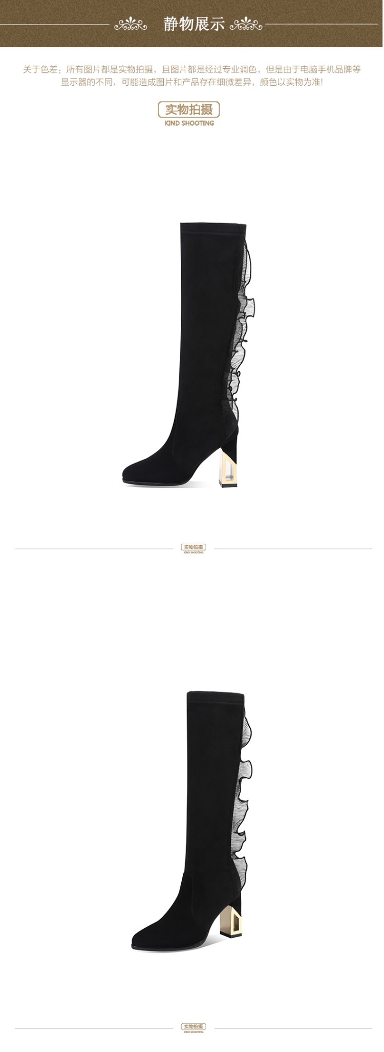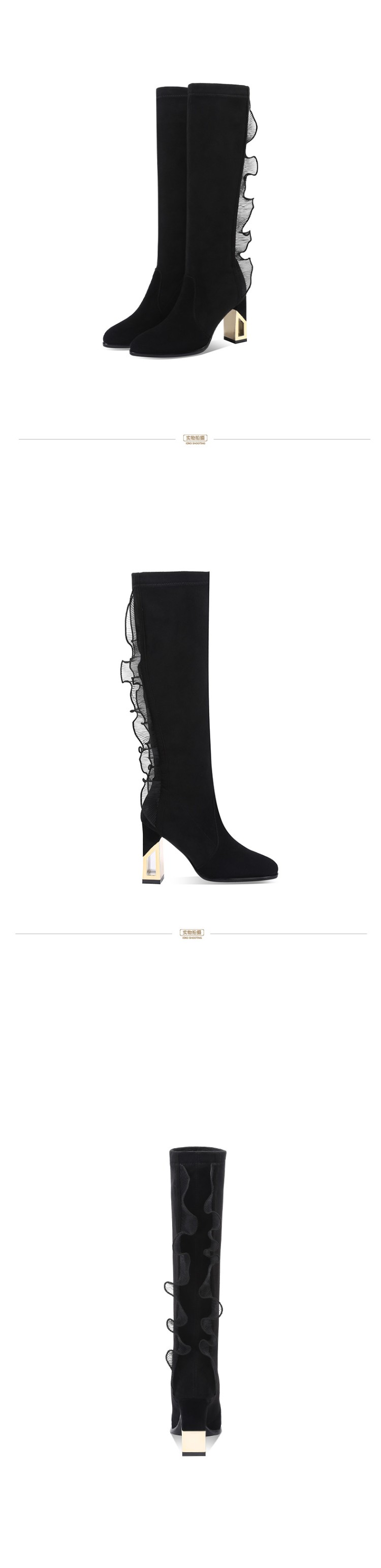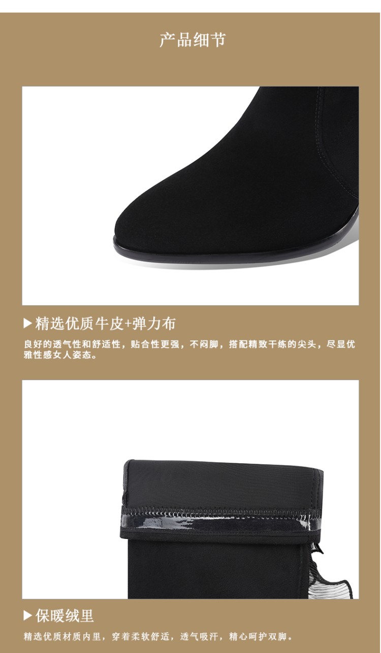 HFE-N311-W6337 秋冬新款尖头粗跟磨砂真皮时装靴波浪边弹力布纯色百搭高筒靴