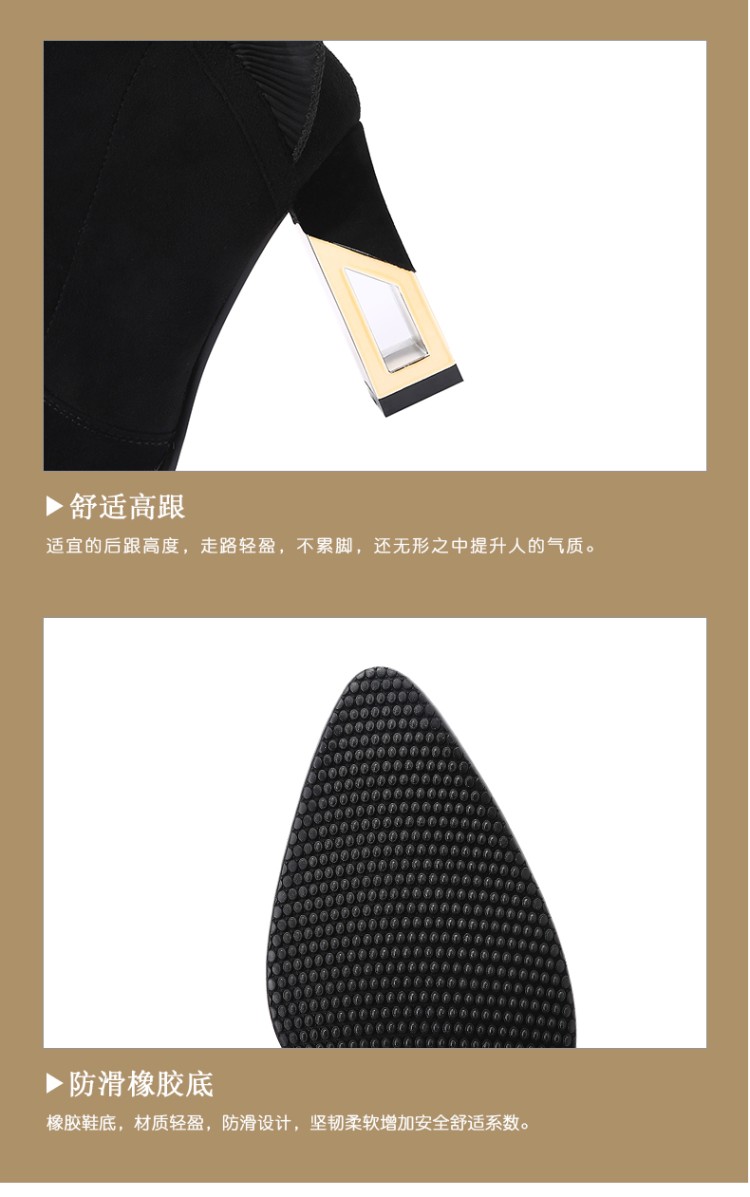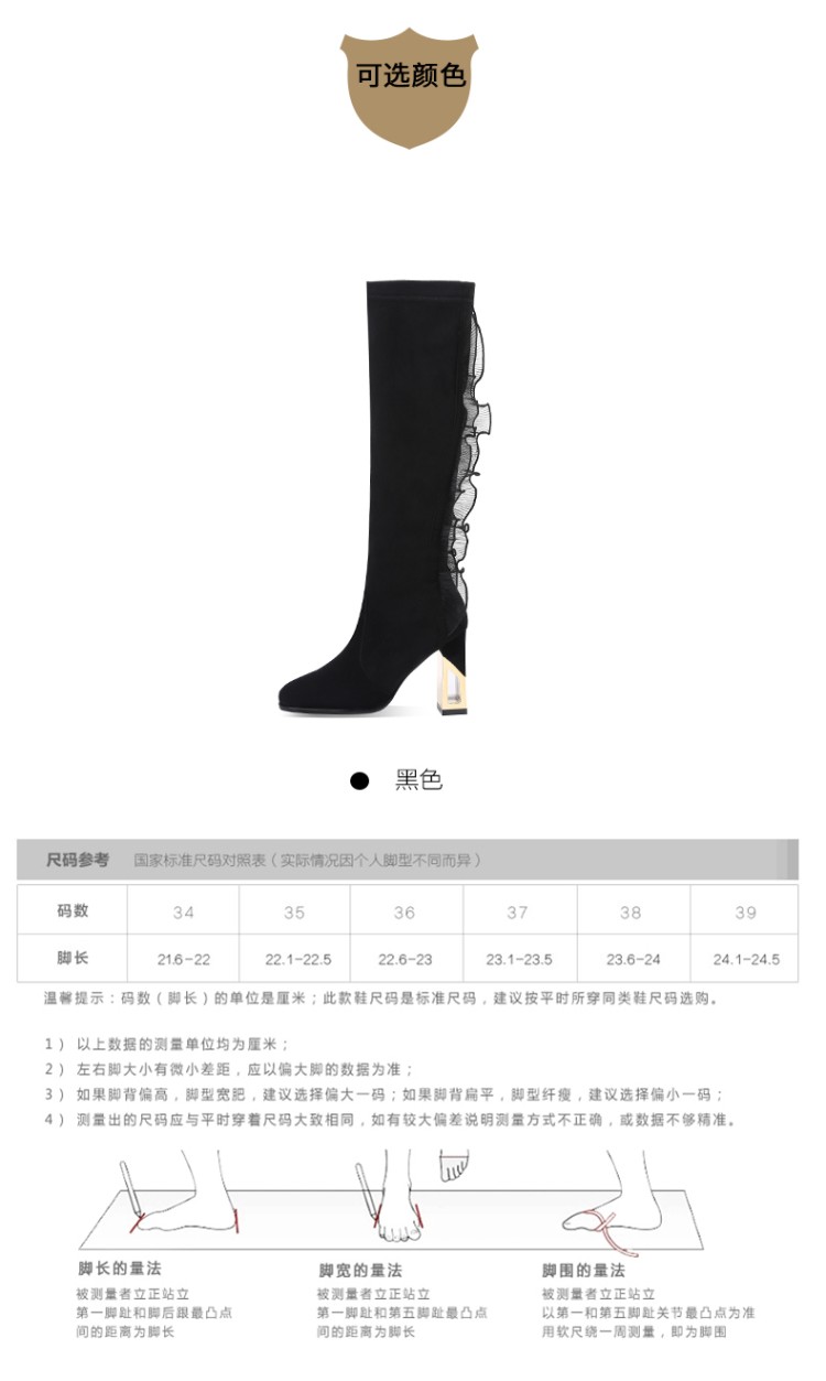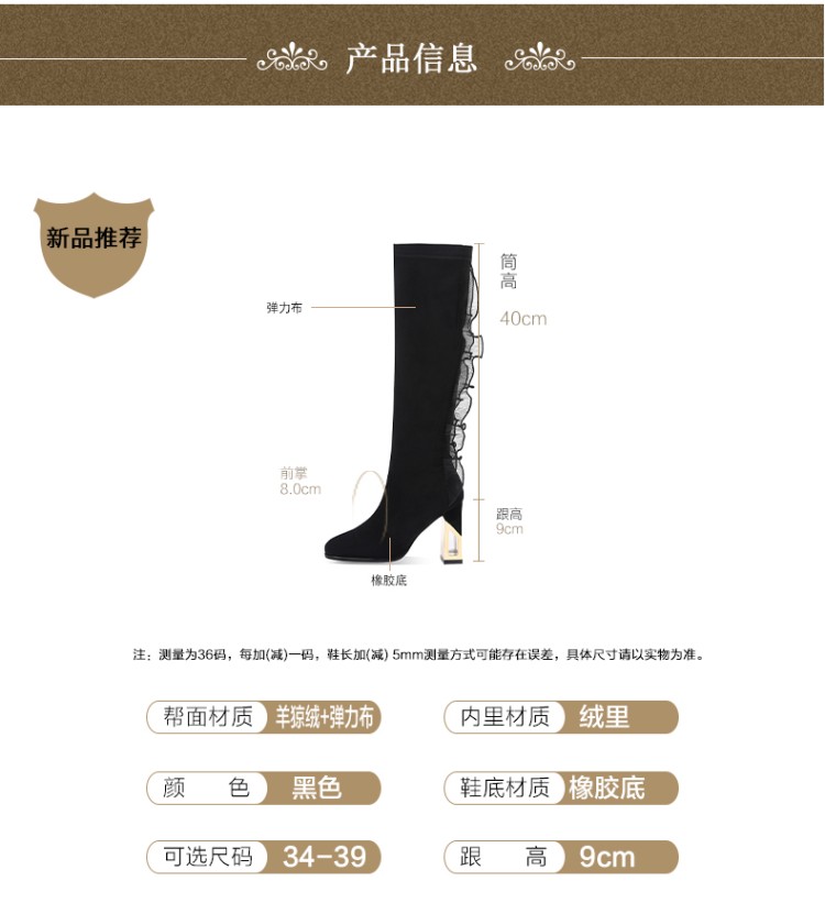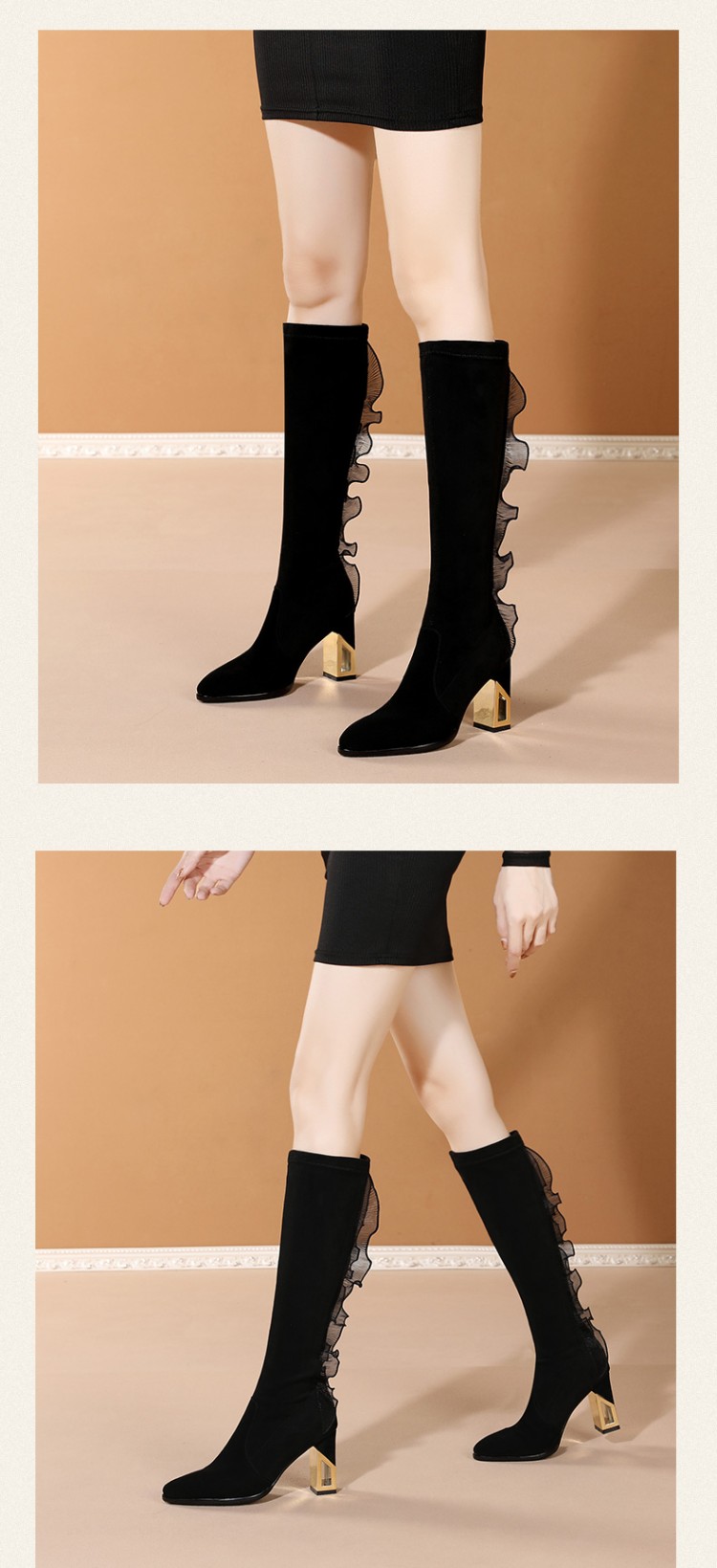 HFE-N311-W6337 秋冬新款尖头粗跟磨砂真皮时装靴波浪边弹力布纯色百搭高筒靴