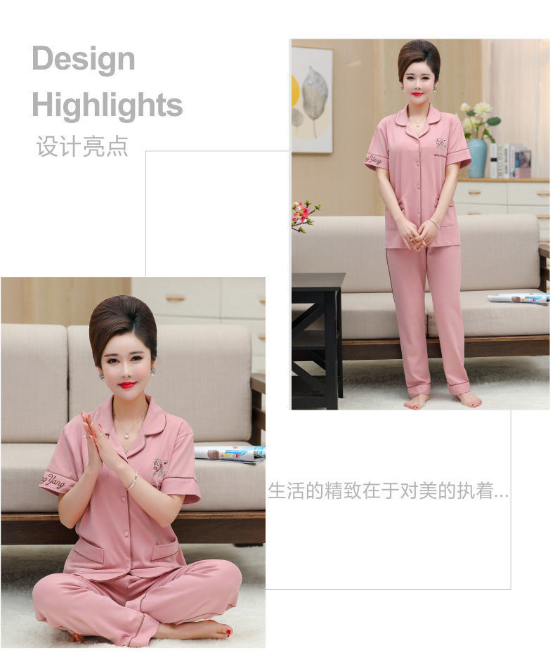 100%纯棉睡衣女夏季短袖长裤中年妈妈,大码开衫套装中老年人家居服LJX-878