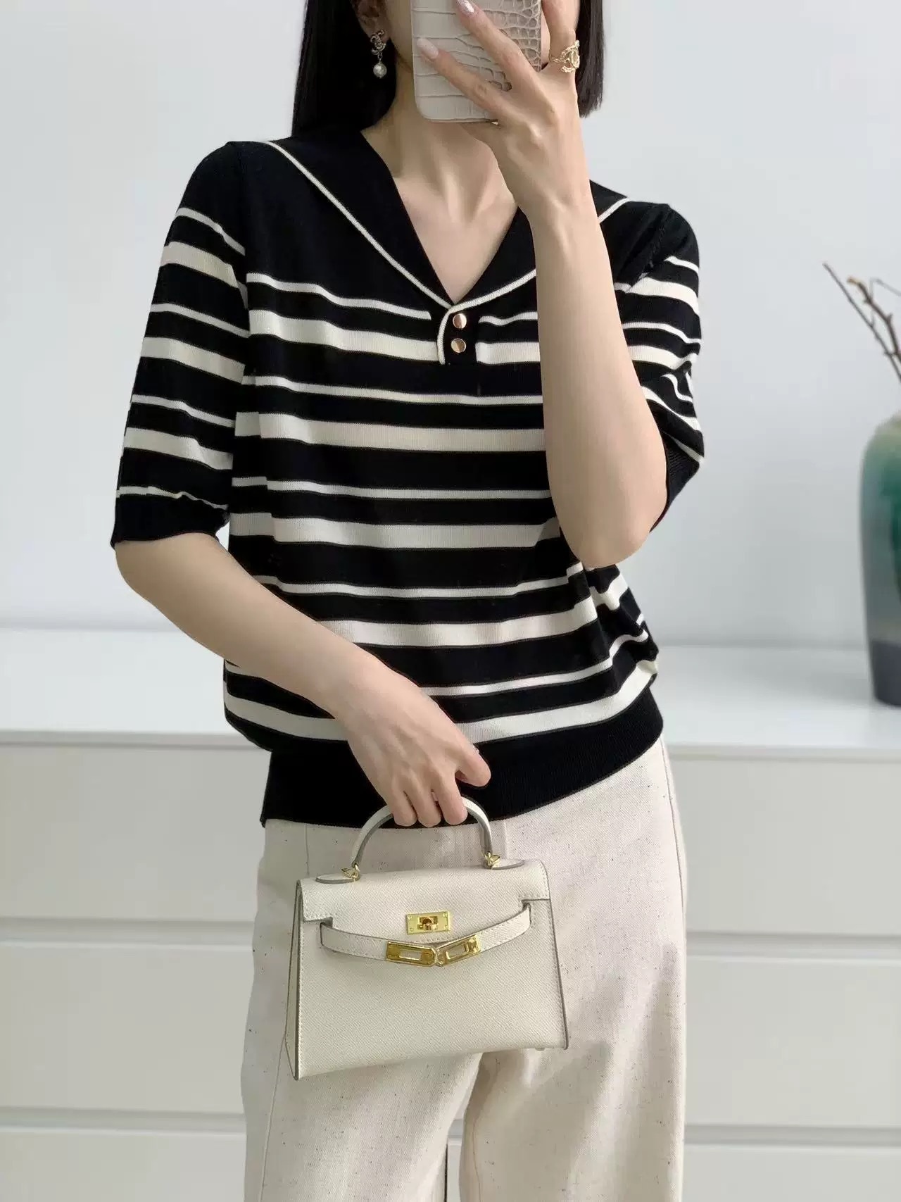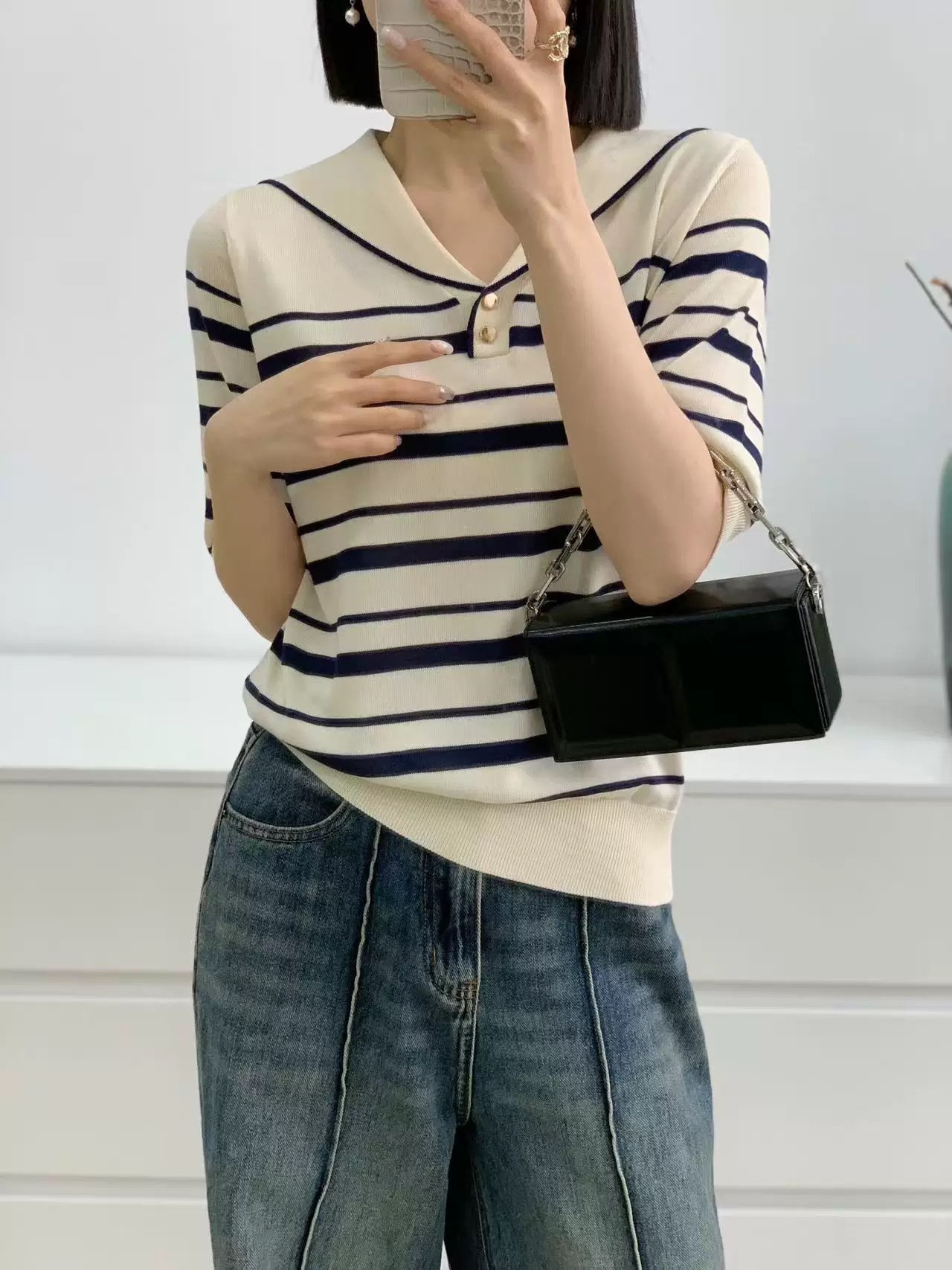 雀说天丝莱赛尔~海军领条纹针织衫女春夏休闲百搭气质宽松短袖套头衫ALSN338