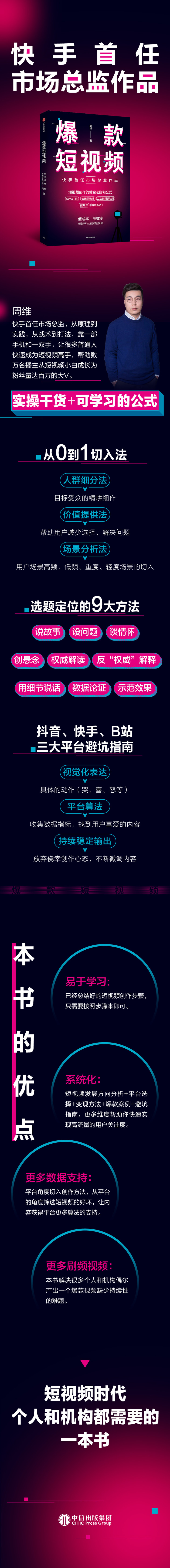 如今,短视频已经成为大众工作、生活不可或缺的媒介形态,也给予每个人展现自身价值、收获人生财富的平等机遇。周维曾任快手首任市场总监,拥有丰富的一线短视频运营经验。在分析了上万个爆款短视频的底层逻辑,如平台的选择、个人的定位、内容的创作、裂变模式等的基础上,作者总结出实用、活用、巧用的方法,让短视频创作者学会、学懂、学精。本书不仅着重介绍了独特的短视频创作方法,如进行自我定位的SWOT法、效用函数法、二次创新实验法、拉片法、微创新法,打造留存率高、互动性强的短视频运营方法,还针对如何实现变现这一问题给出了多个实用模型,更分析了短视频创作者容易进入的几大误区,真正帮助短视频从业者实现一条视频带火一个产品、一个短视频完成销量目标、一个视频打造一个品牌IP的目标。