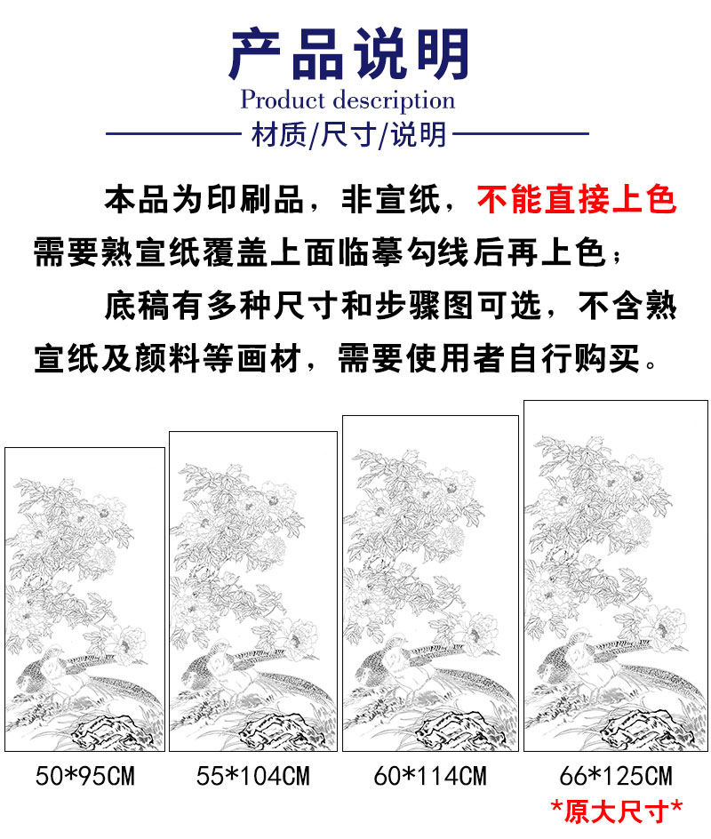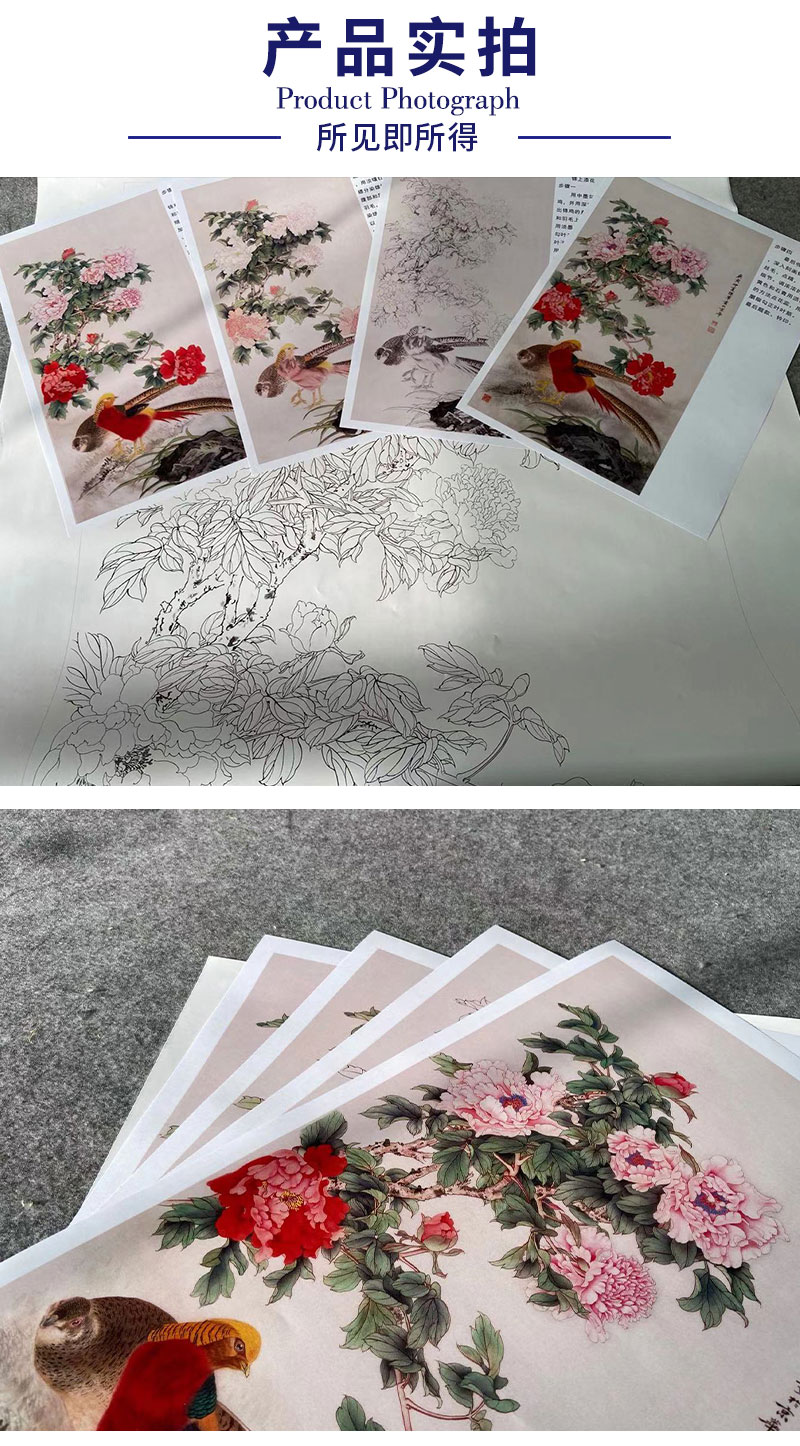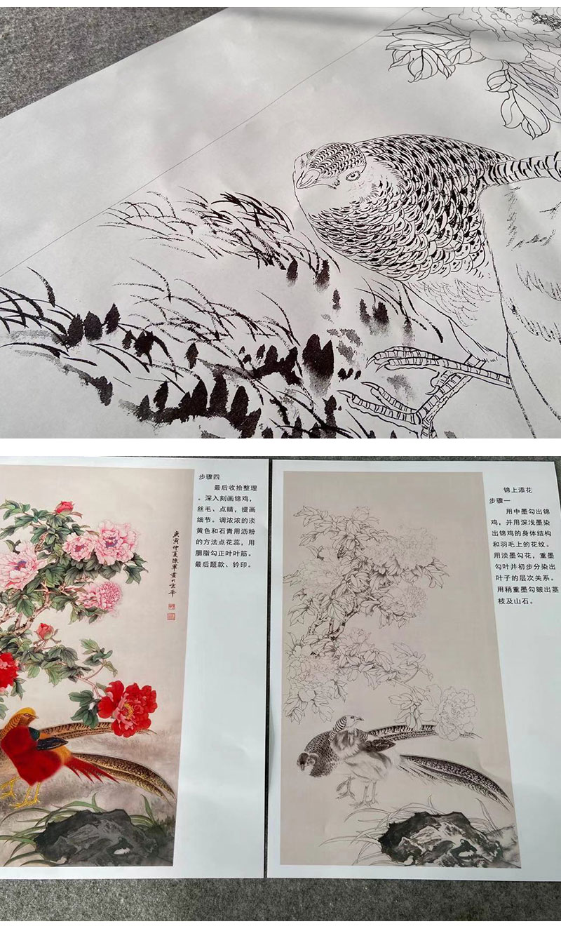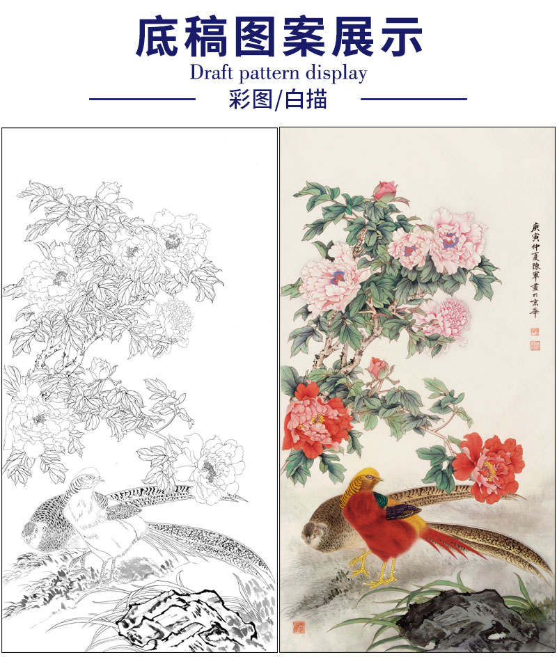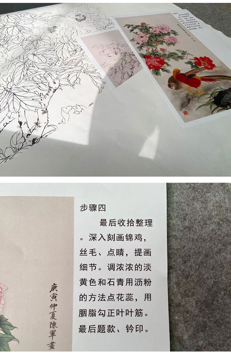 【有步骤】陈军工笔画白描底稿《锦上添花》锦鸡牡丹初学者临摹花鸟线稿CJ24