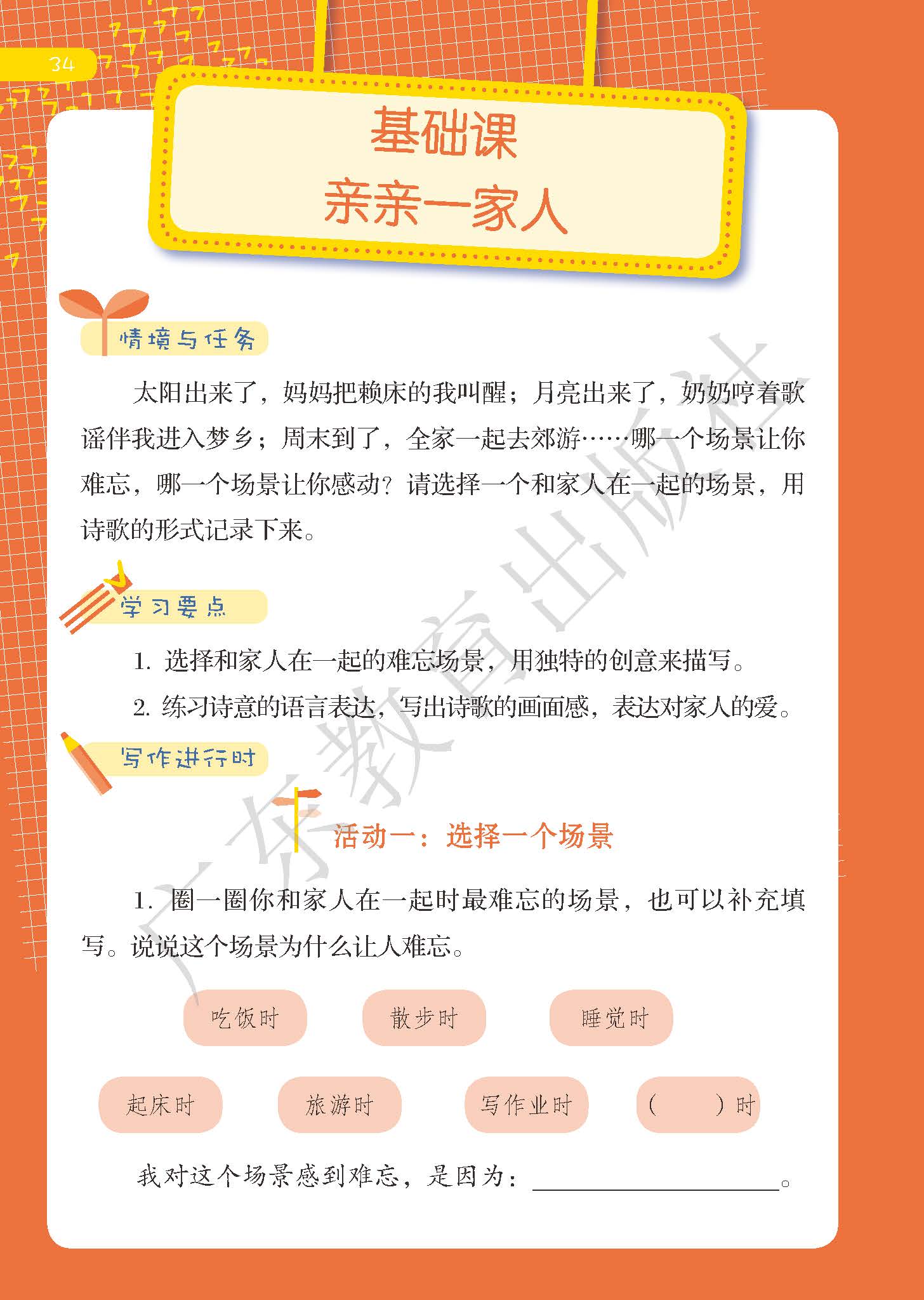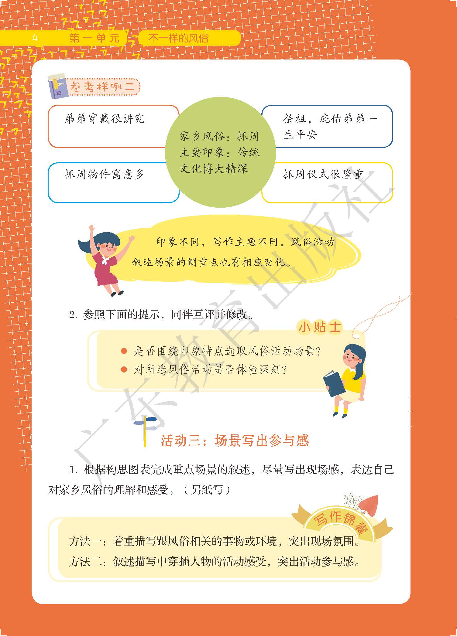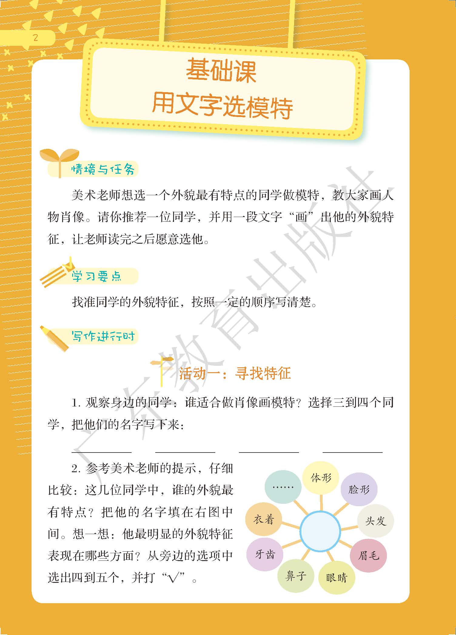 3.写作有法,有趣有效:话题设置和任务情境符合学生年龄特点、贴近生活,能激发学习兴趣;通过大量思维导图、“方法+例文批注”等支架,帮助学生梳理思路、有效学习,操作性强。