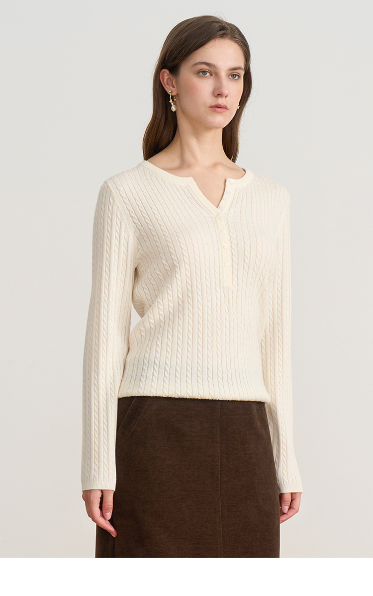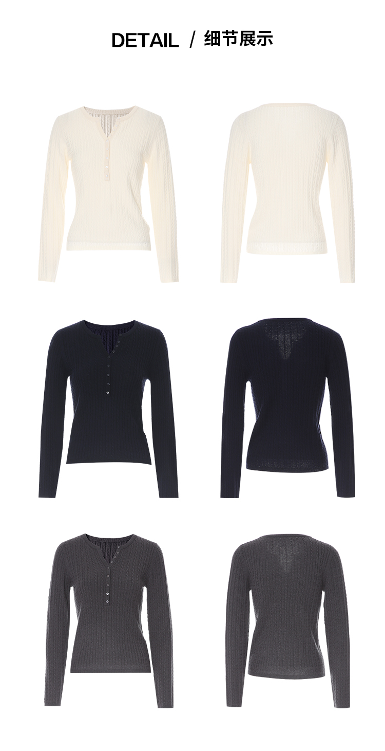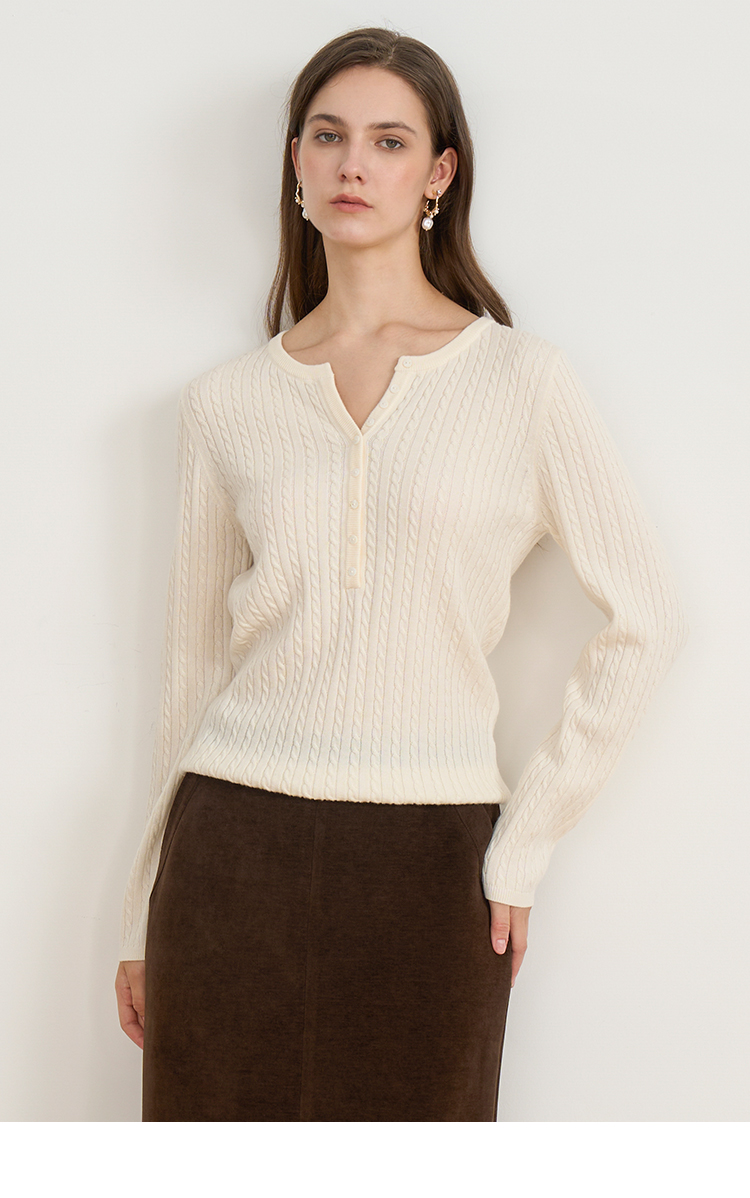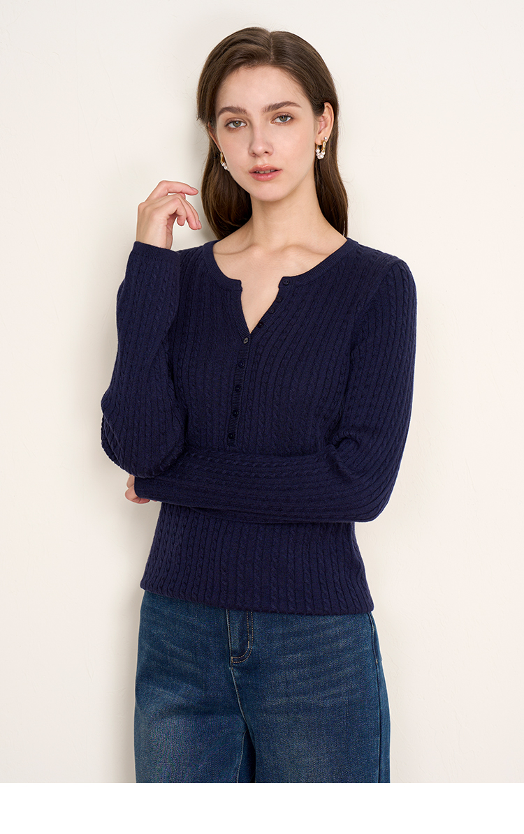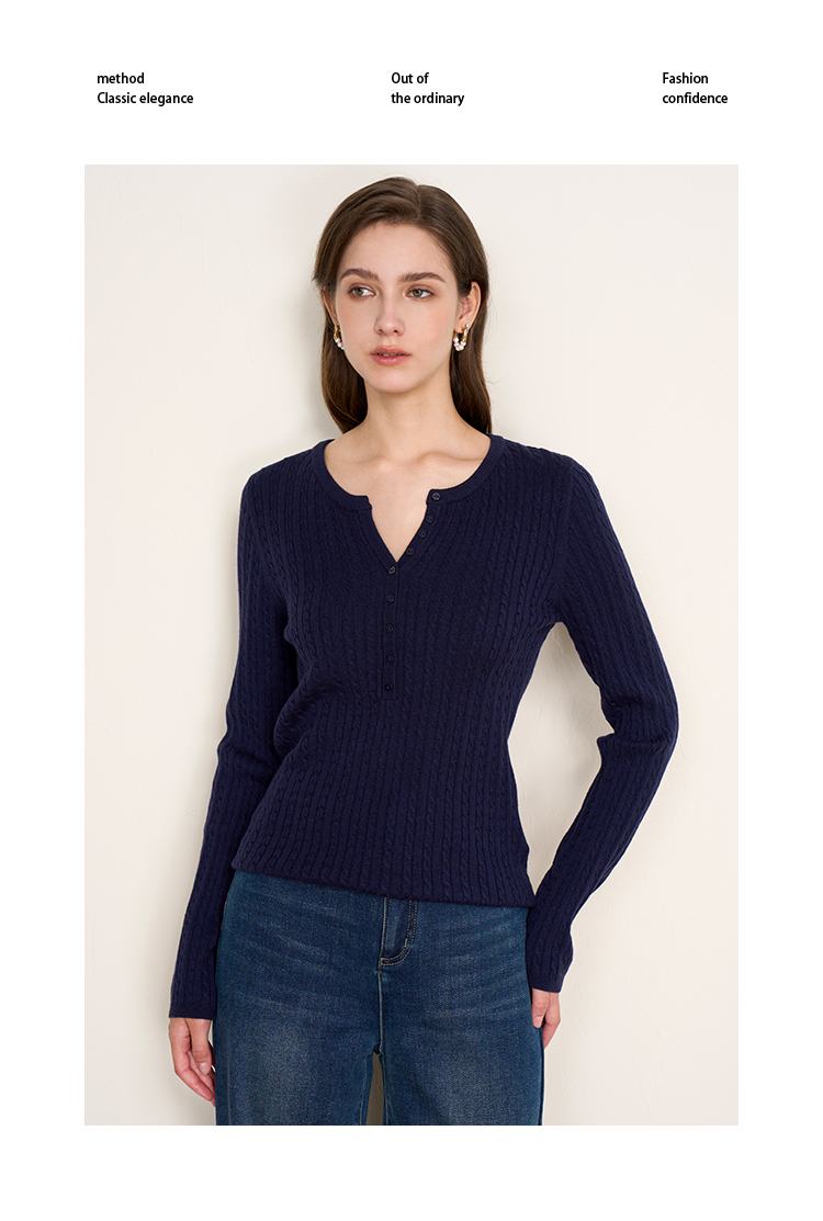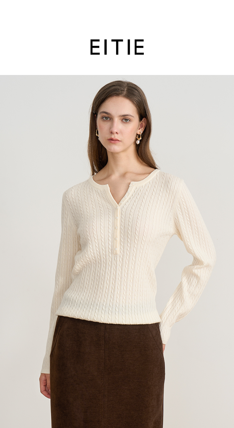 EITIE爱特爱复古绞花内搭打底显瘦简约毛衣V领羊毛衫秋季新款针织衫D2501913