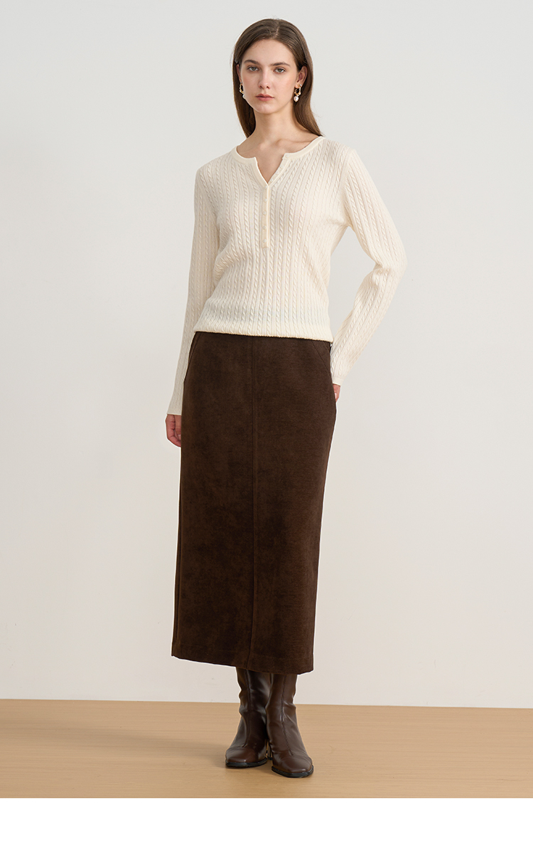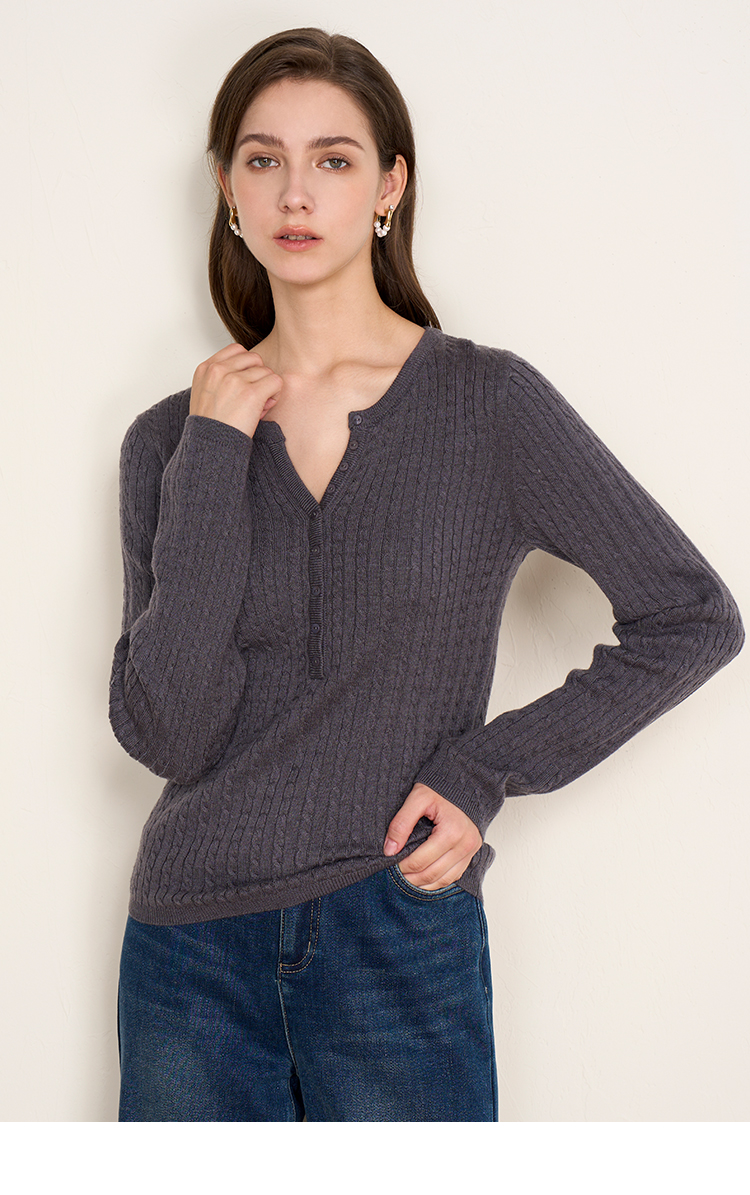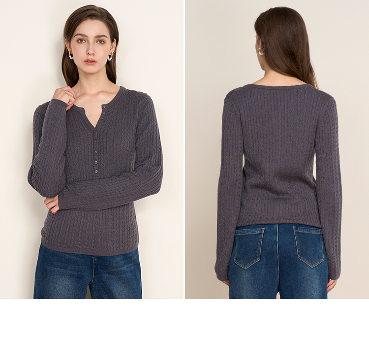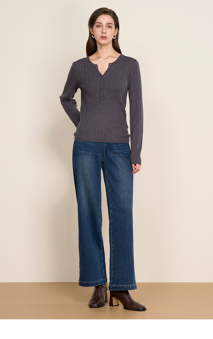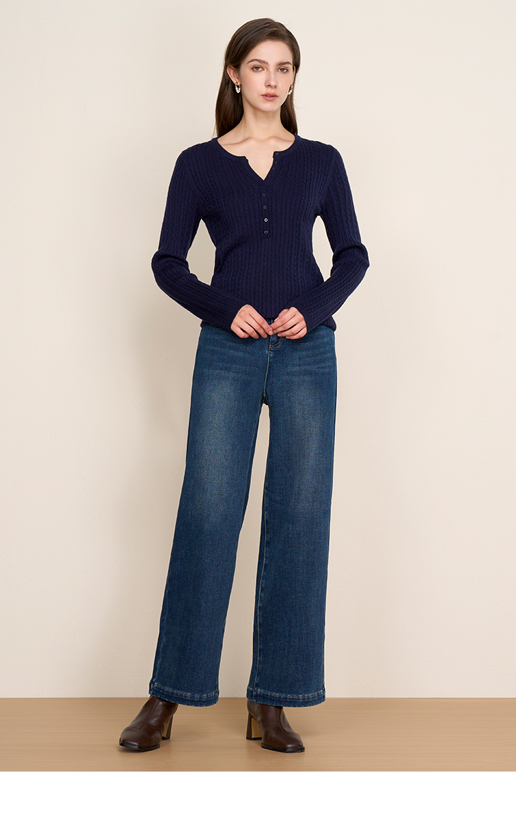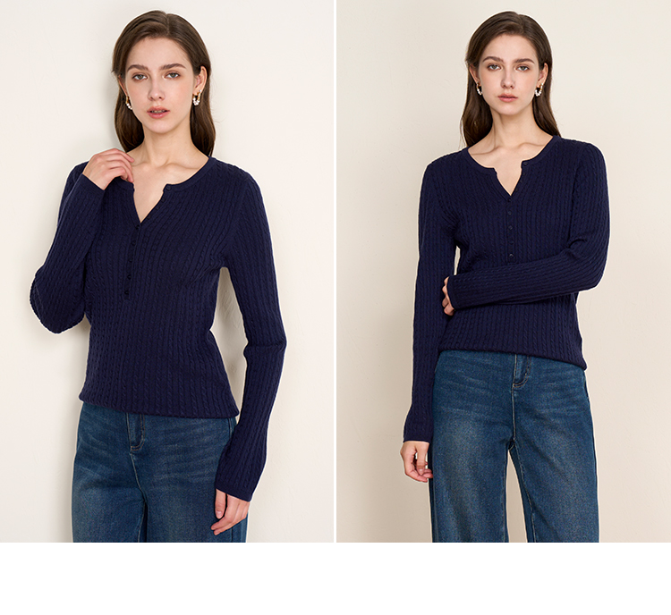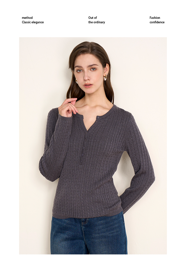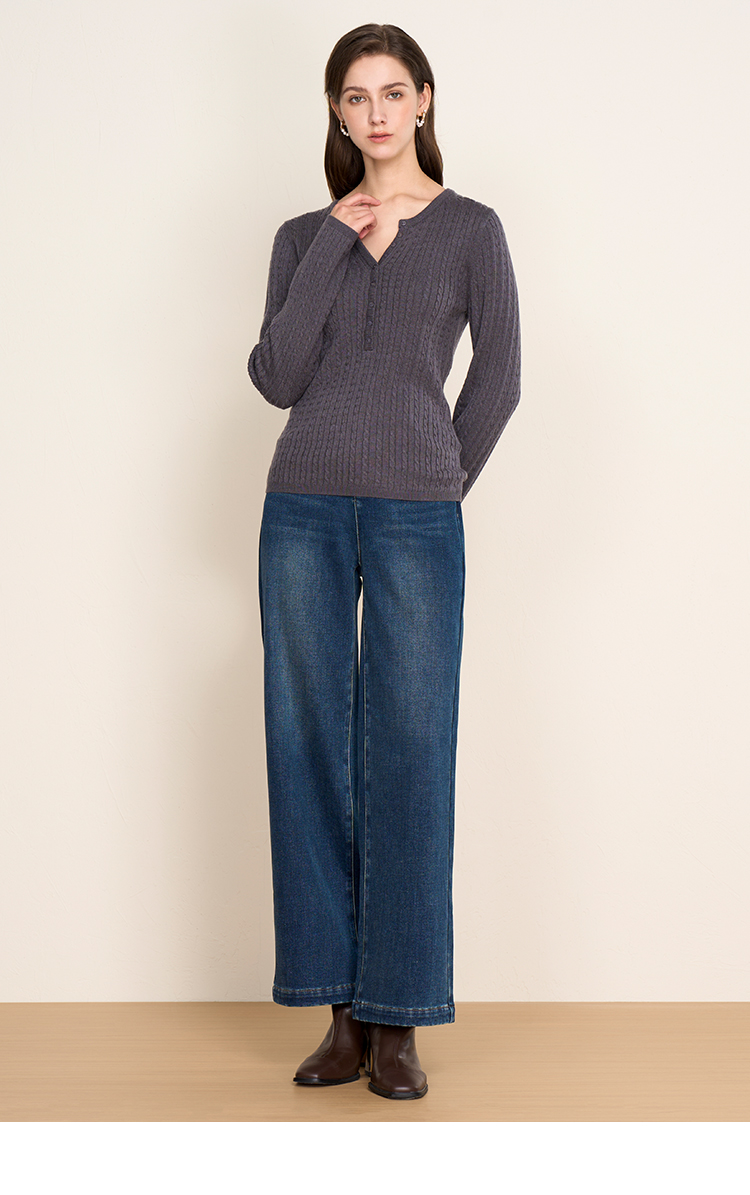 EITIE爱特爱复古绞花内搭打底显瘦简约毛衣V领羊毛衫秋季新款针织衫D2501913