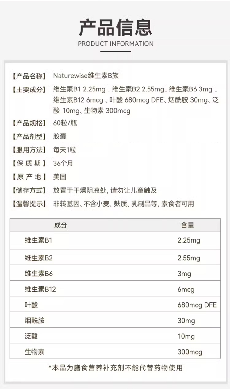 【naturewise】美国原装 B族维生素60粒/瓶
