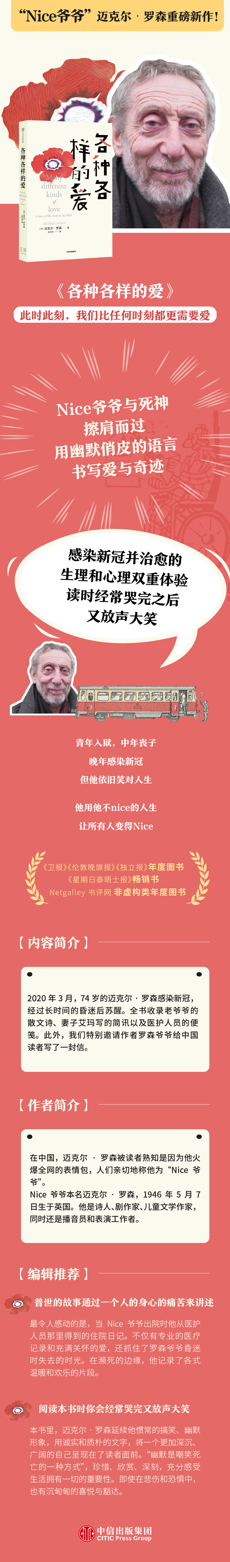 全书分为8章,收录老爷爷的散文诗、妻子艾玛写的简讯以及医护人员的便笺。此外,我们特别邀请作者罗森爷爷给中国读者写了一封信。恐惧源于未知,至暗时刻,这本小书给人带来力量与勇气。