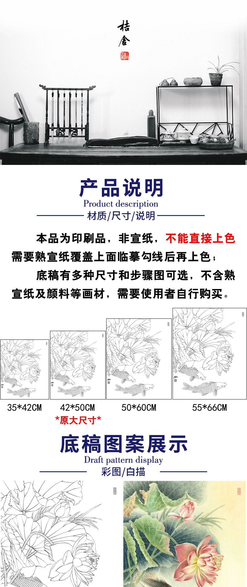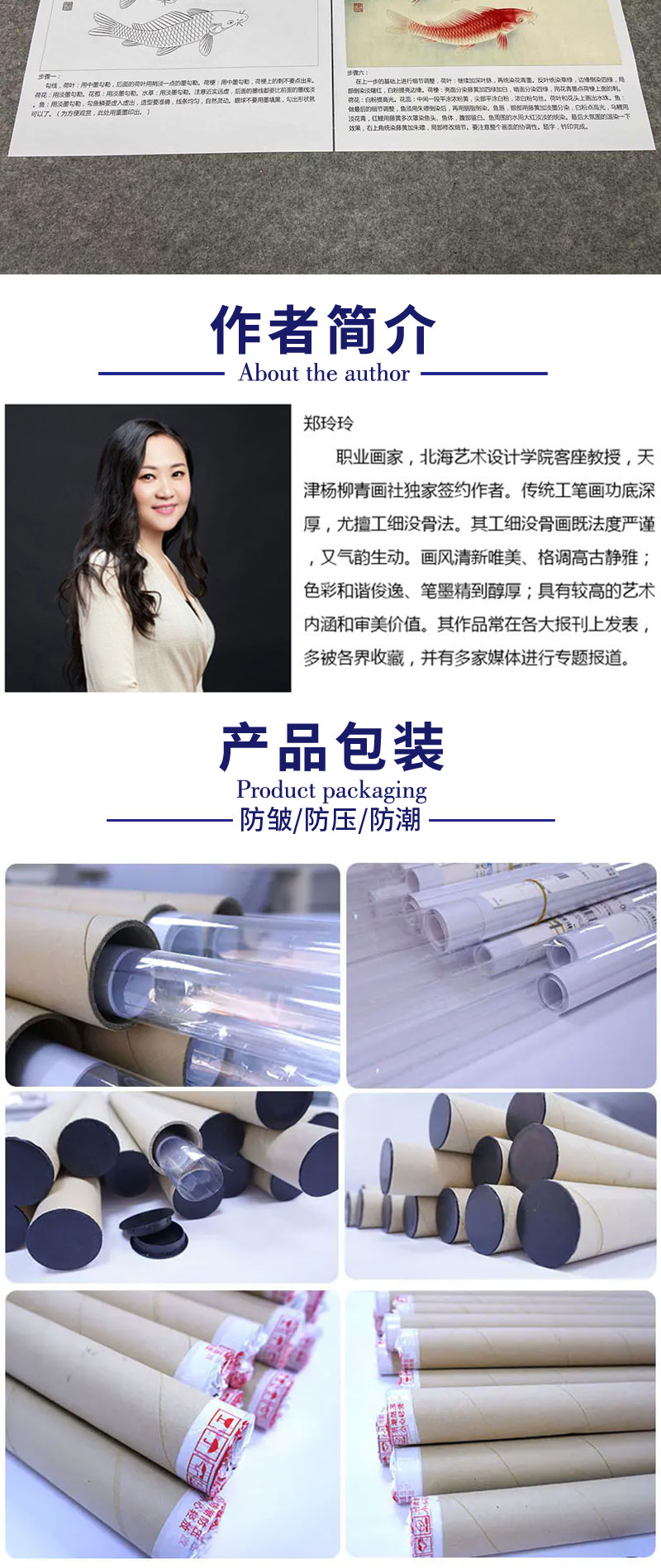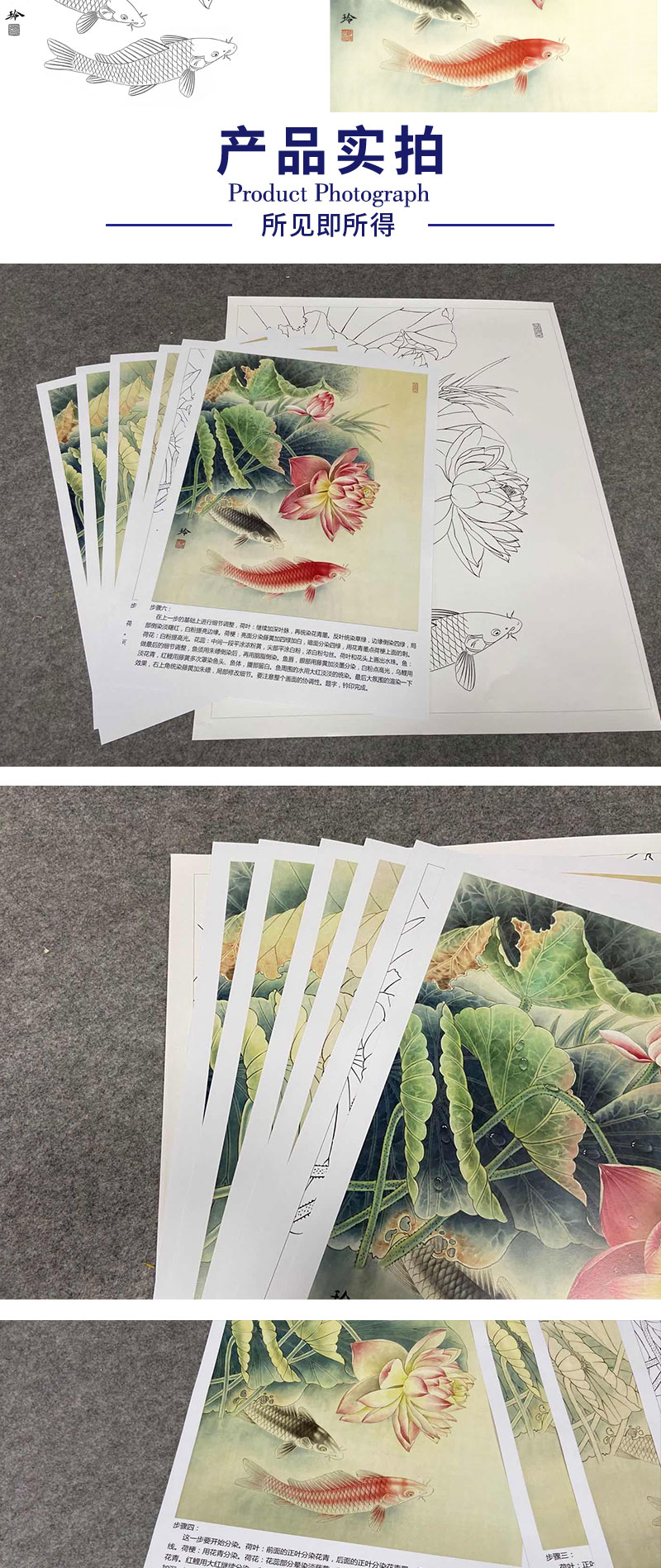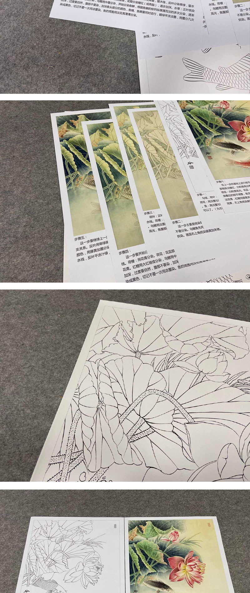 【有步骤、大彩图】郑玲玲工笔画白描底稿《双鲤碧波满塘春》荷花鲤鱼初学者临摹花鸟线稿ZL07