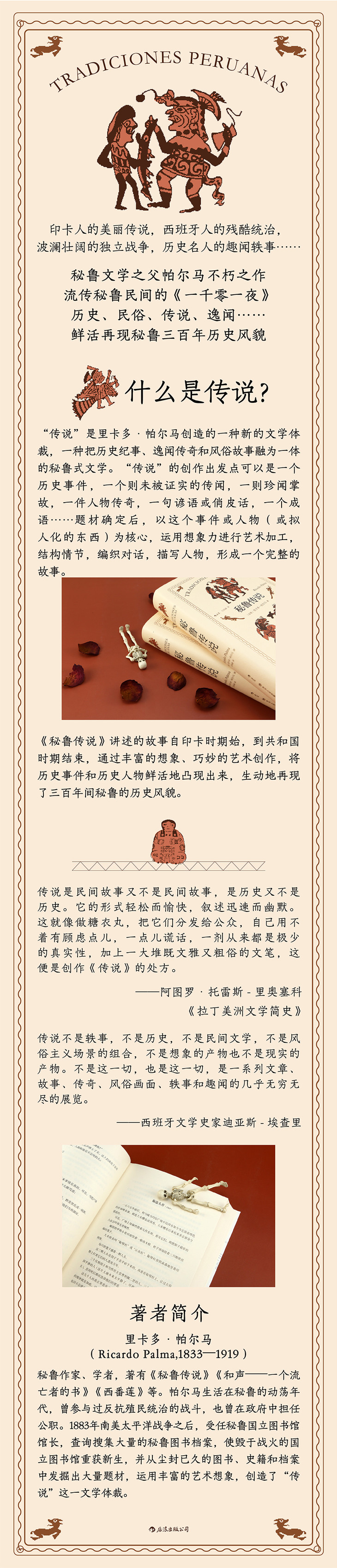 《秘鲁传说》是秘鲁作家里卡多·帕尔马的代表作品,“传说”是里卡多·帕尔马创造的一种新的文学体裁,一种把历史纪事、逸闻传奇和风俗故事融为一体的秘鲁式文学。书中讲述的故事自印卡时期始,到共和国时期结束,通过丰富的想象、巧妙的艺术创作,将历史事件和历史人物鲜活地凸现出来,生动地再现了三百年间秘鲁的历史风貌。