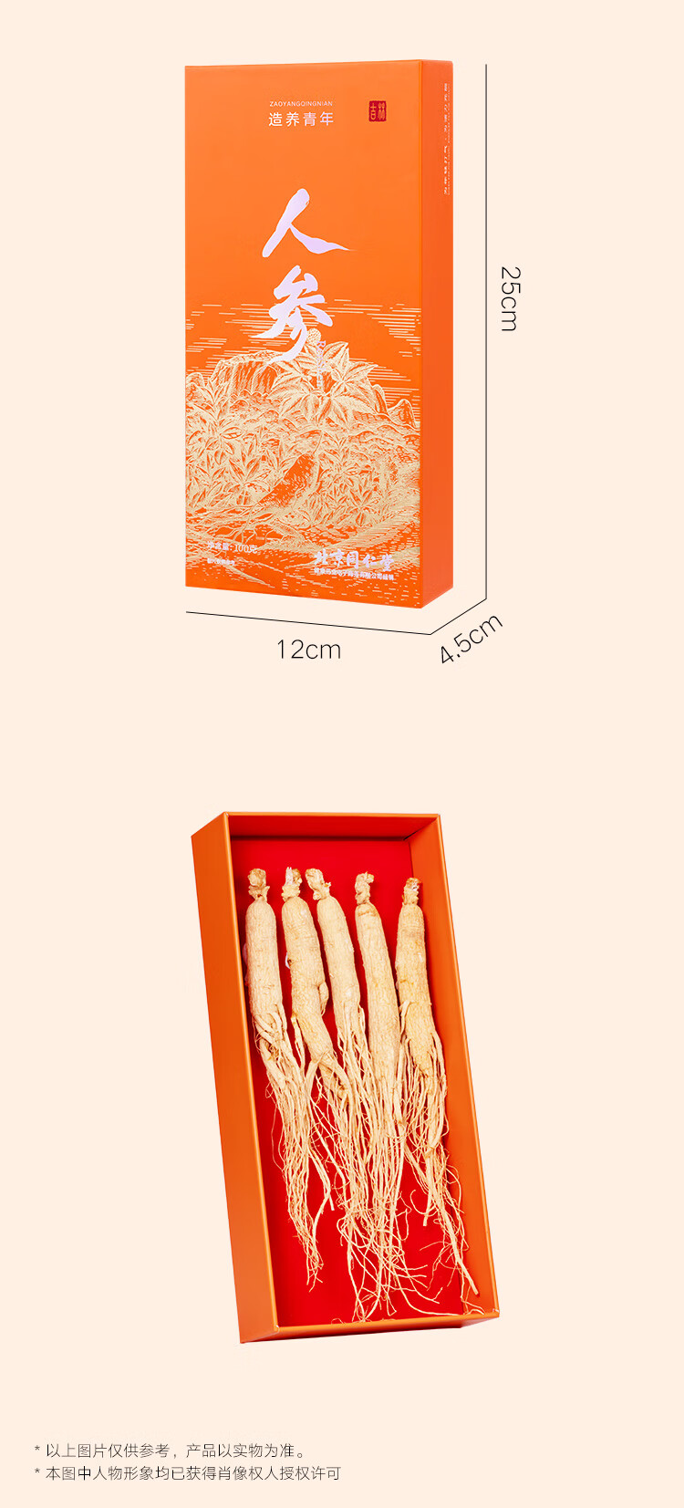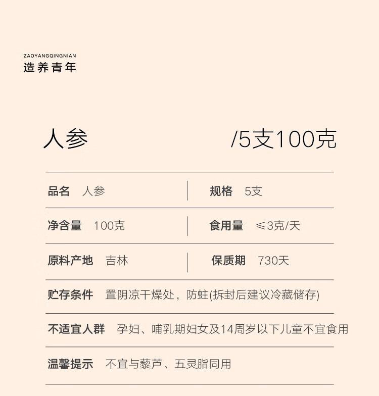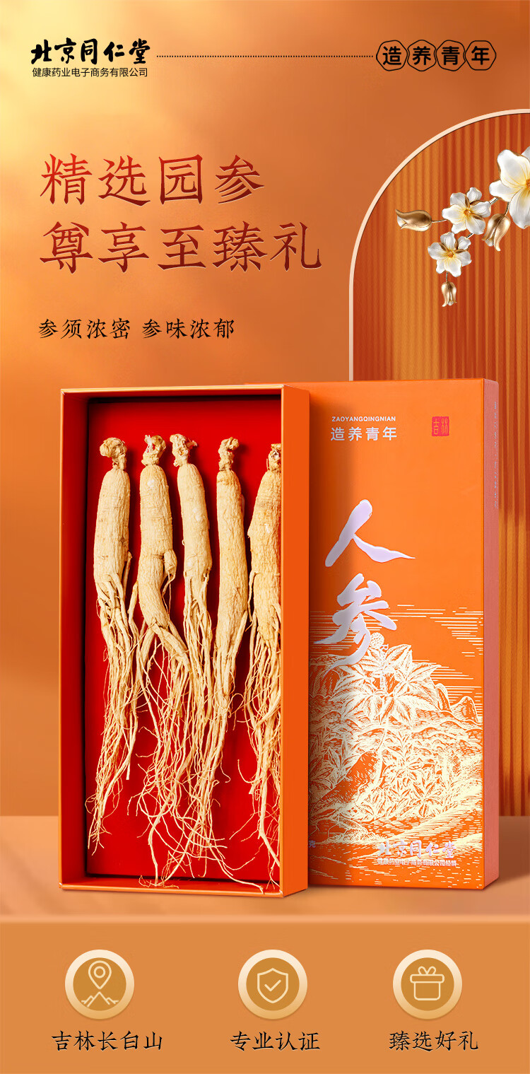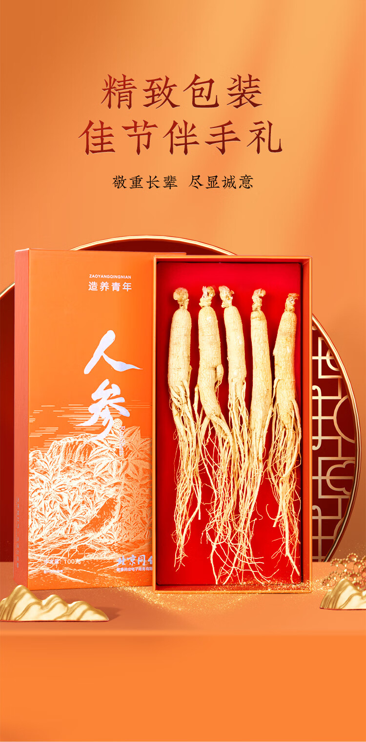 北京同仁堂 造养青年人参5支 100克 礼盒装 园参 源自长白山 参须浓密 参味浓郁SY