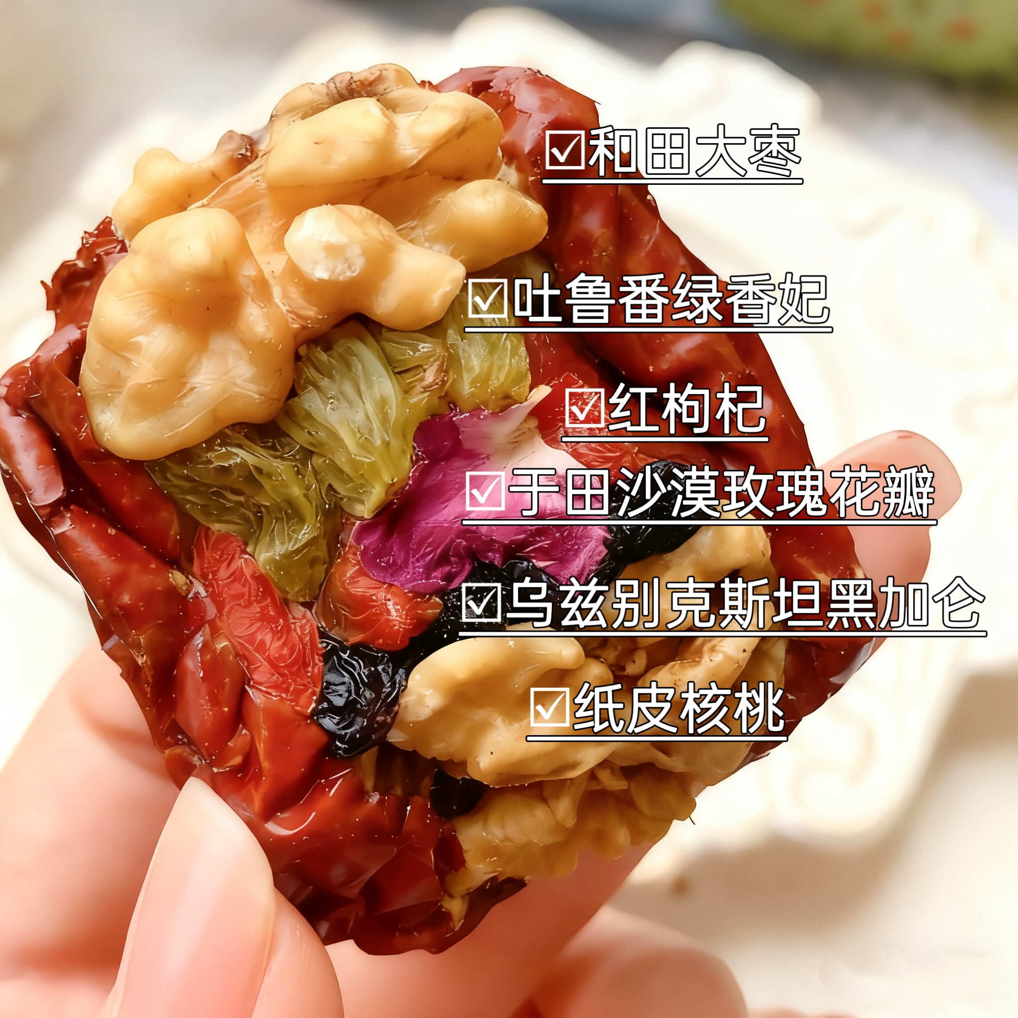 【配料】: 红枣、核桃仁、葡萄干、枸杞、重瓣红玫瑰