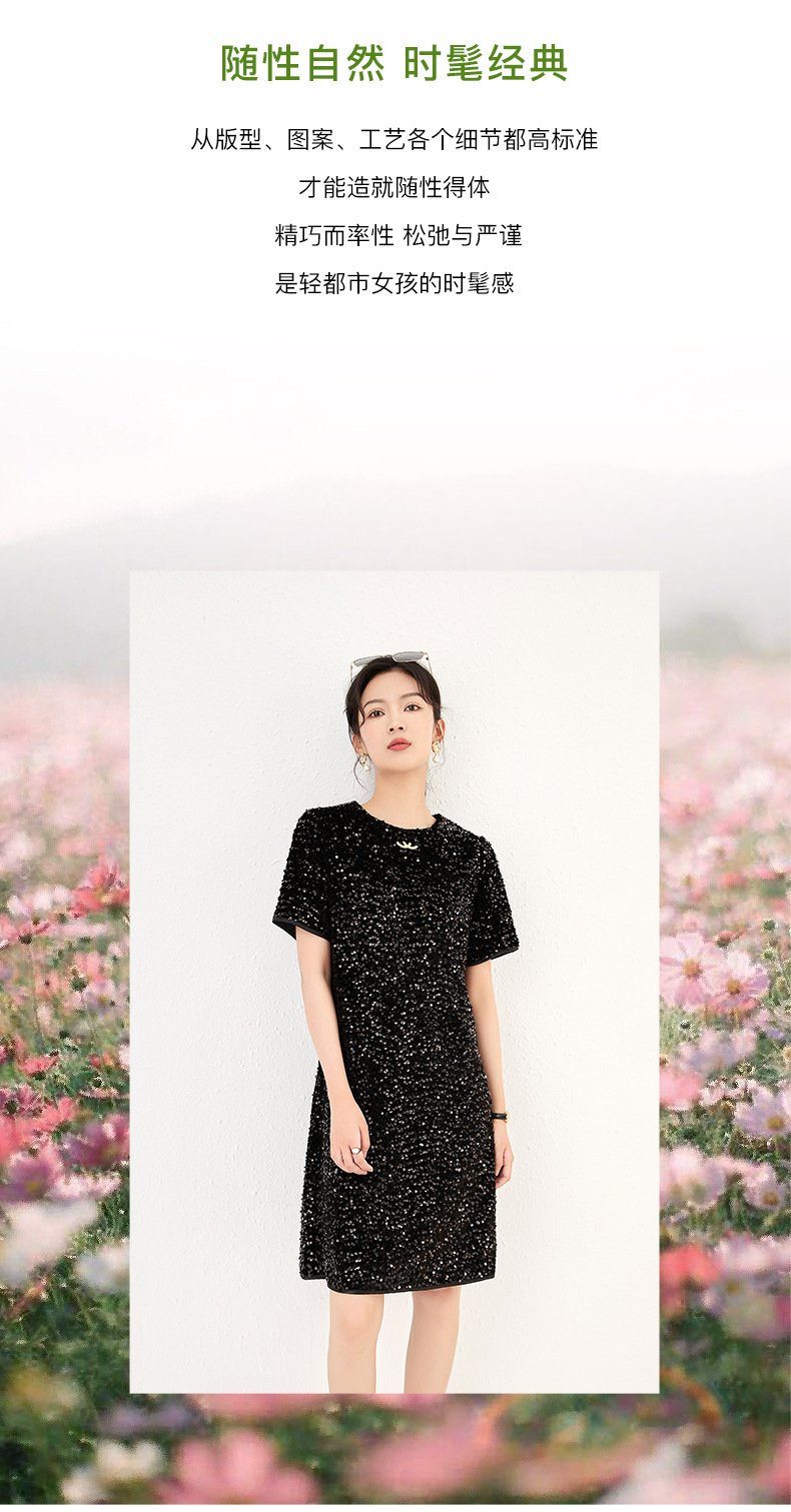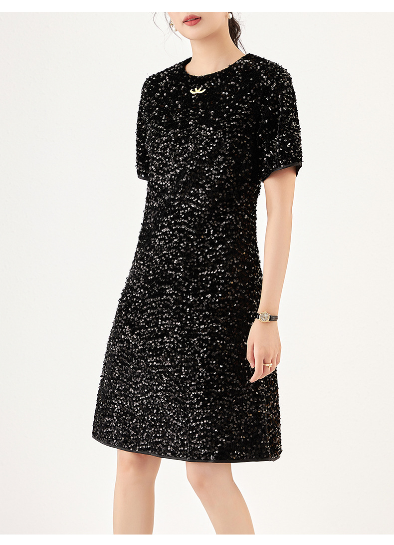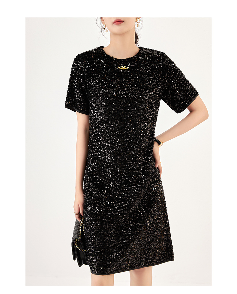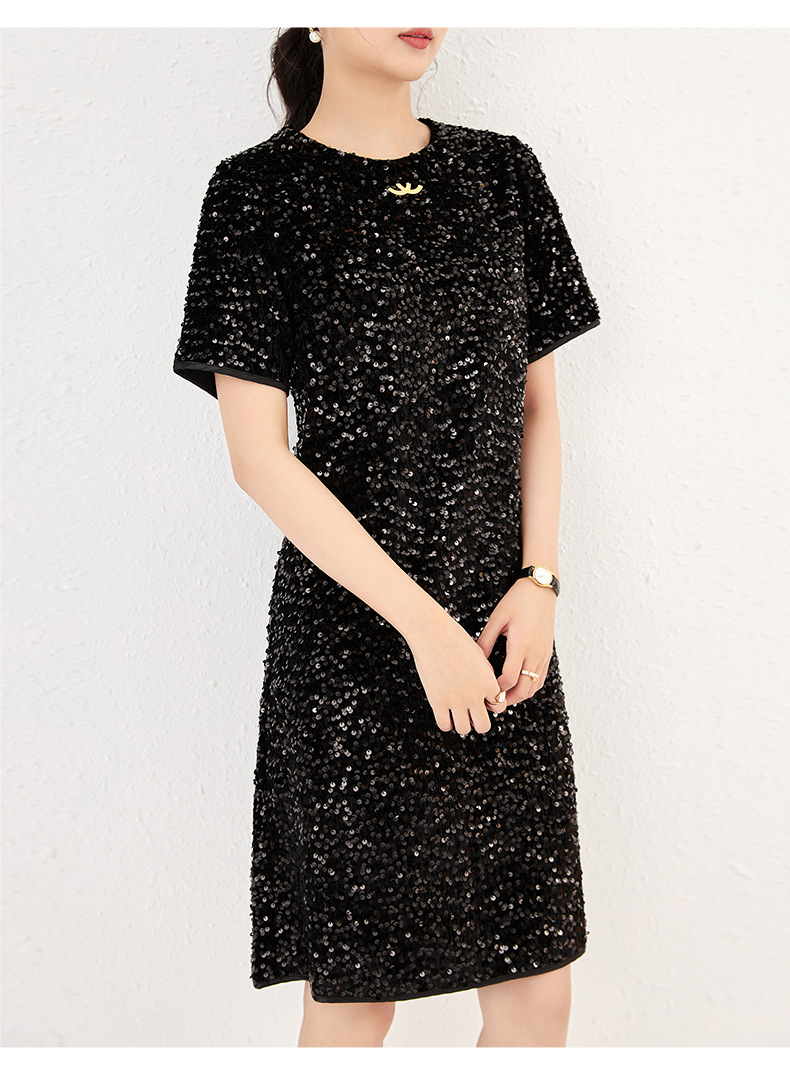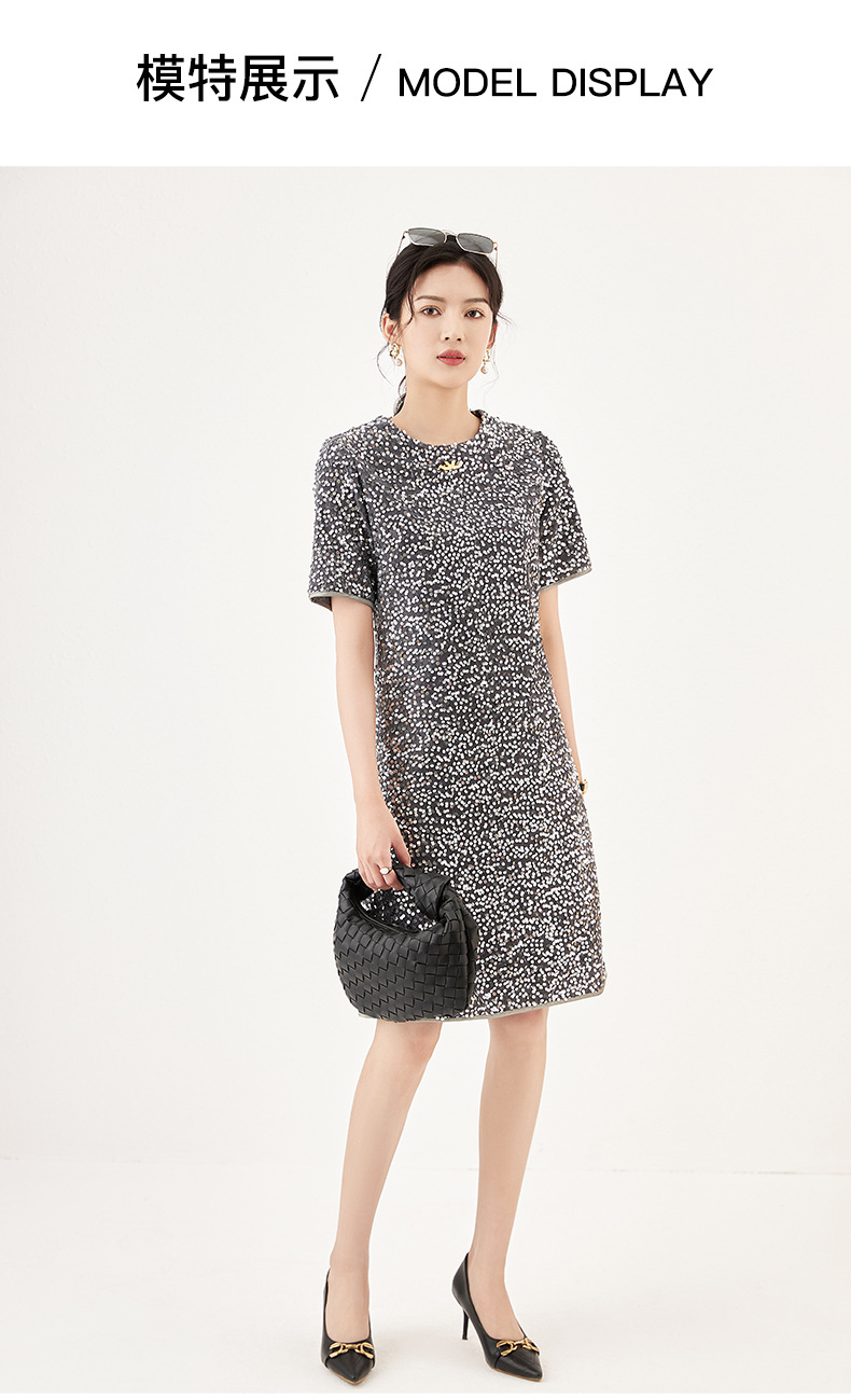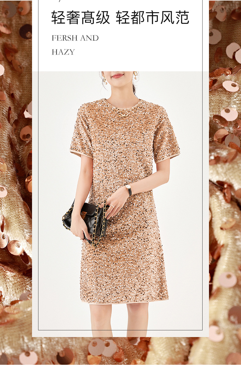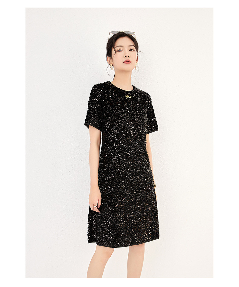 宽松显瘦,重工圆领净色丝绒亮片连衣裙WLZD-2307305