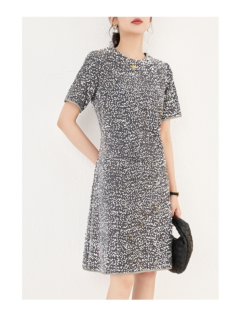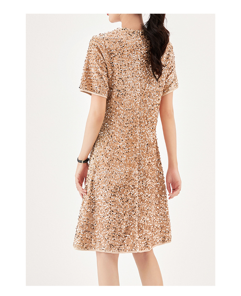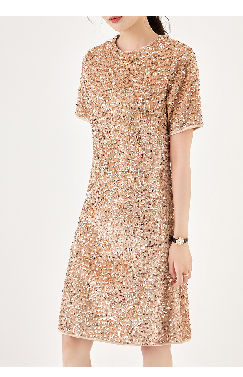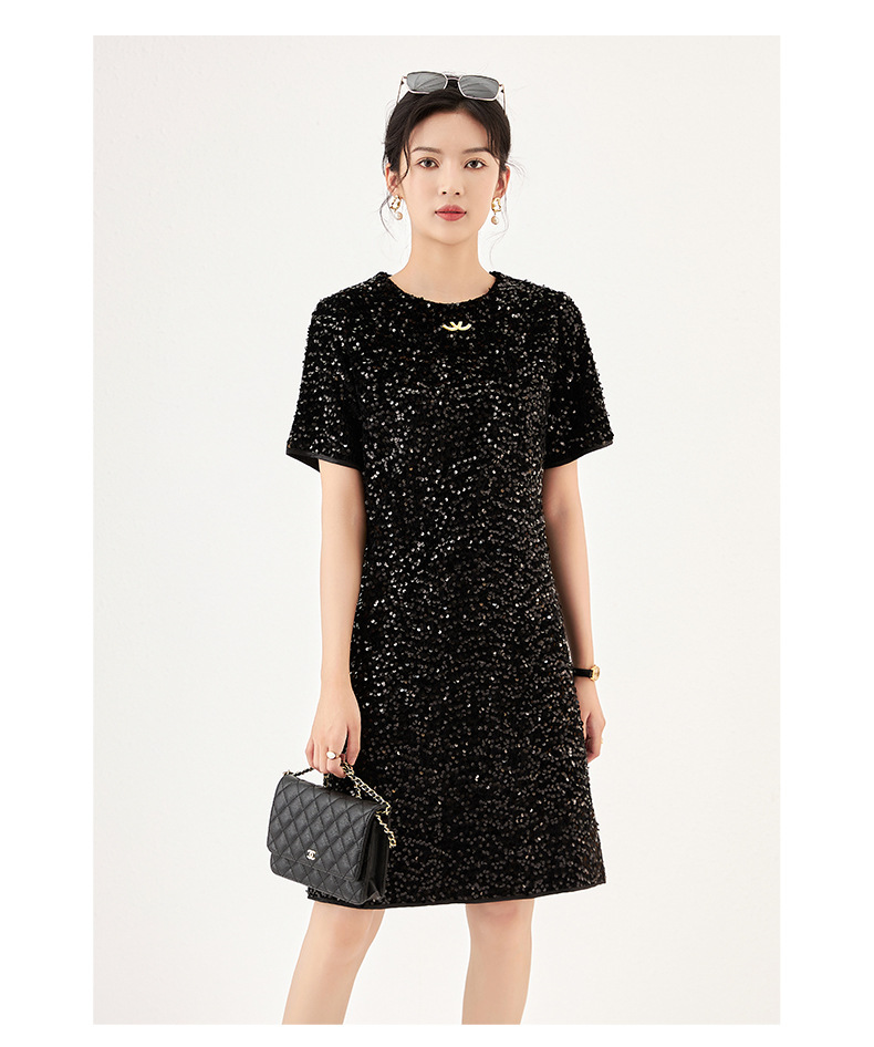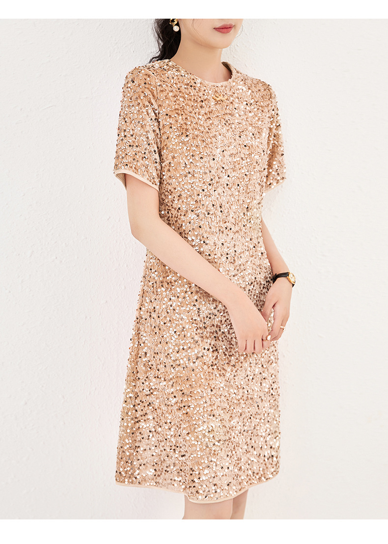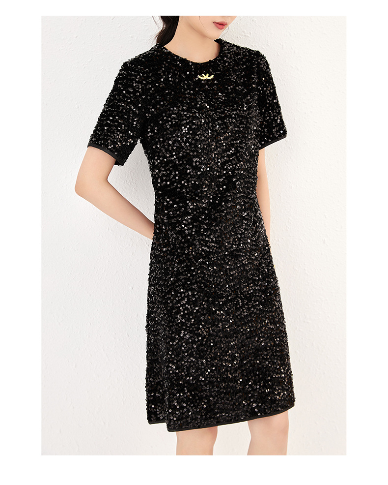 宽松显瘦,重工圆领净色丝绒亮片连衣裙WLZD-2307305