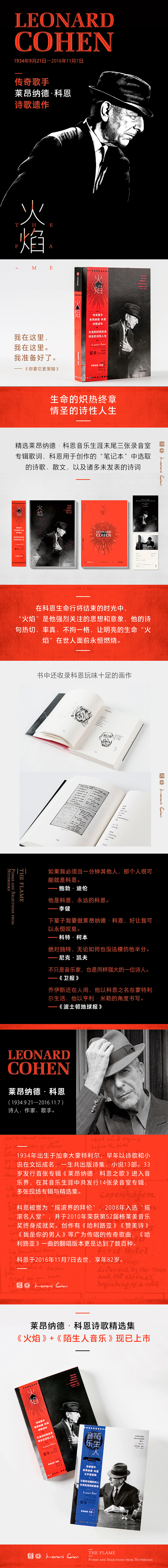 《火焰》是作家、诗人、歌手莱昂纳德•科恩的遗作。本书由莱昂纳德•科恩之子亚当•科恩作序,由作家欧阳昱翻译,收录了科恩音乐生涯末尾三张录音室专辑《旧想法》《大众的问题》《你要它更黑暗》歌词,为安嘉妮的专辑《蓝色警报》撰写的歌词,与科恩用于创作的《笔记本》中选取的散文、画作,以及诸多未发表的诗词。