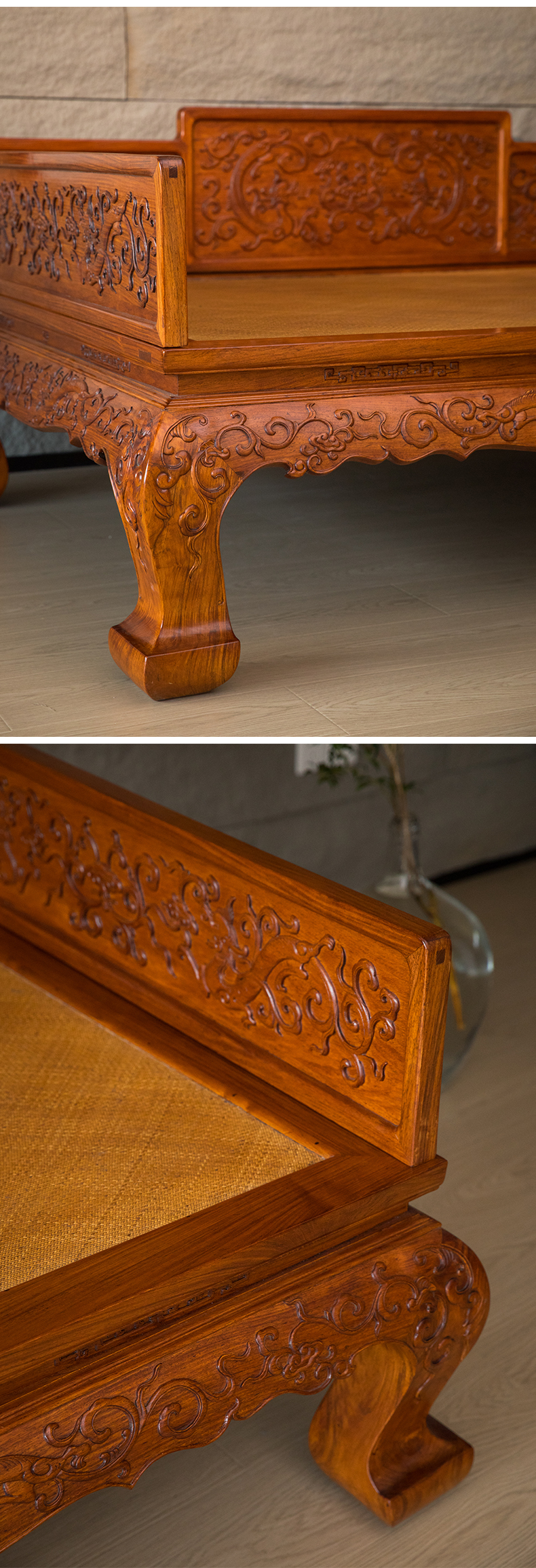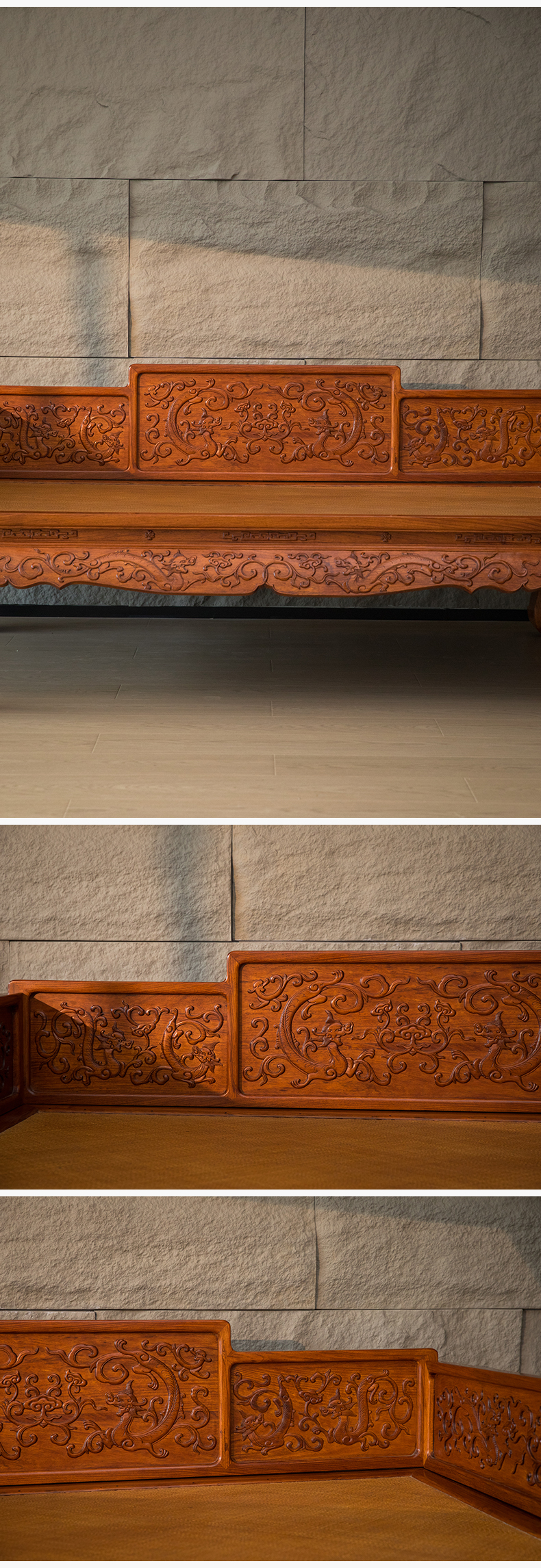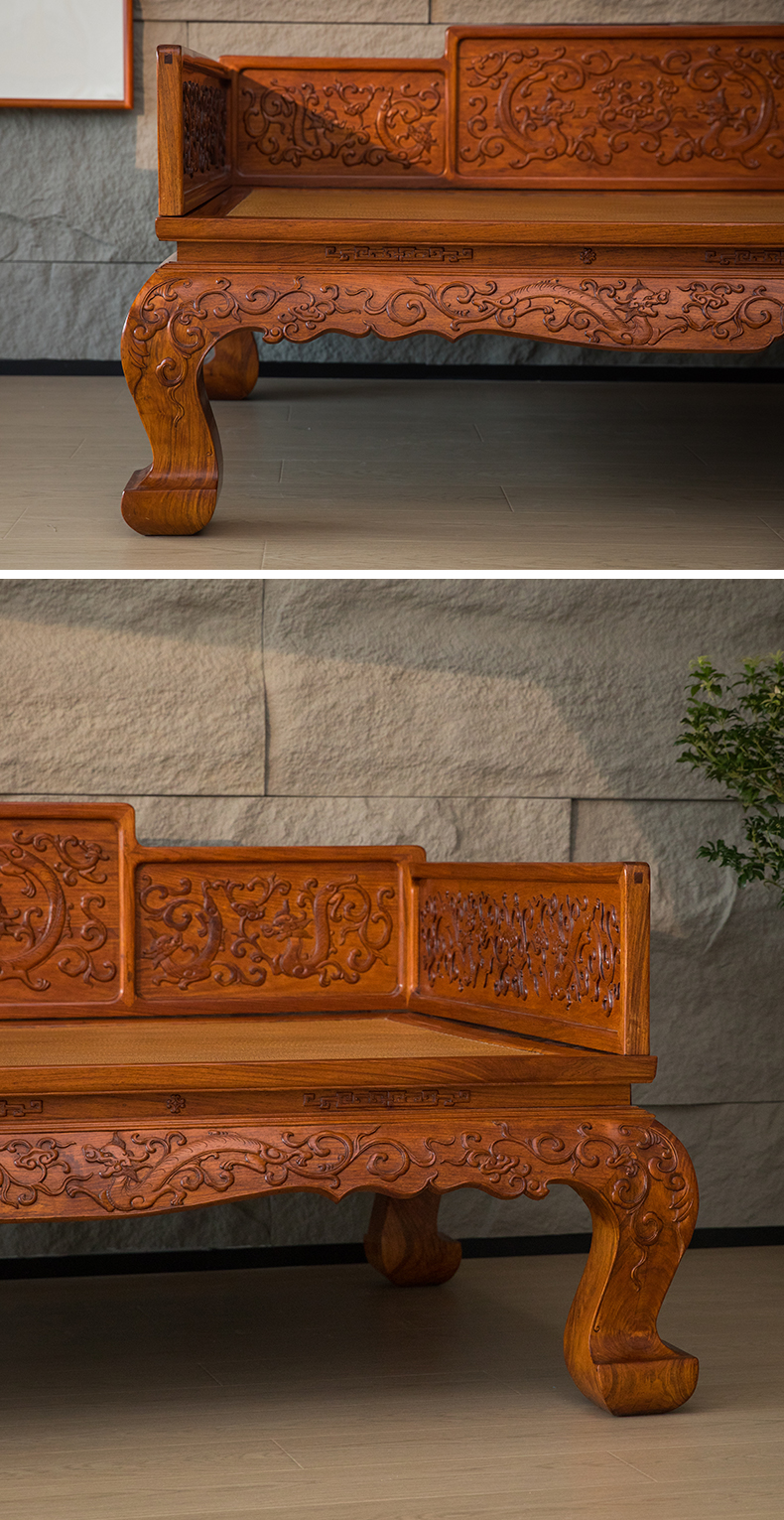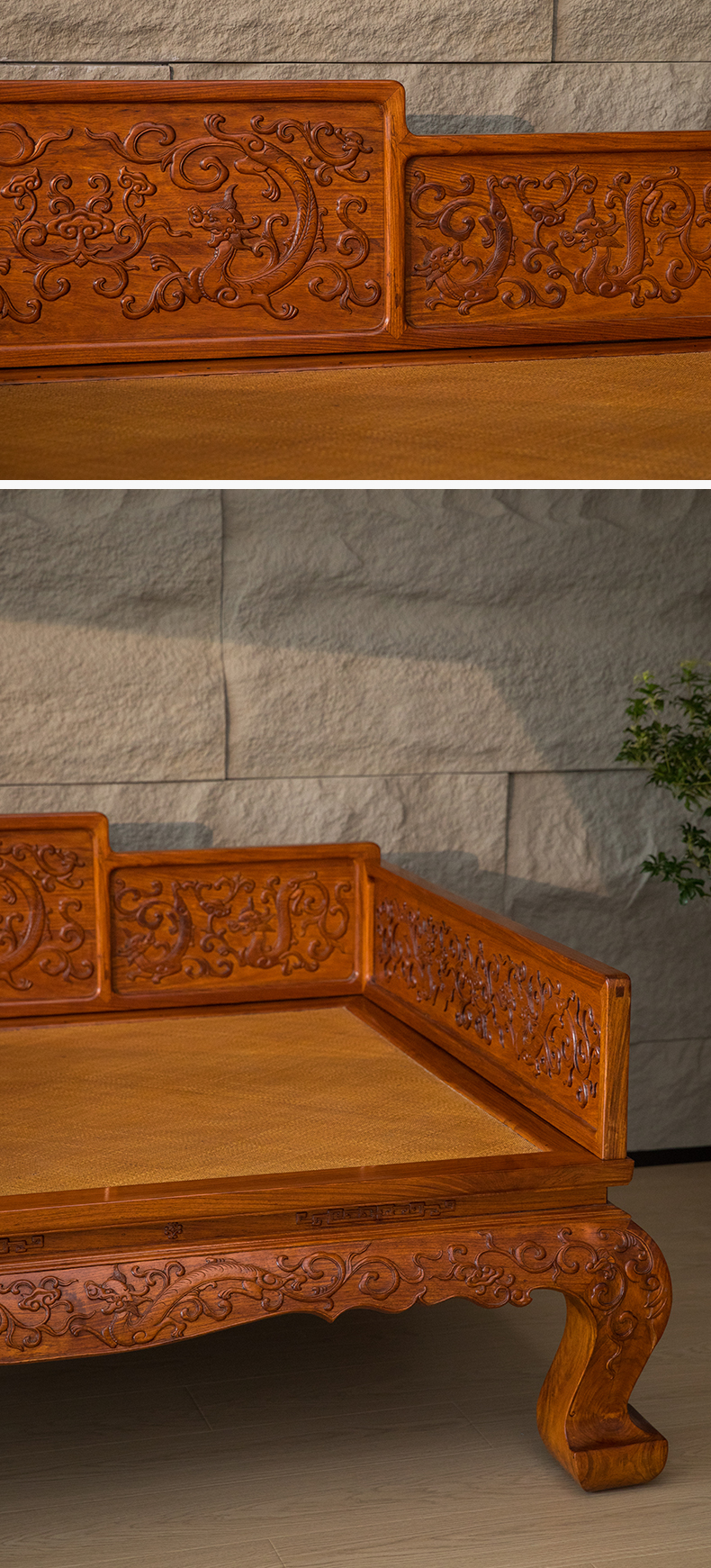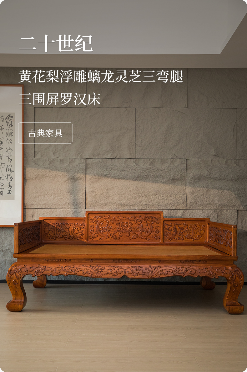二十世纪 黄花梨浮雕螭龙灵芝三弯腿三围屏罗汉床