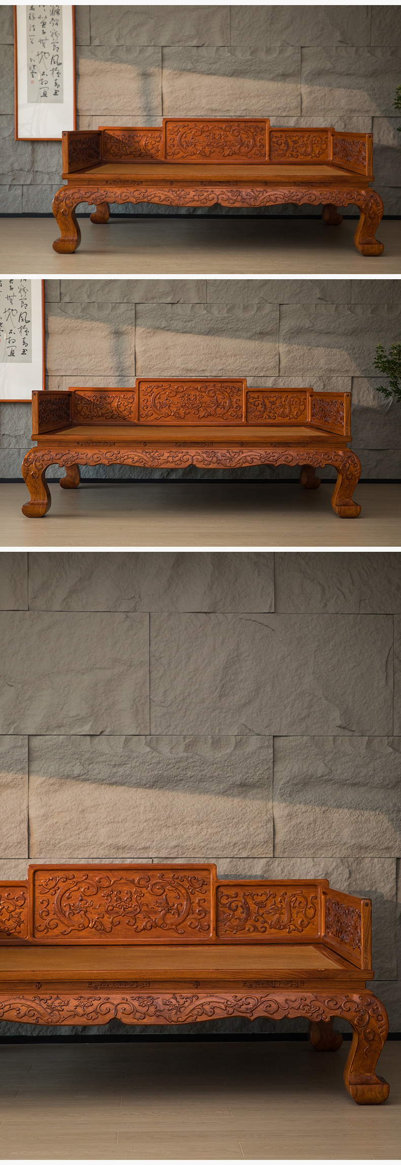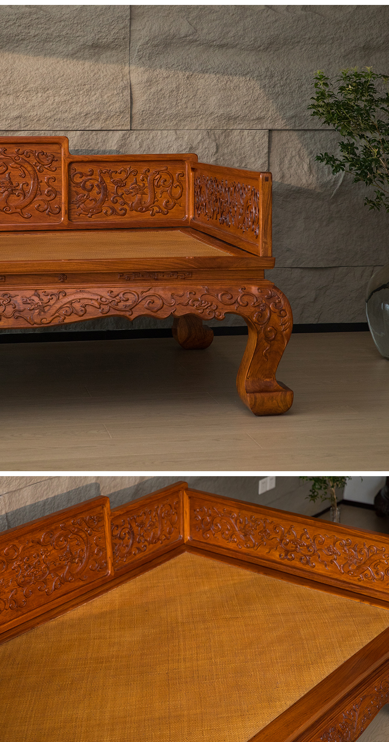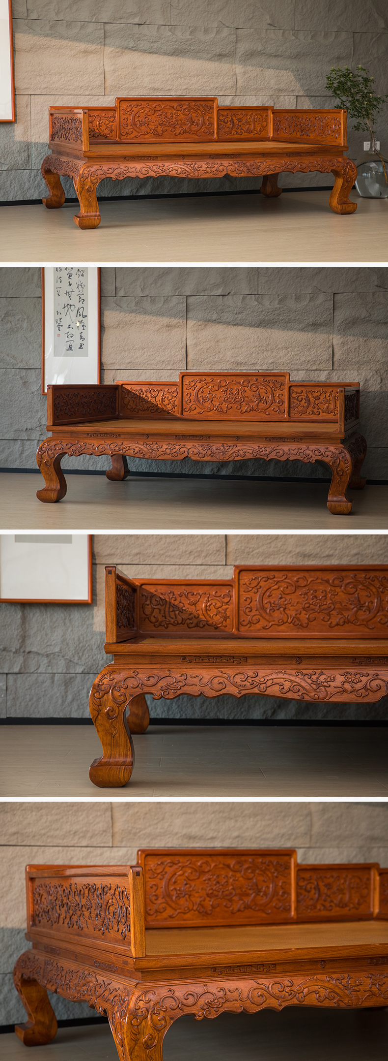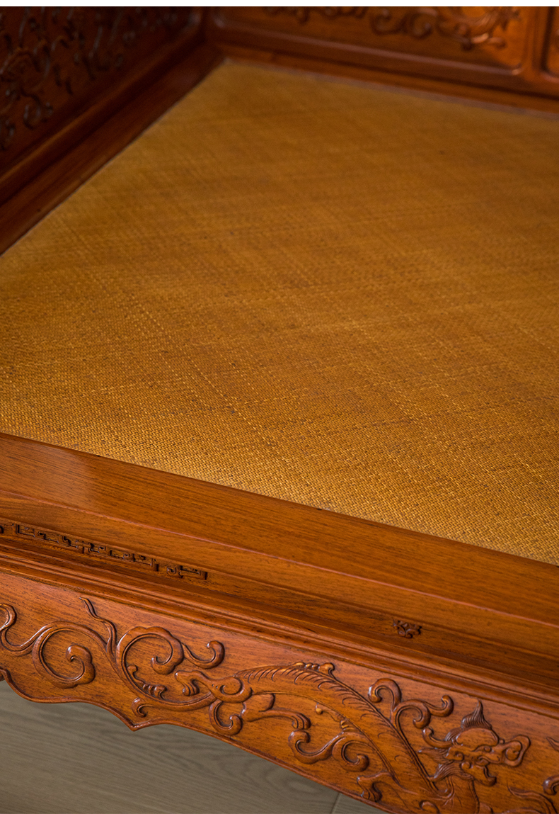 二十世纪 黄花梨浮雕螭龙灵芝三弯腿三围屏罗汉床