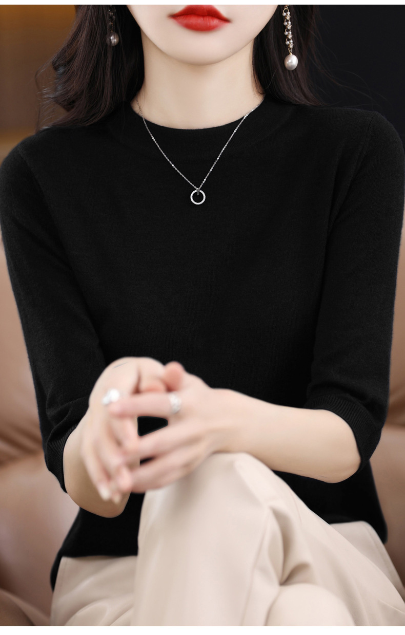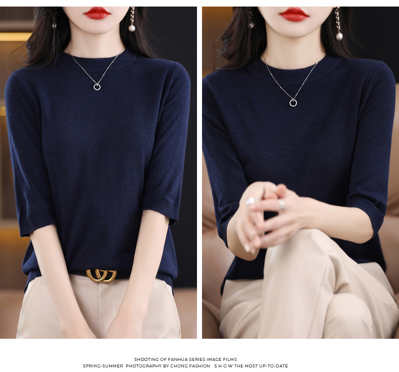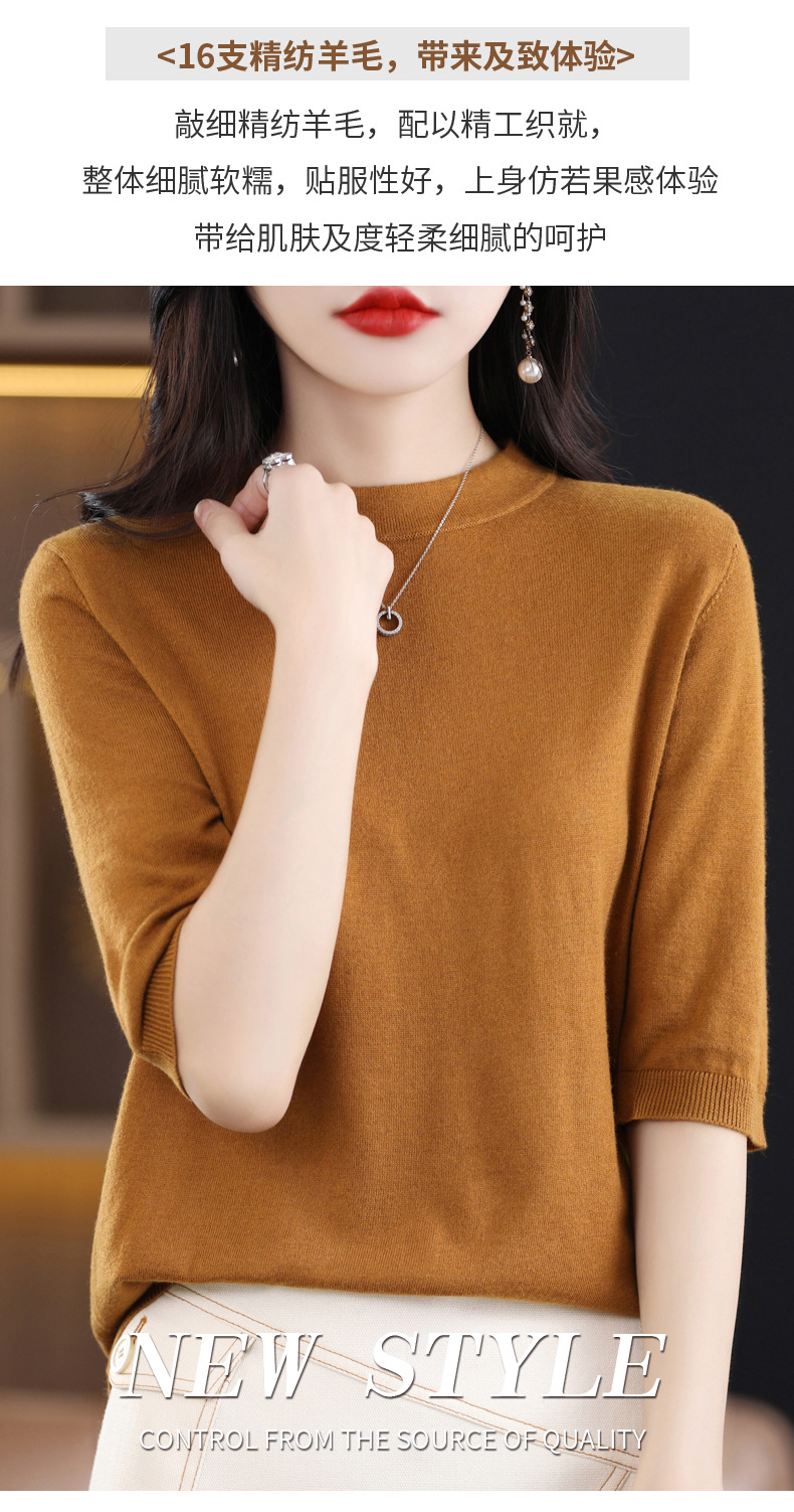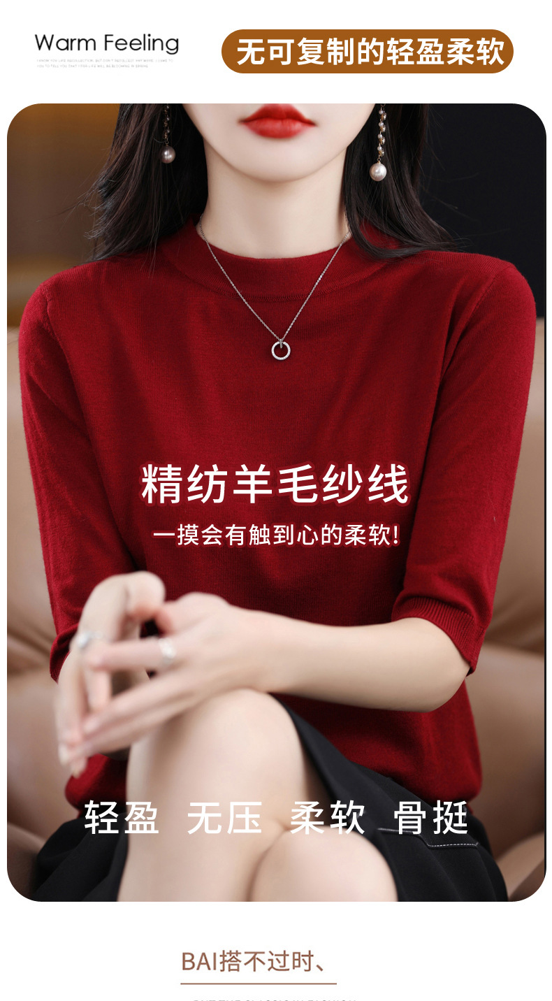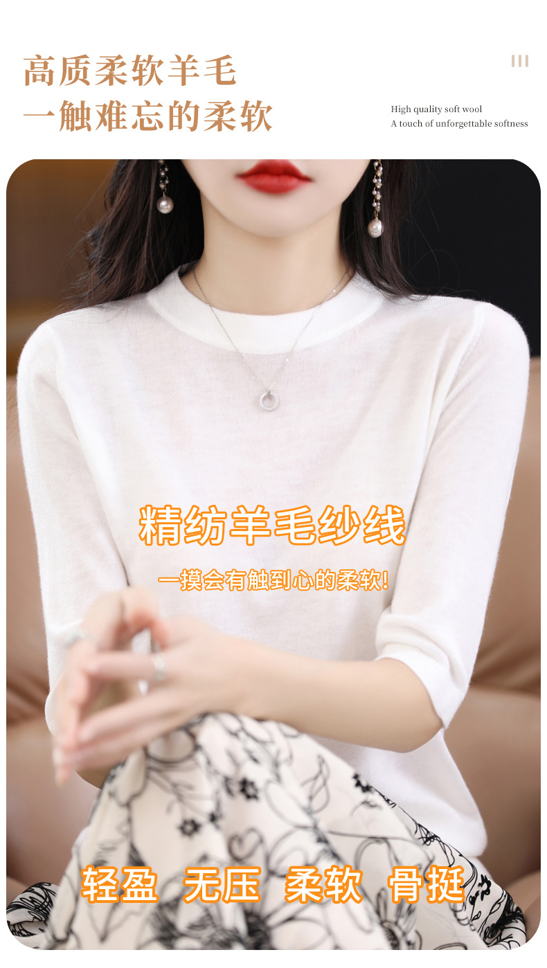 QHJY-202311春款半袖精纺羊毛衫宽松打底衫五分袖针织衫中袖薄款毛衣